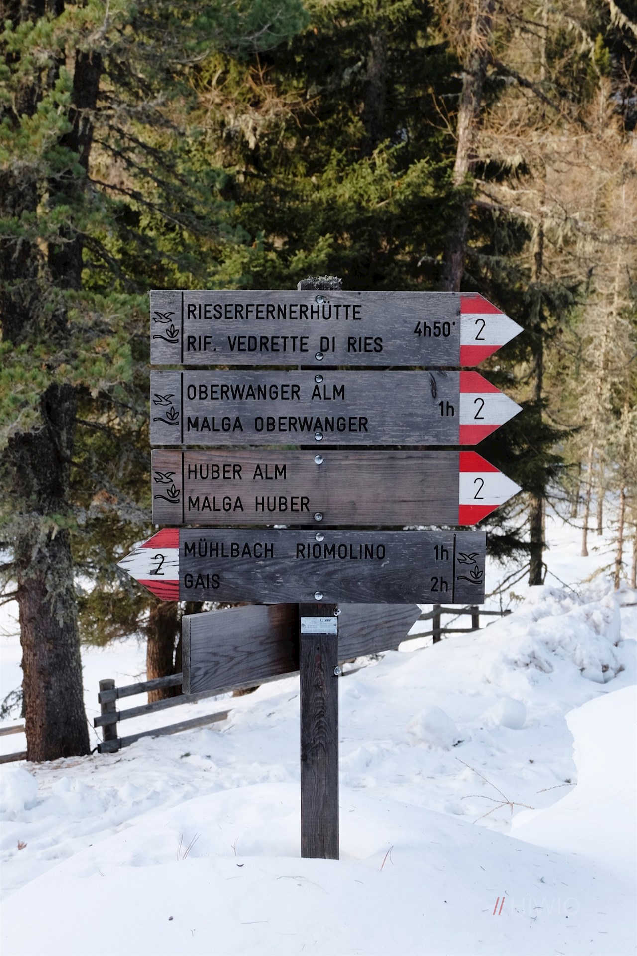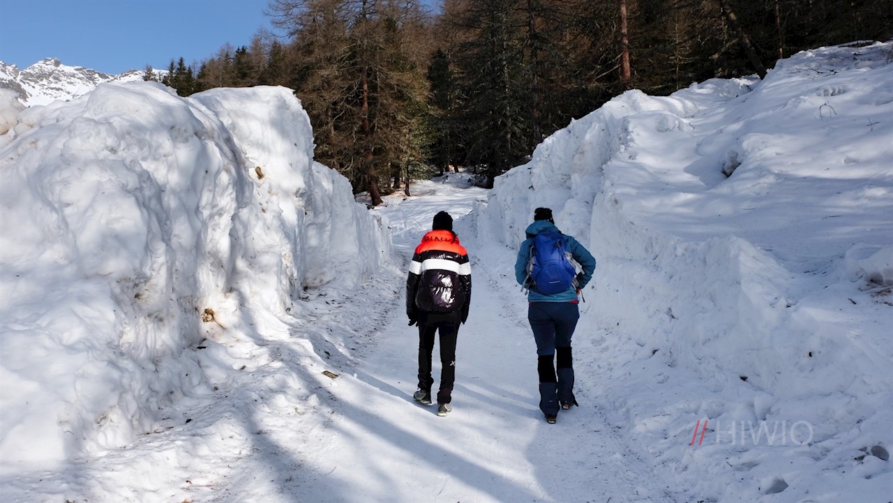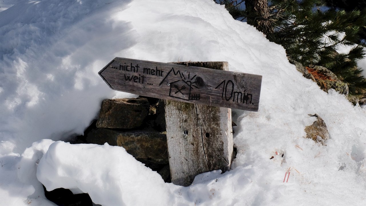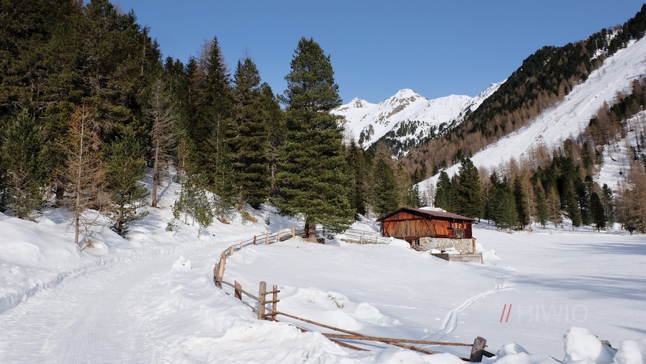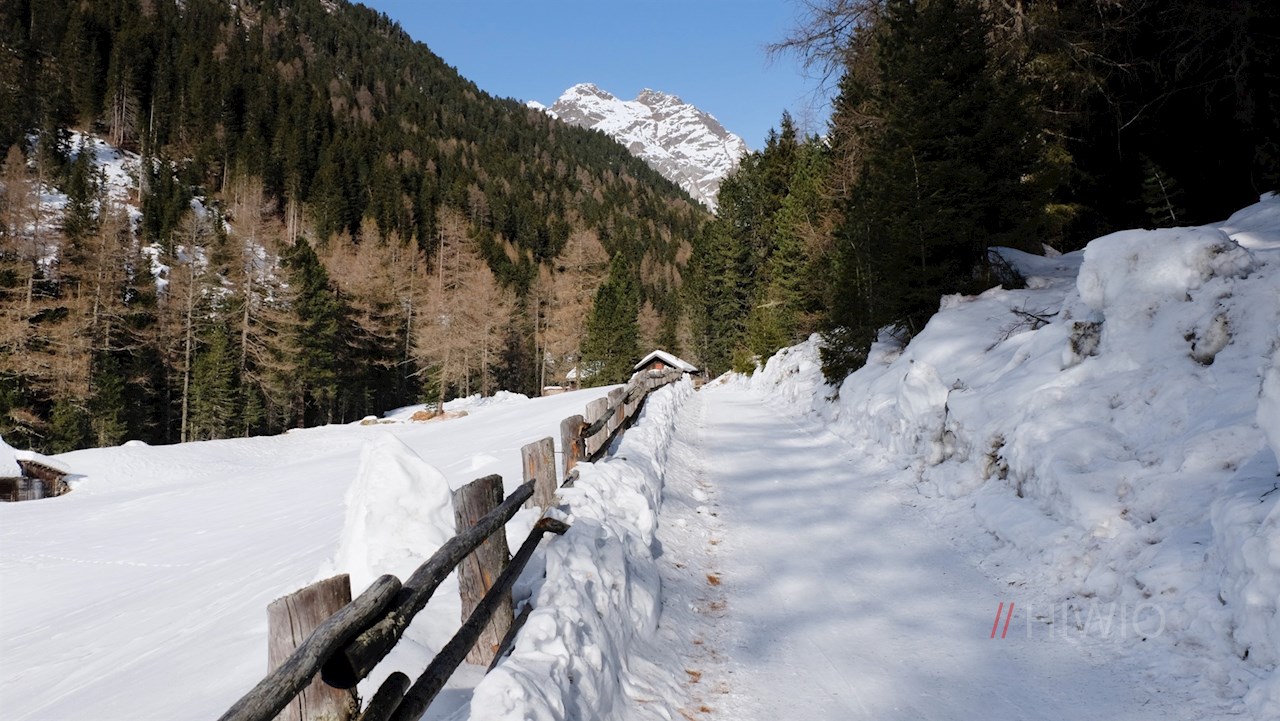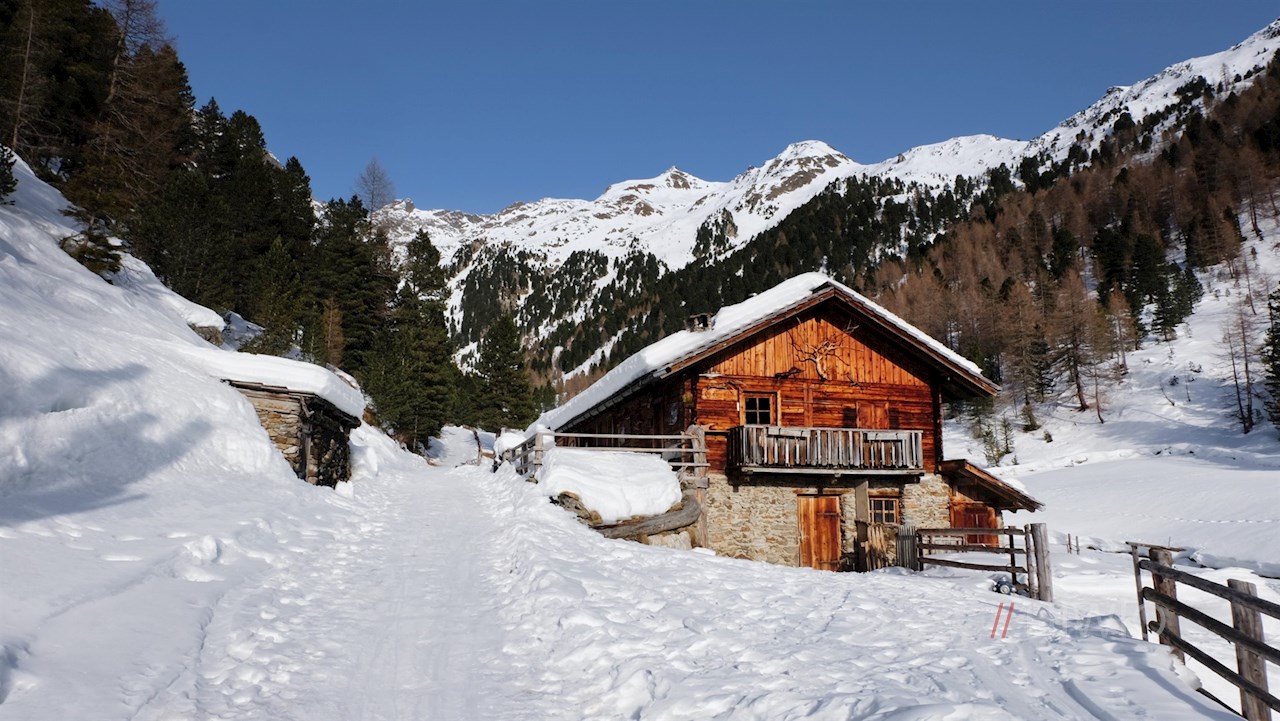 Der Beschilderung Nr. 2 in Richtung Huber Alm folgend, führt der gebahnte Winterwanderweg im angenehmen Anstieg durch das beschauliche, von schneebedeckten Bäumen und Almwiesen geprägte Mühlbachtal. Unterwegs kommt man nicht nur am geschichtsträchtigen Berggasthof Mühlbacher Badl vorbei, sondern erfährt auch allerlei Wissenswertes über dieses sonnenverwöhnte Seitental des Tauferer Tals, in dem schon früh Ackerbau und Viehzucht betrieben wurden.