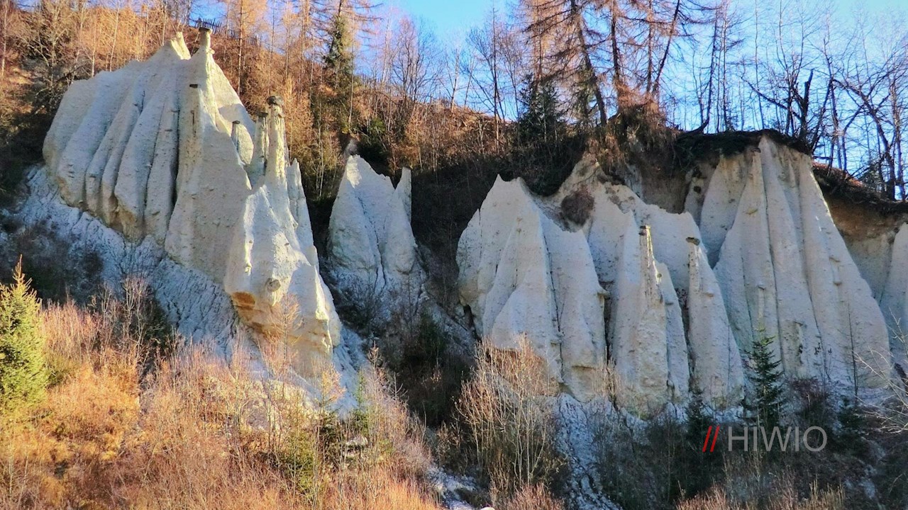 Das Material, aus dem die bizarren Pfeiler bestehen, stammt übrigens aus Moränenablagerungen der letzten Eiszeit. Ihre nahezu weiße Farbe rührt daher, dass diese eiszeitlichen Ablagerungen vornehmlich granitischen Ursprungs waren.