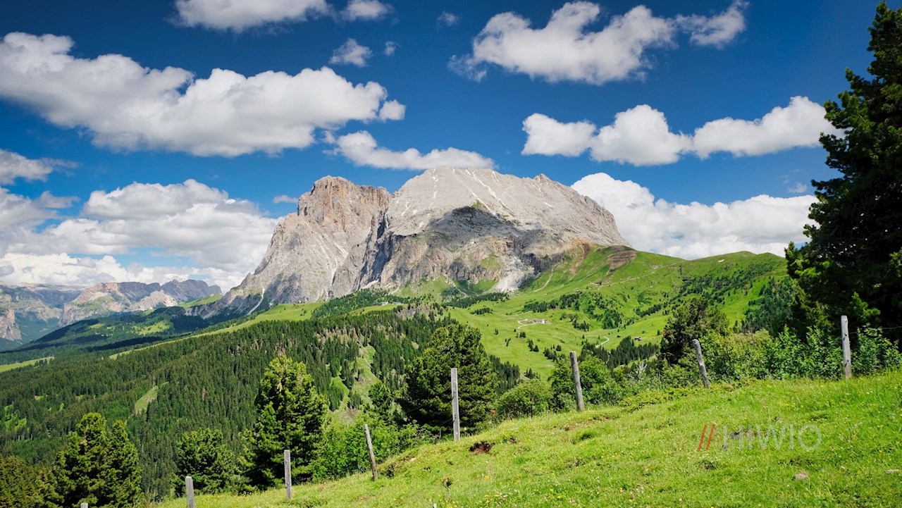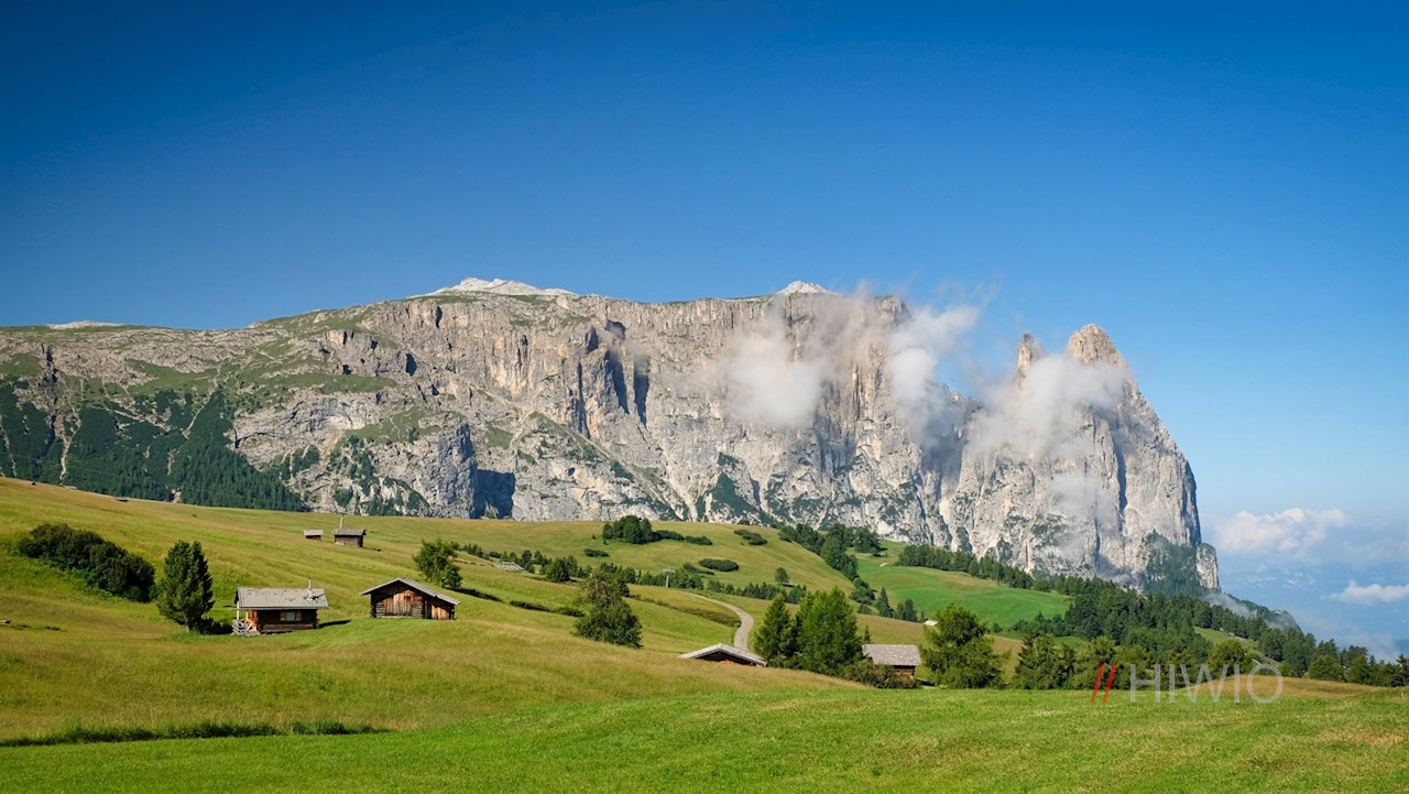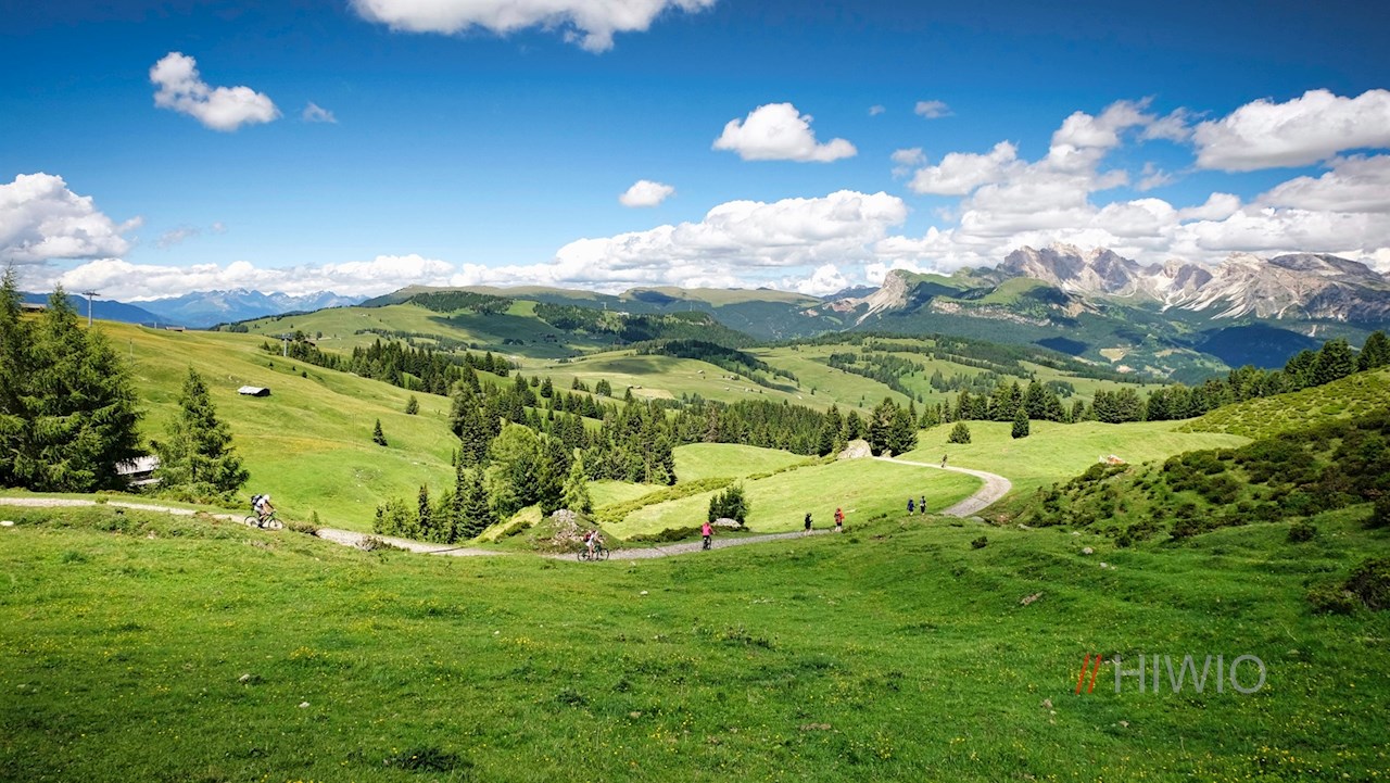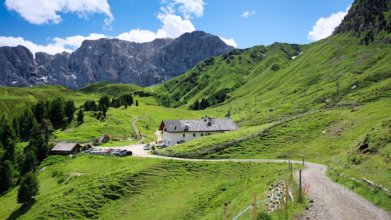 Am Ausgang der Bergstation ist der Weg zur Mahlknechthütte bereits ausgeschildert. Er führt im angenehmen Anstieg durch die weiten, von einzelnen Bäumen und Scheunen bestandenen Almwiesen und öffnet dabei atemberaubende Ausblicke auf die majestätischen Felswände des Schlern und der Langkofelgruppe.