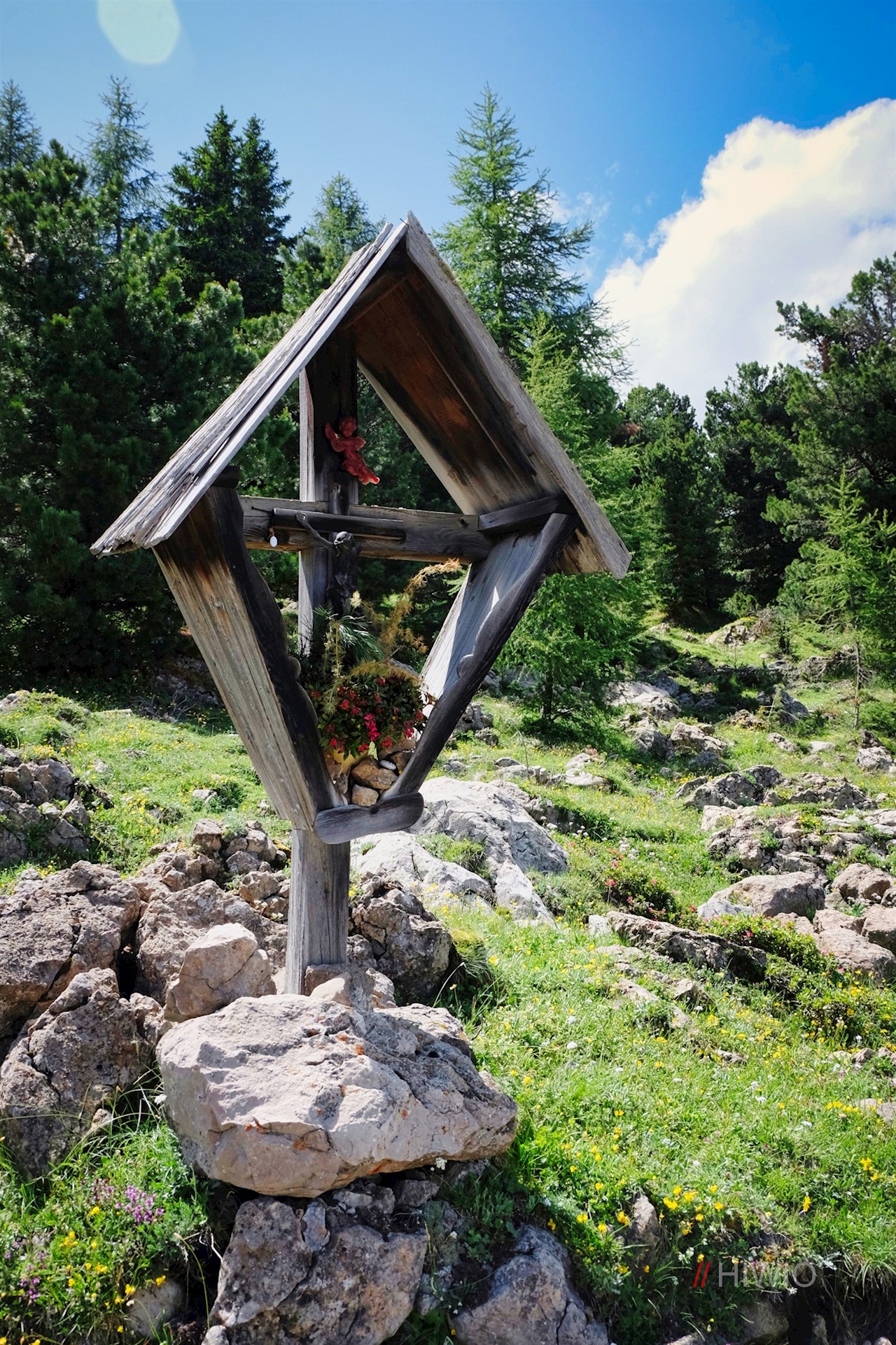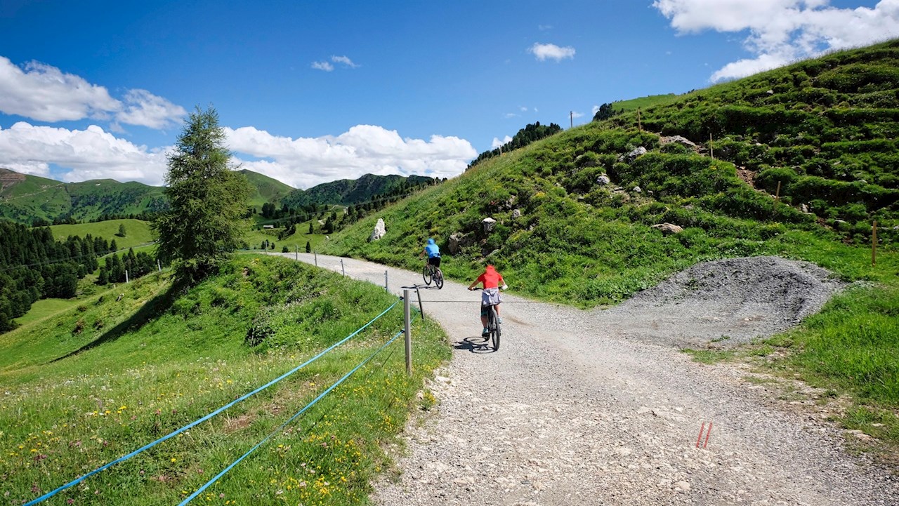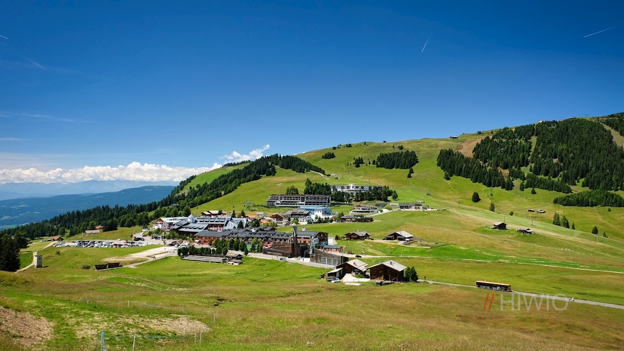 Am Ausgang der Bergstation ist der Weg zur Mahlknechthütte bereits ausgeschildert. Er führt im angenehmen Anstieg durch die weiten, von einzelnen Bäumen und Scheunen bestandenen Almwiesen und öffnet dabei atemberaubende Ausblicke auf die majestätischen Felswände des Schlern und der Langkofelgruppe.