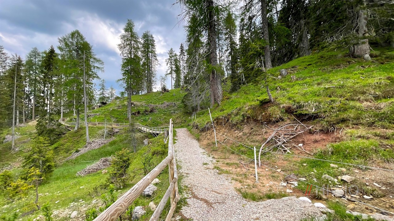 Oben angekommen folgt man zunächst dem Weg Nr. 517B in Richtung Latemarscharte, bis am linken Wegesrand ein Schild den kurzen Abstieg zur nunmehr nahen Malga Secine weist.