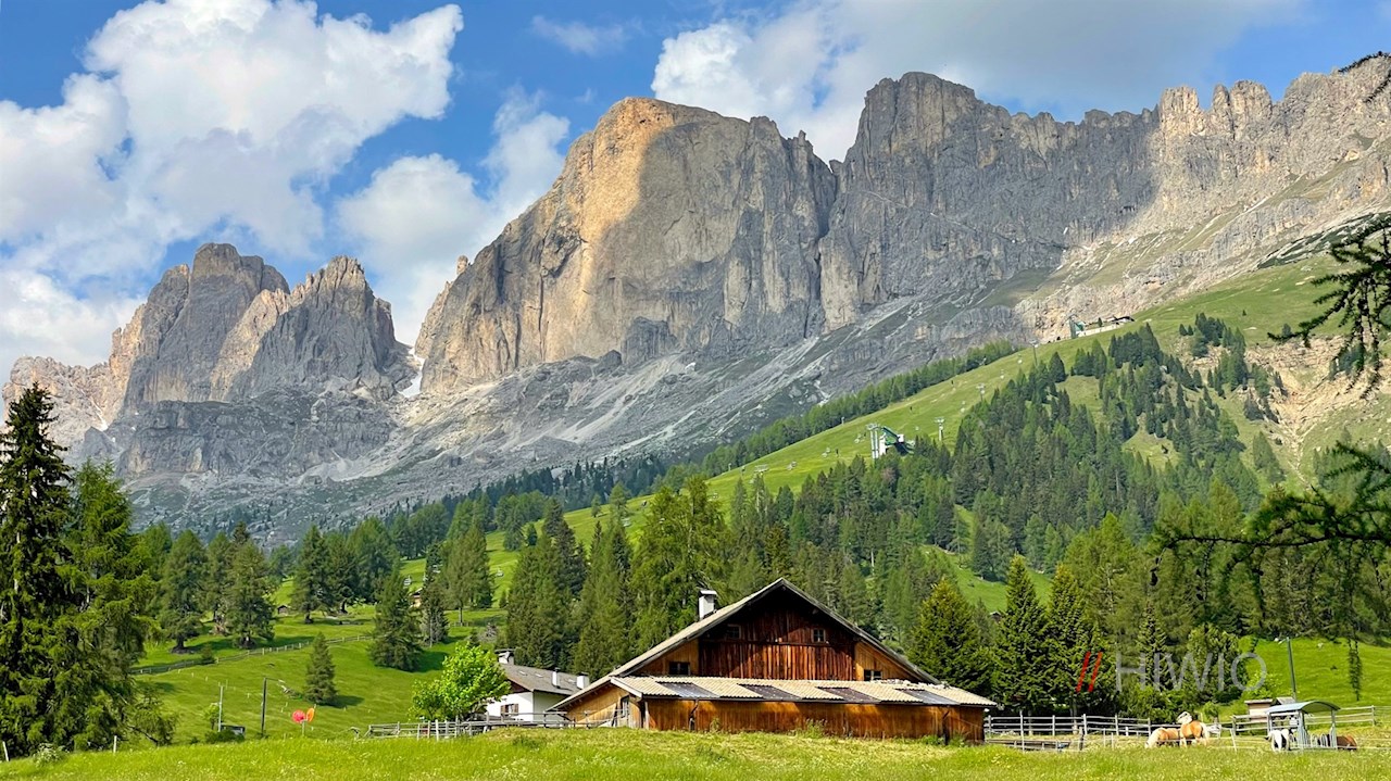 Zur Malga Secine unterhalb des Karerpasses führt eine schöne Wanderung vom Karersee. Unterwegs öffnen sich malerische Ausblicke auf den nahen Rosengarten, den Latemar und die Poppekanzel.