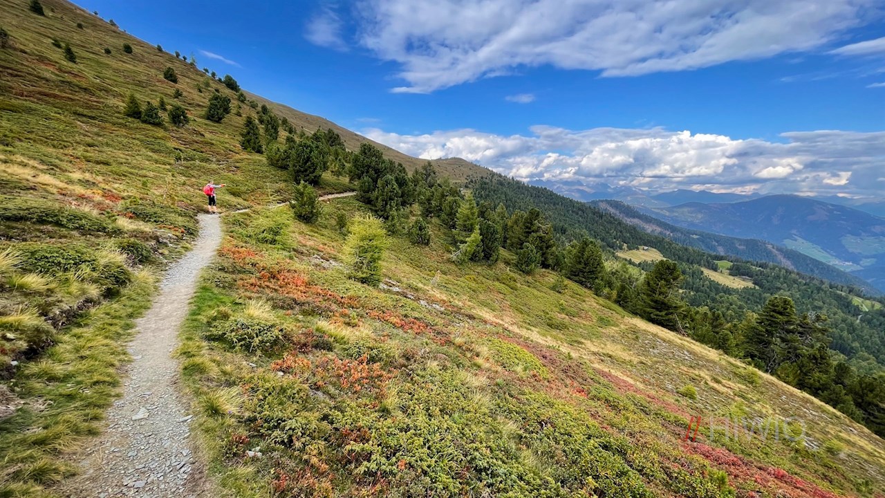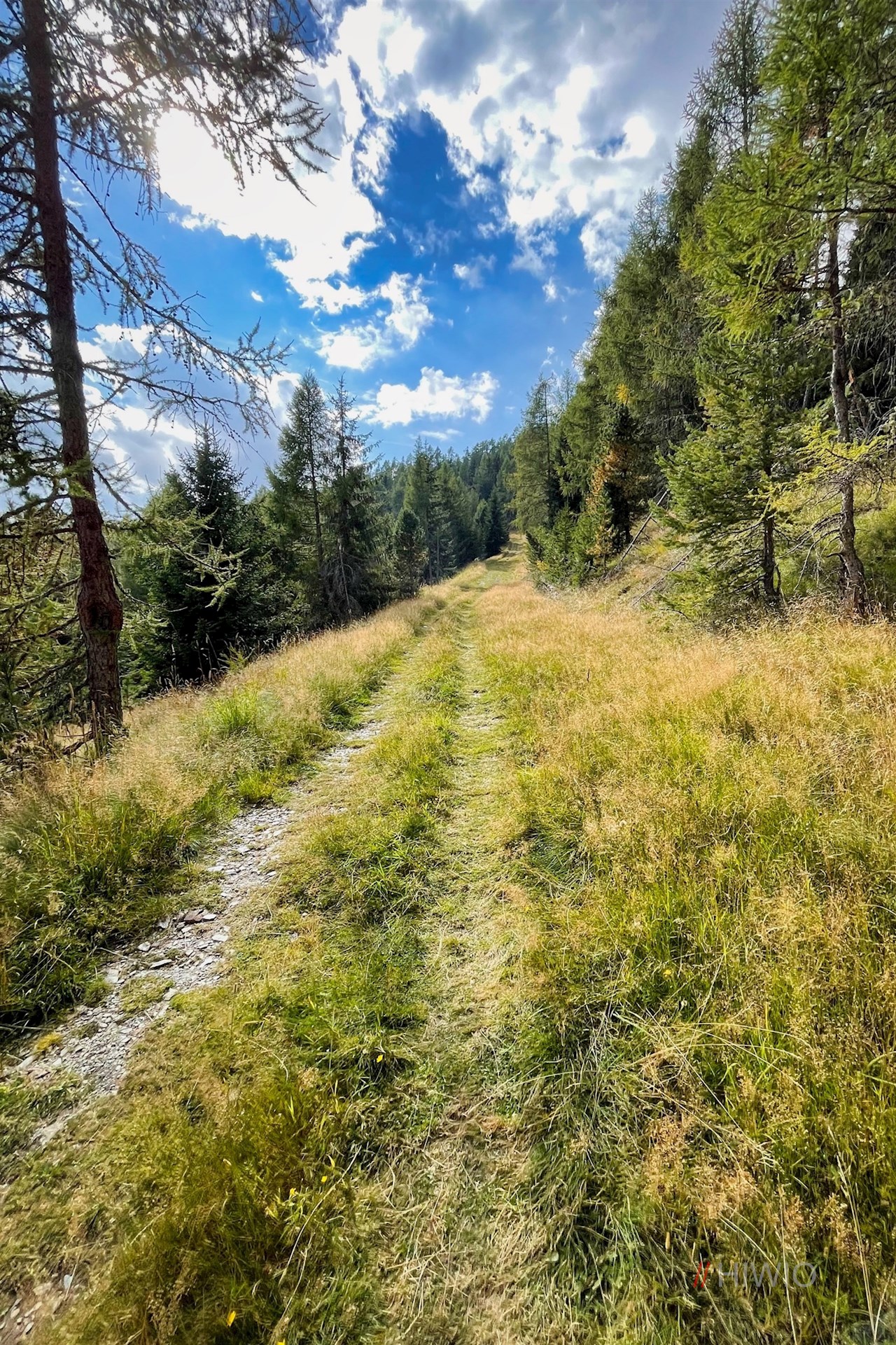 Wer mag, kann von der Maurerberghütte noch auf den etwa 150 Höhenmeter höher und etwa 40 Minuten entfernt gelegenen Maurerberg aufsteigen. Wir aber schlagen den Weg Nr. 1 in Richtung Lüsner Joch ein, der neben der Maurerberghütte abzweigt und im sanften Auf und Ab aussichtsreiche Weide- und Waldhänge quert.