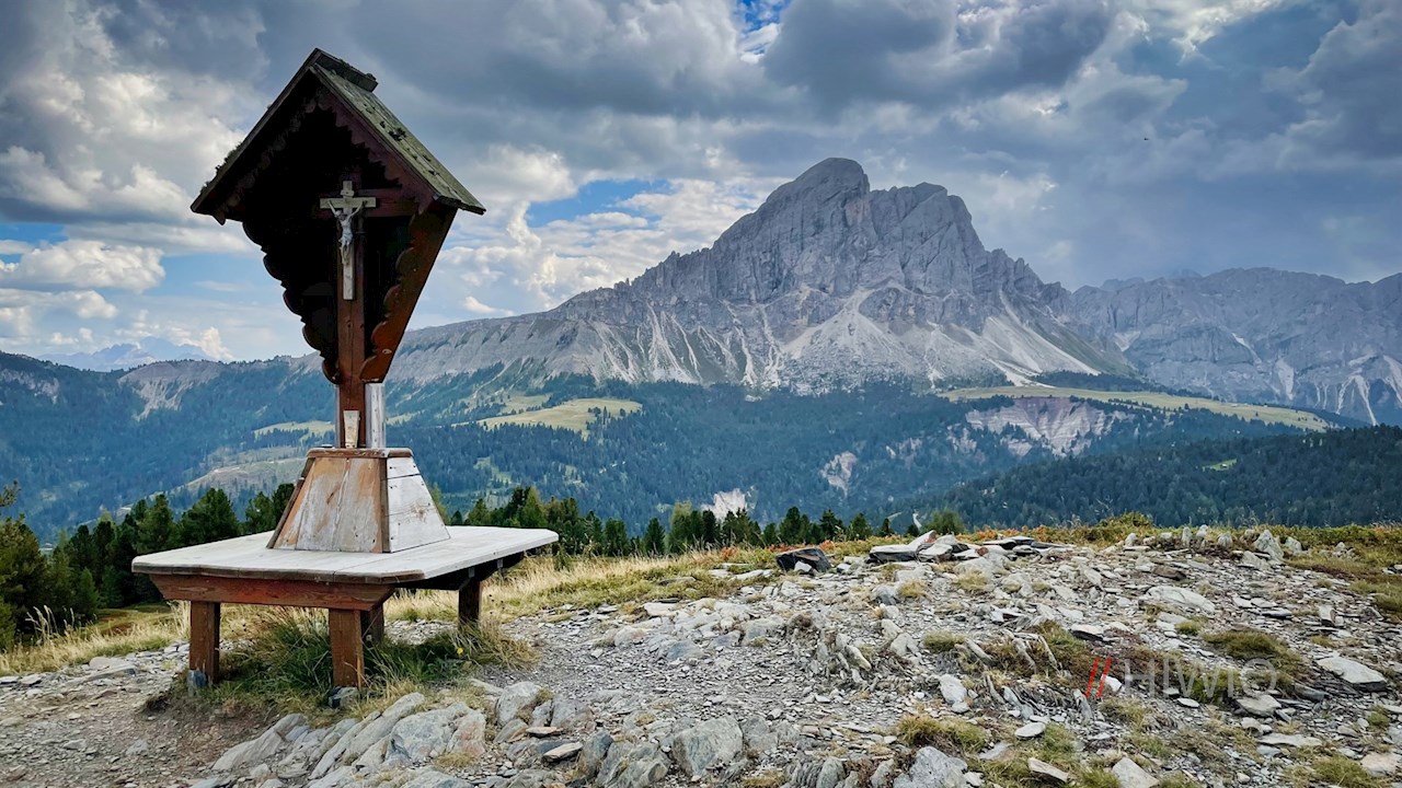 Neben der Maurerberghütte gibt eine Panoramatafel Aufschluss über die ringsum aufragenden Dolomiten, von denen insbesondere der Piz da Peres, die Kreuzkofelgruppe und der Peitlerkofel ins Auge stechen.