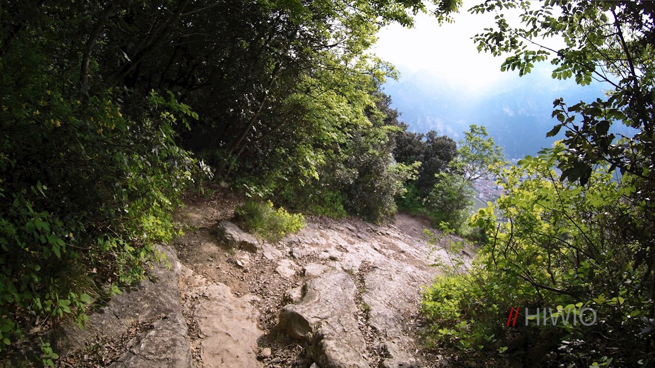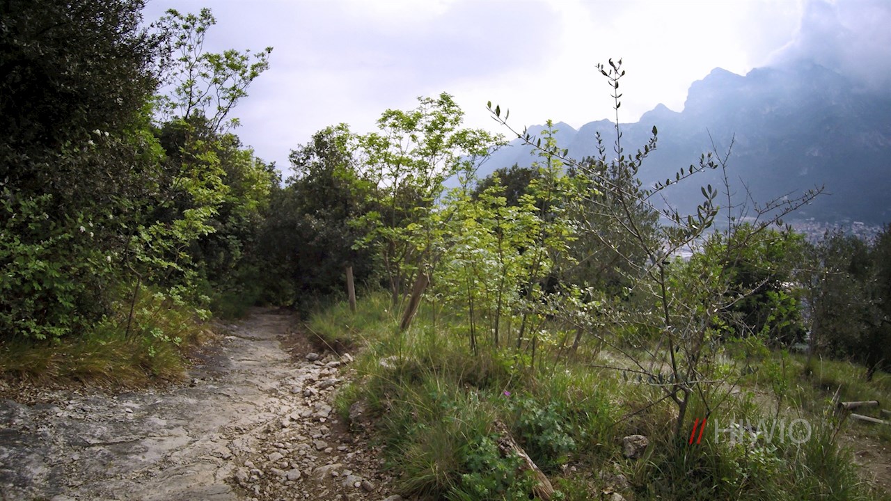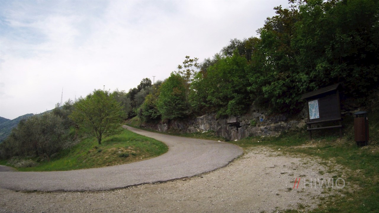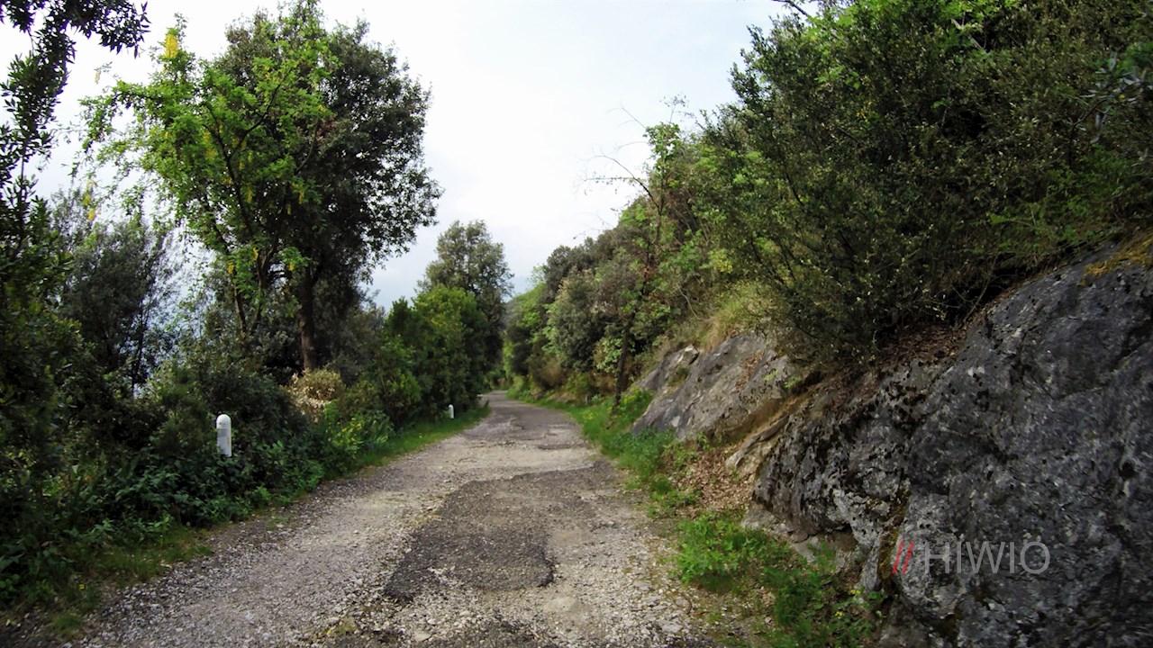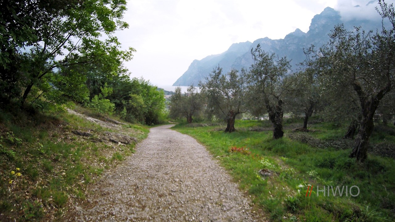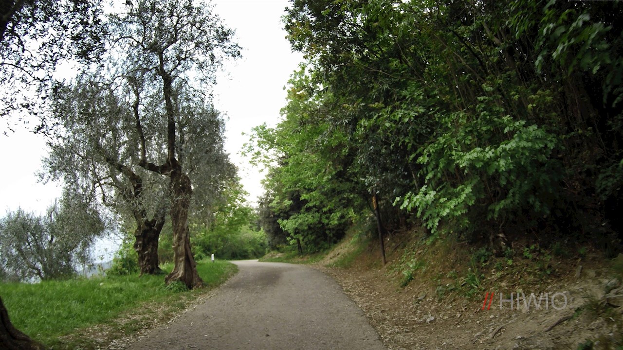 Zunächst an Häusern, sodann an Olivenhainen und lichtem Wald vorbei, führt der asphaltierte Weg in sieben Kehren auf den Monte Brione. Bereits während der Auffahrt genießt man einen malerischen Blick auf den Gardasee und Rivas Umgebung.