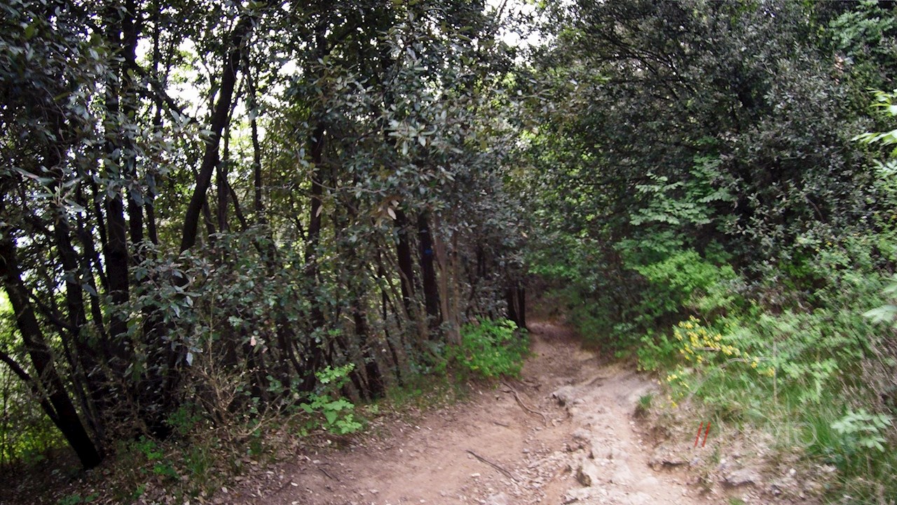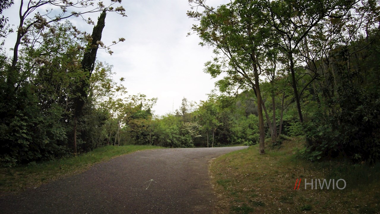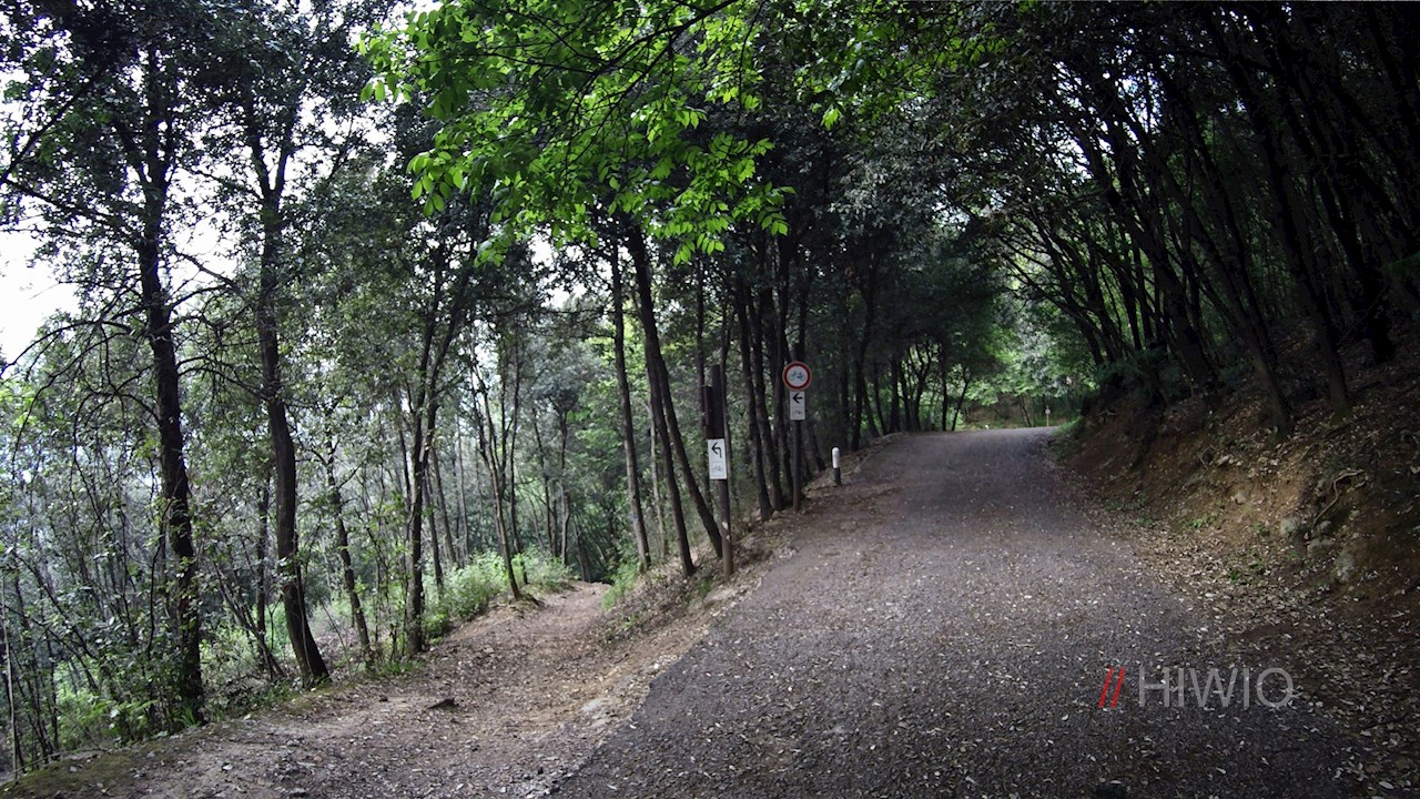 Wenig unterhalb des Gipfels markiert ein Durchfahrtsverbotsschild das Ende des Radweges; kurz vor dem Schild zweigt links ein Waldweg ab. Zunächst recht steinig und holprig, geht dieser alsbald in ein steiles Betonsträßchen über, das zur Ortschaft San Alessandro hinabführt. Von dort gelangt man ebenen Weges zum Ausgangspunkt zurück.