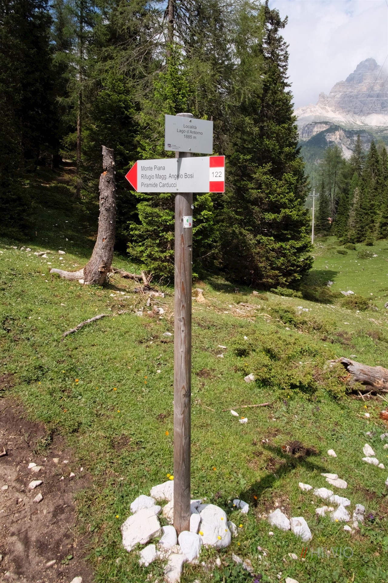 Am Parkplatz folgt man zunächst dem links abzweigenden Pfad, der sich entlang der Straße zum idyllischen Antornosee hochschlängelt. An dessen Nordufer zweigt der Wanderweg Nr. 122 in Richtung Monte Piana ab.