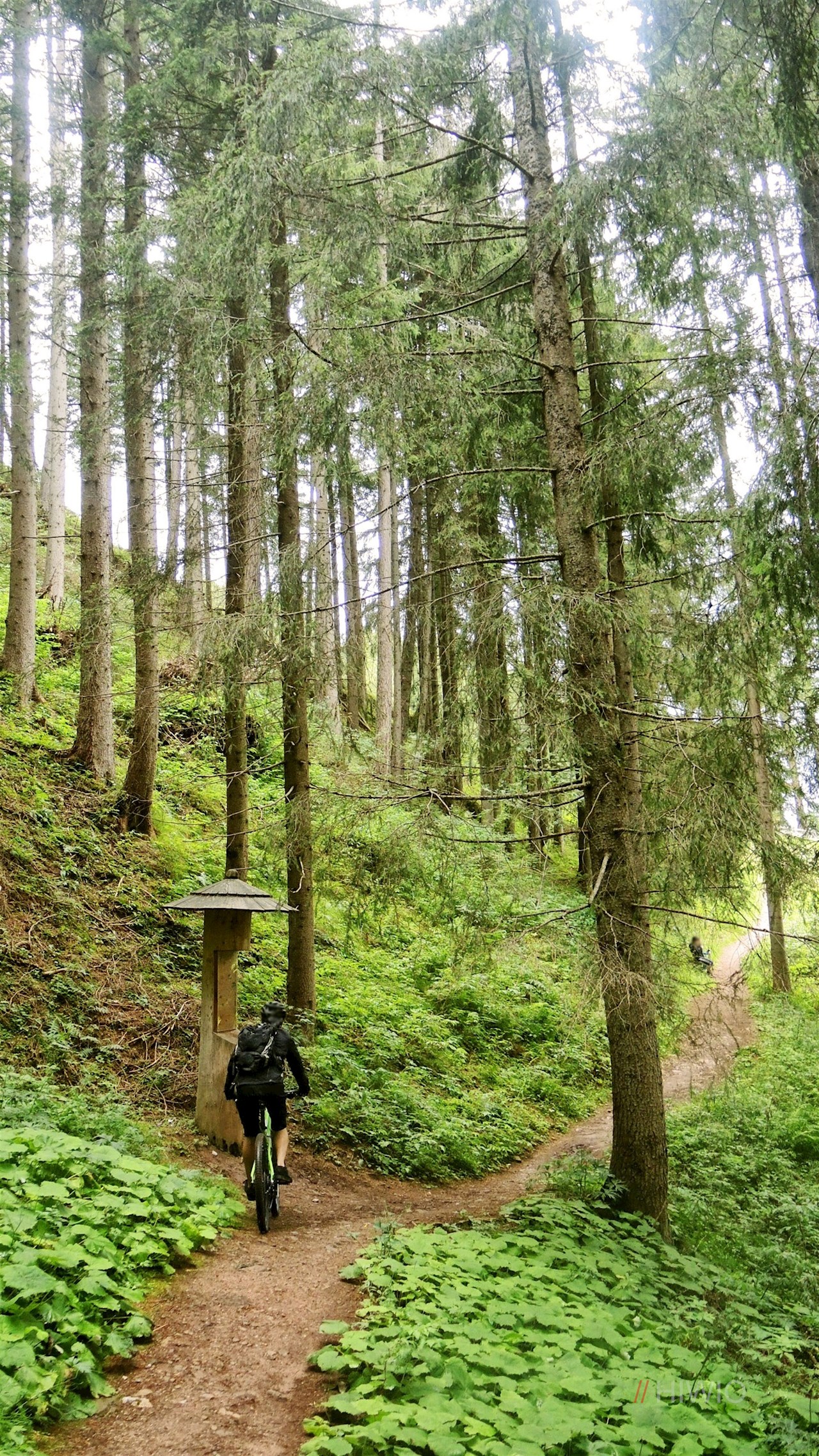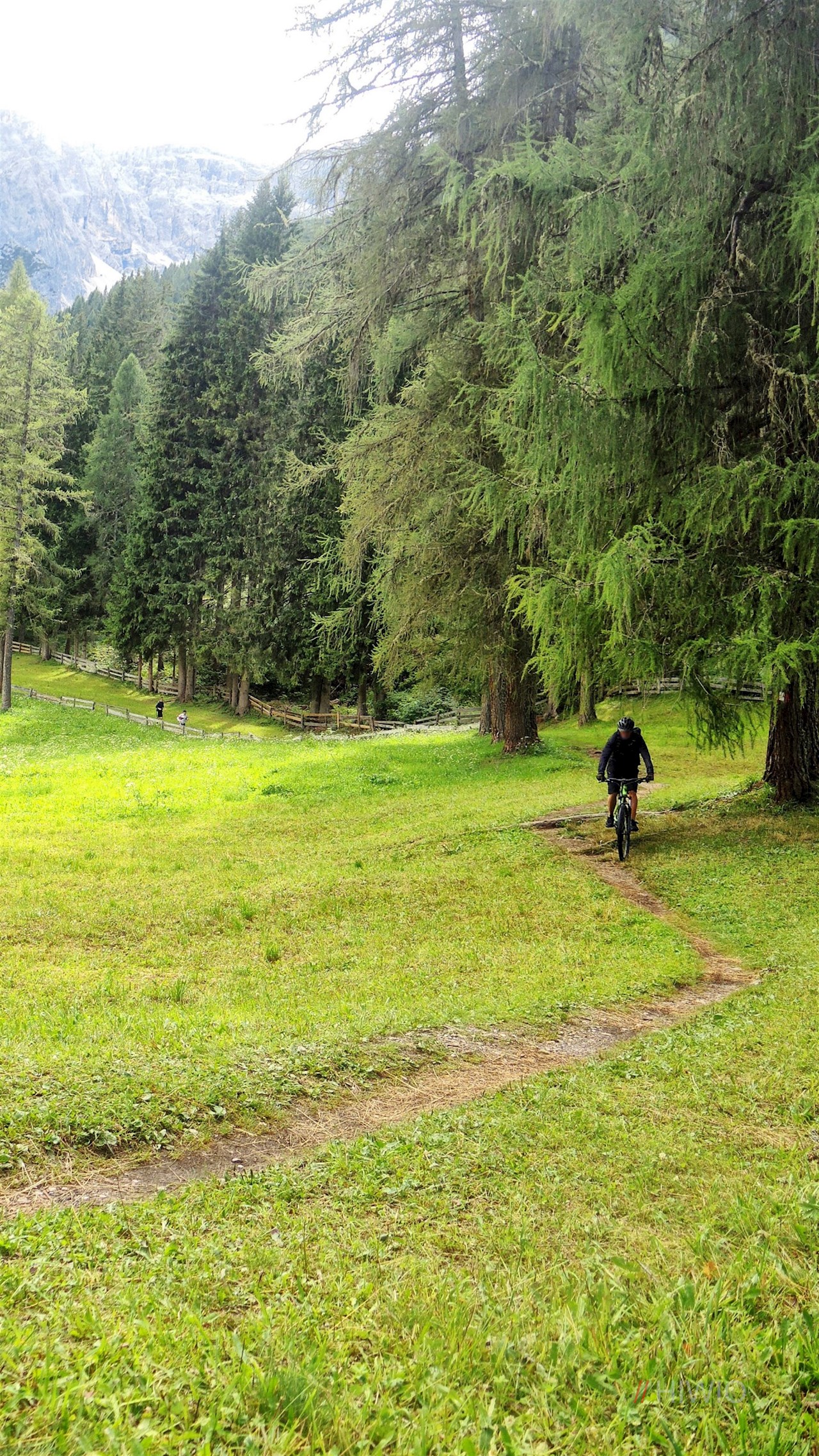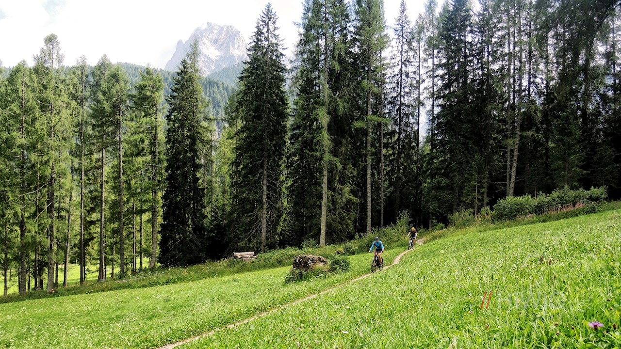 In Sexten angekommen, bleiben wir weiterhin auf der rechten Talseite und folgen dem Radweg, bis wir die Talstation des Skigebietes „Rotwand“ erreichen. Jetzt wird es nochmals etwas anstrengend, doch ein schöner weiter Lärchenwald und das saftige Grün der umliegenden Wiesen entlohnen uns für die zurückgelegten Höhenmeter.