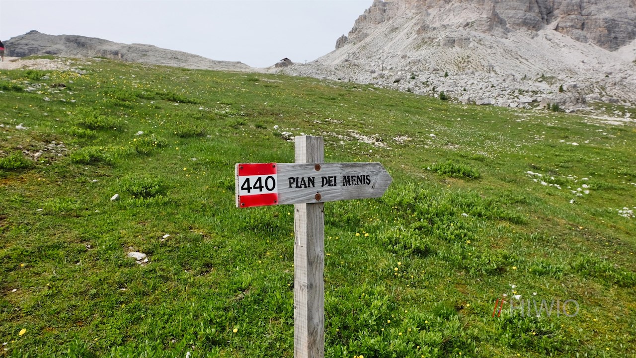 Der Rückweg vom Nuvolau erfolgt zunächst auf dem Hinweg. Kurz vor der Scoiattoli Hütte schlägt man den links abzweigenden, teils stein- und felsbeschlagenen Pfad Nr. 440 in Richtung Pian dei Menis ein, der durch Wald und Wiesen absteigt. Nahe der Passstraße weist an einer kleinen Holzbrücke der Wegweiser Nr. 424 mit der Aufschrift "partenza seggiovia" den Weg zum nunmehr nahen Ausgangspunkt.