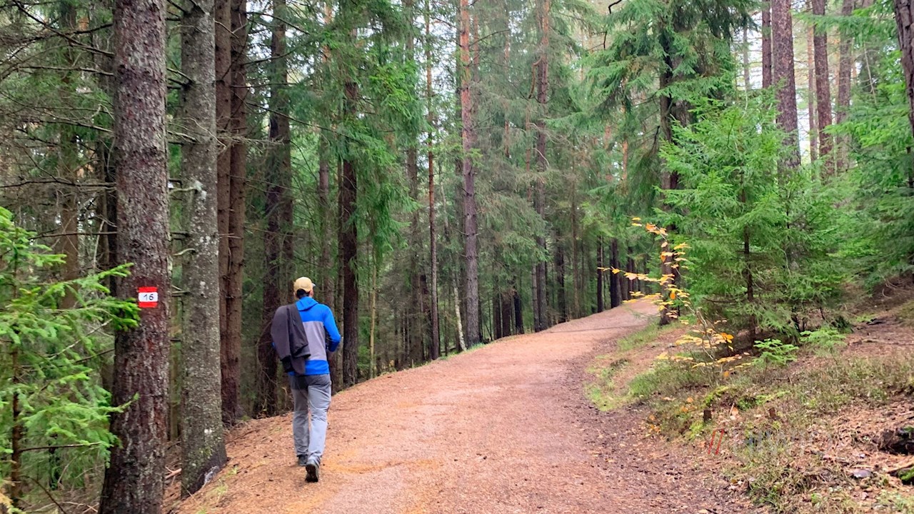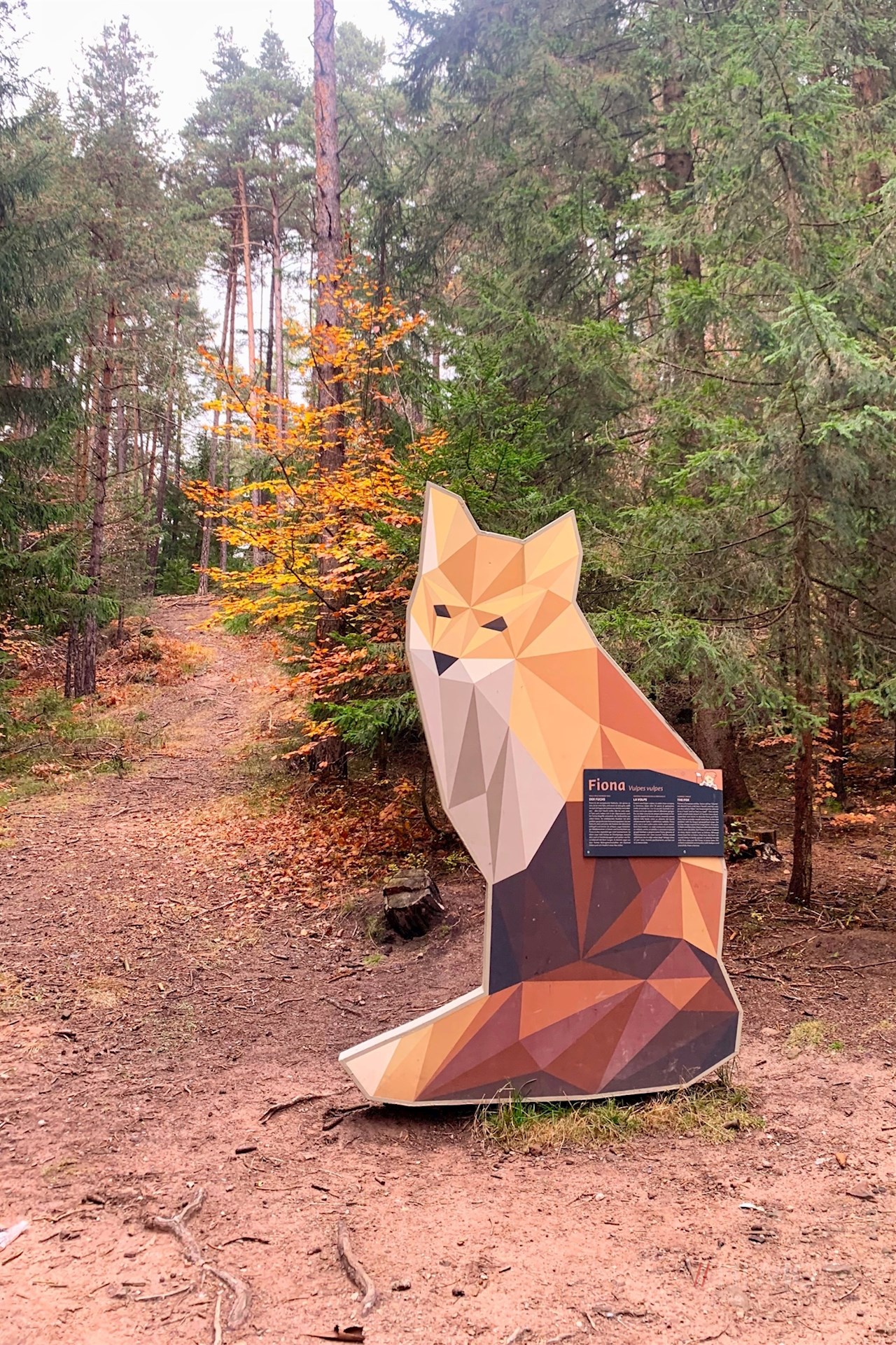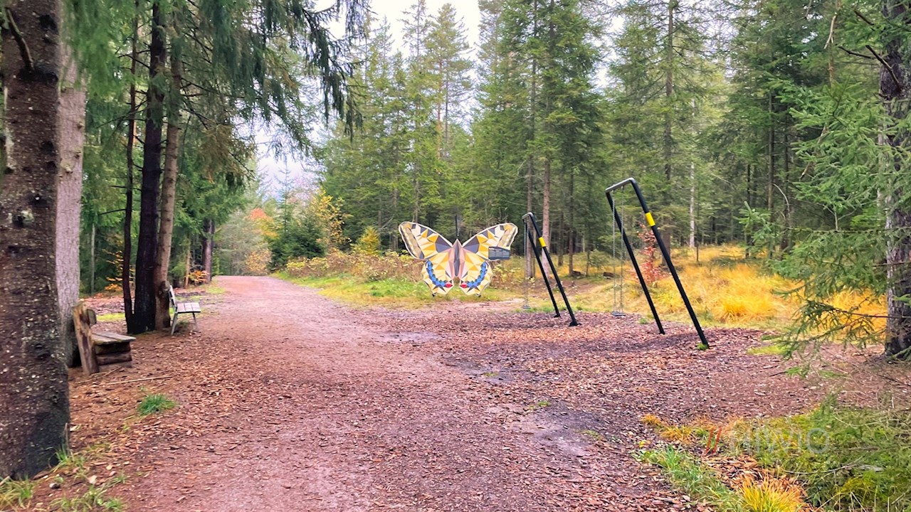 Er folgt zunächst der Straße zum unteren Waldrand, an dem Pyramix die Wanderer bereits willkommen heißt. Der Naturlehrpfad selbst zieht sich ohne nennenswerte Höhenunterschiede durch den harzduftenden, vom Gesang einzelner Vögel erfüllten Wald, in dem acht anregende Stationen interessante und interaktive Einblicke in die Lebenswelt heimischer Wildtiere vermitteln.