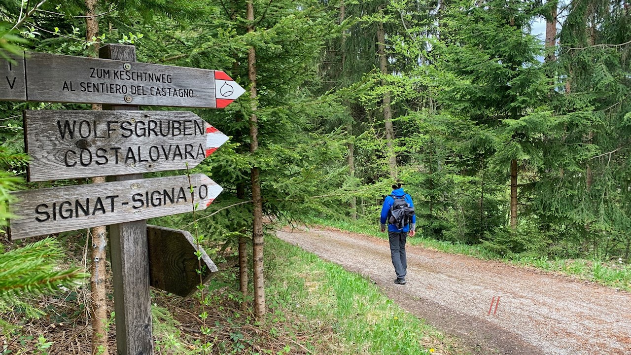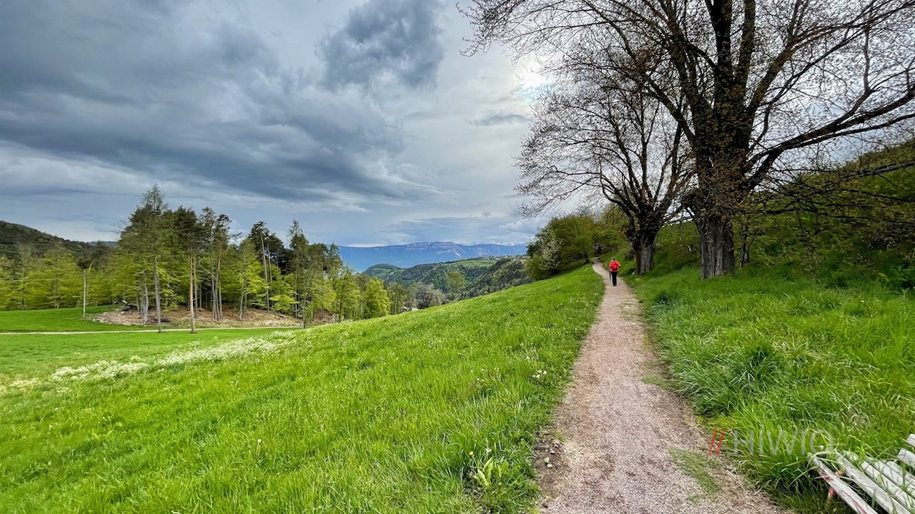 Auf dem Rückweg vom Wolfsgrubener See folgt man zunächst dem bereits bekannten Weg. An der ersten Weggabelung schlägt man diesmal aber den Weg Nr. 15 nach Oberbozen ein. Er führt nahezu eben durch baumbestandene Wiesen, in denen sich schöne Ausblicke auf den Bozner Talkessel und Oberbozen öffnen.