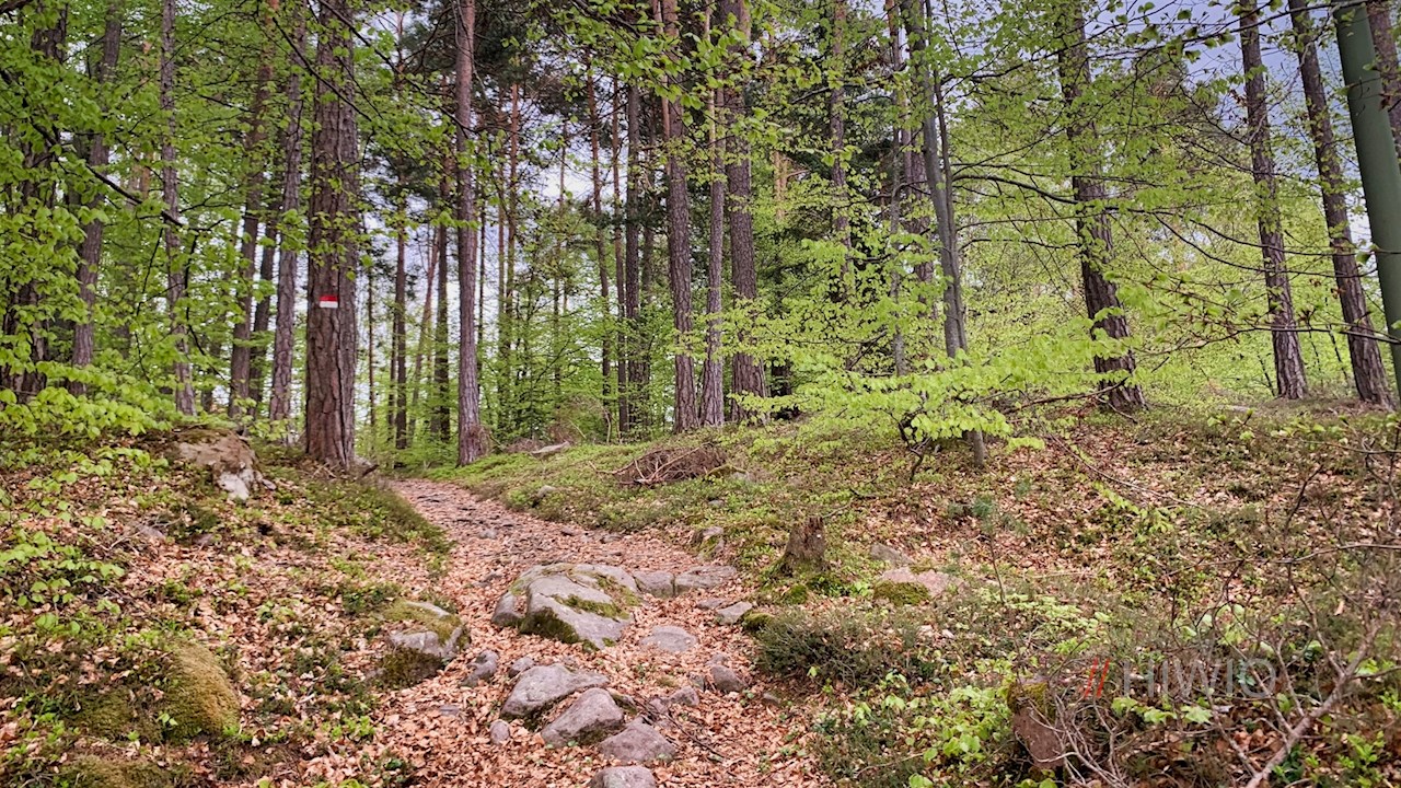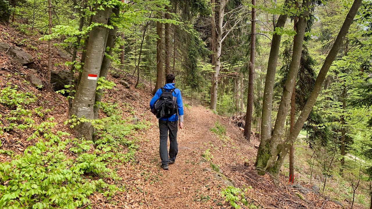 Wenig später zweigt der Wanderweg rechts ab und führt im leichten Abstieg durch schattenverheißenden Mischwald und blumenreiche Wiesen.