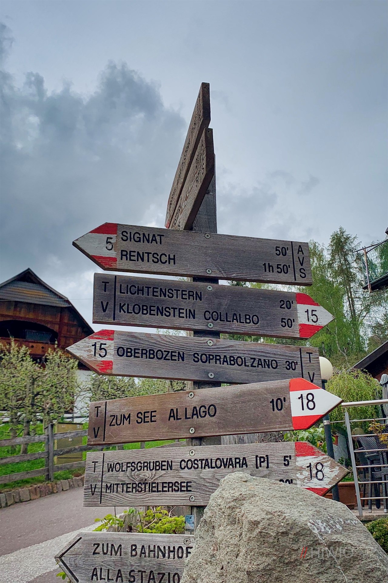 Ausgangspunkt der Wanderung zum Wolfsgrubener See ist die Bergstation der Rittner Seilbahn in Oberbozen. Hier weist das Wanderschild Nr. 26 den Weg nach Wolfsgruben. Er folgt zunächst einem asphaltierten Sträßchen, das gleich zu Beginn die Geleise der Rittner Bahn überquert.