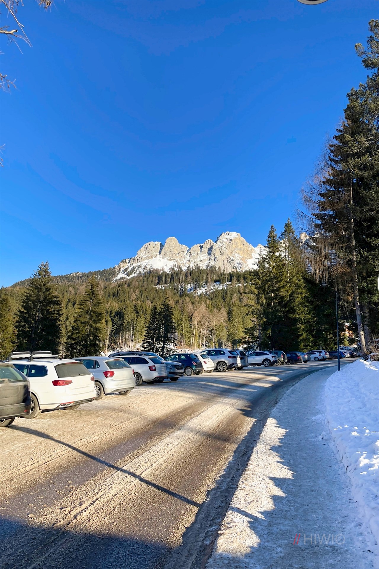 Der Anstieg zur Epircher Laner Alm beginnt auf einem der Parkplätze um die Seilbahn Obereggen.
