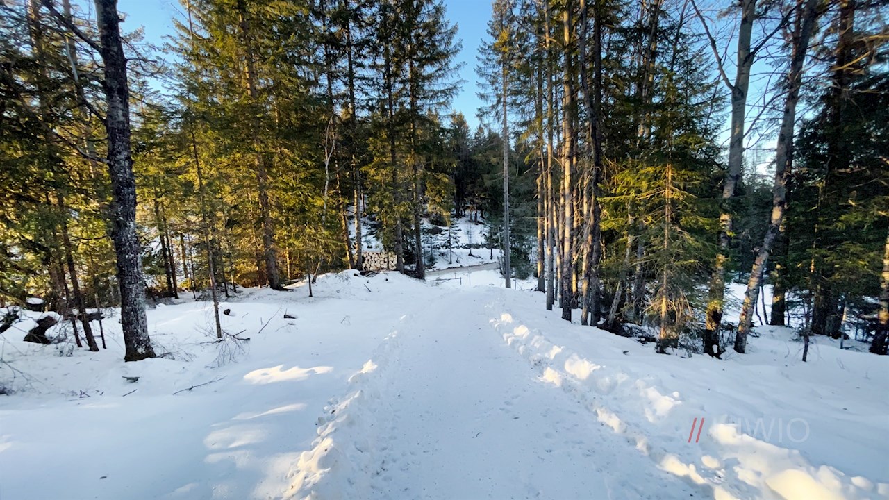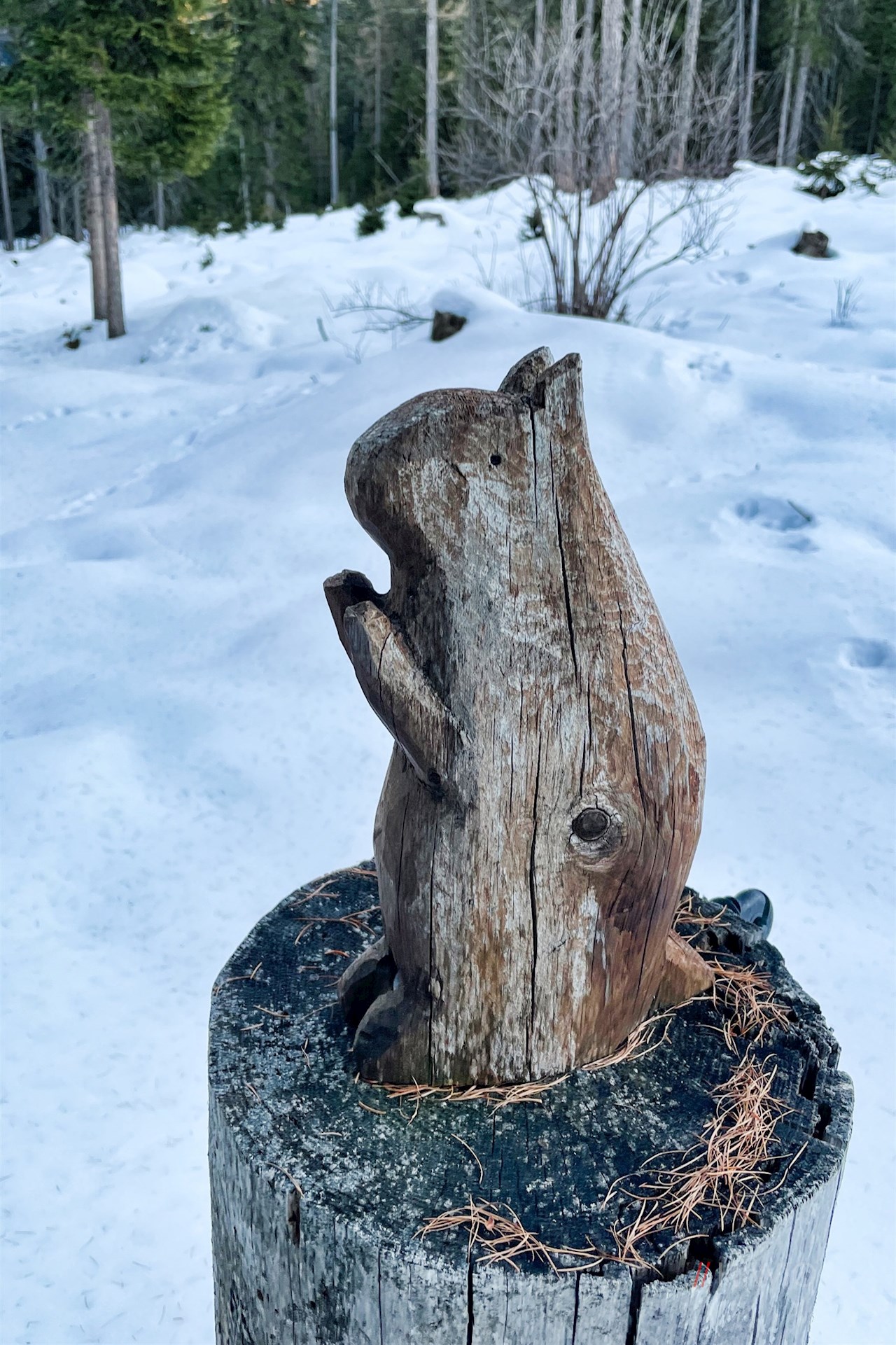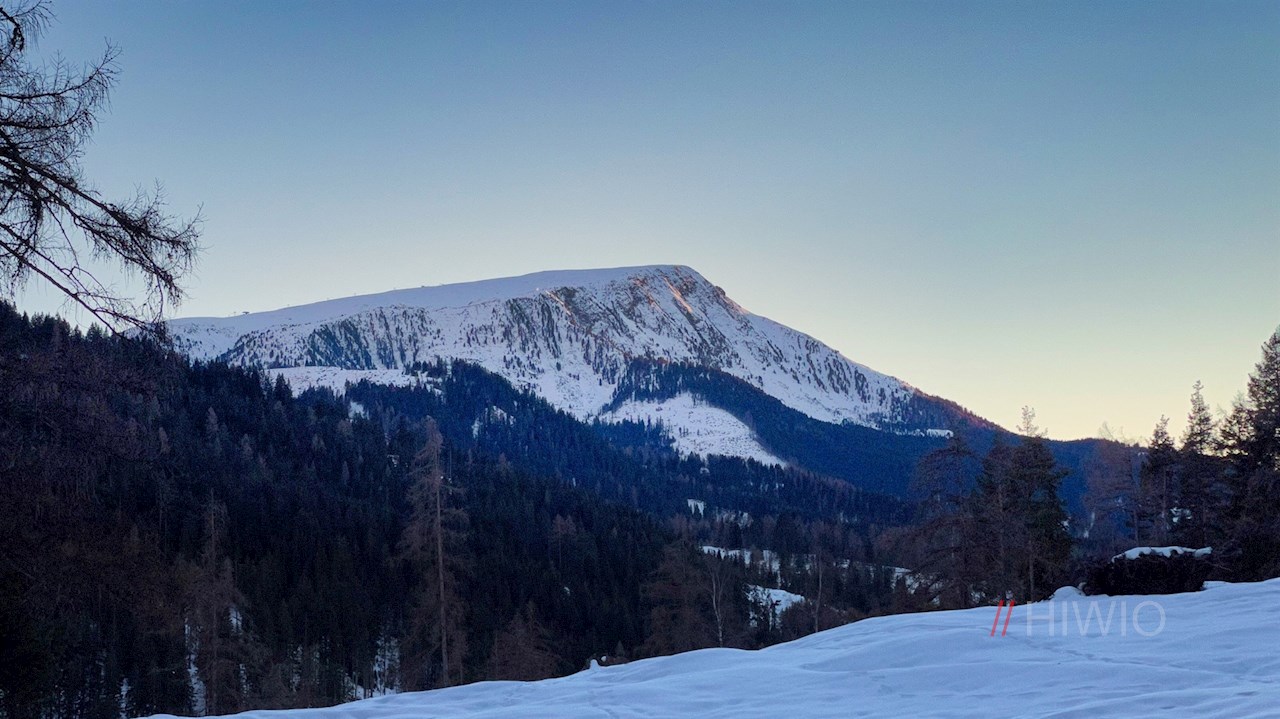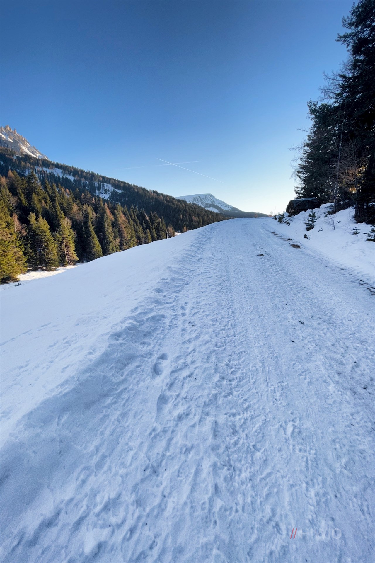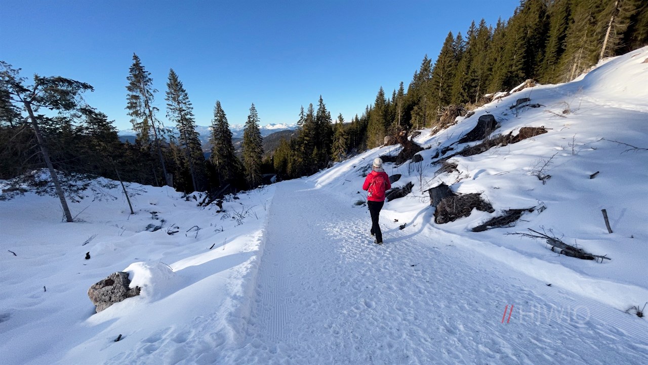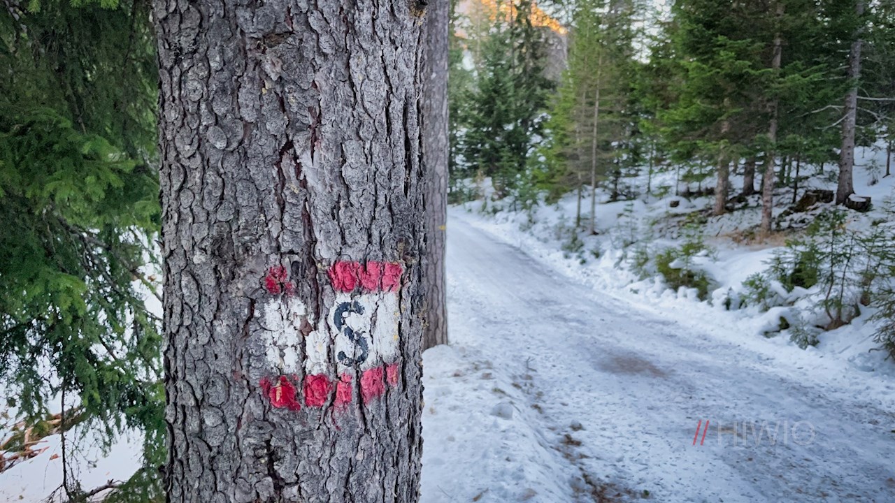 Am linken Straßenrand zweigt der gebahnte Winterwanderweg Nr. 9 in Richtung Häusler Sam ab. Er taucht nach wenigen hundert Metern in einen schneeverhangenen Wald ein, durch den er sich sanft seinen Weg bahnt.