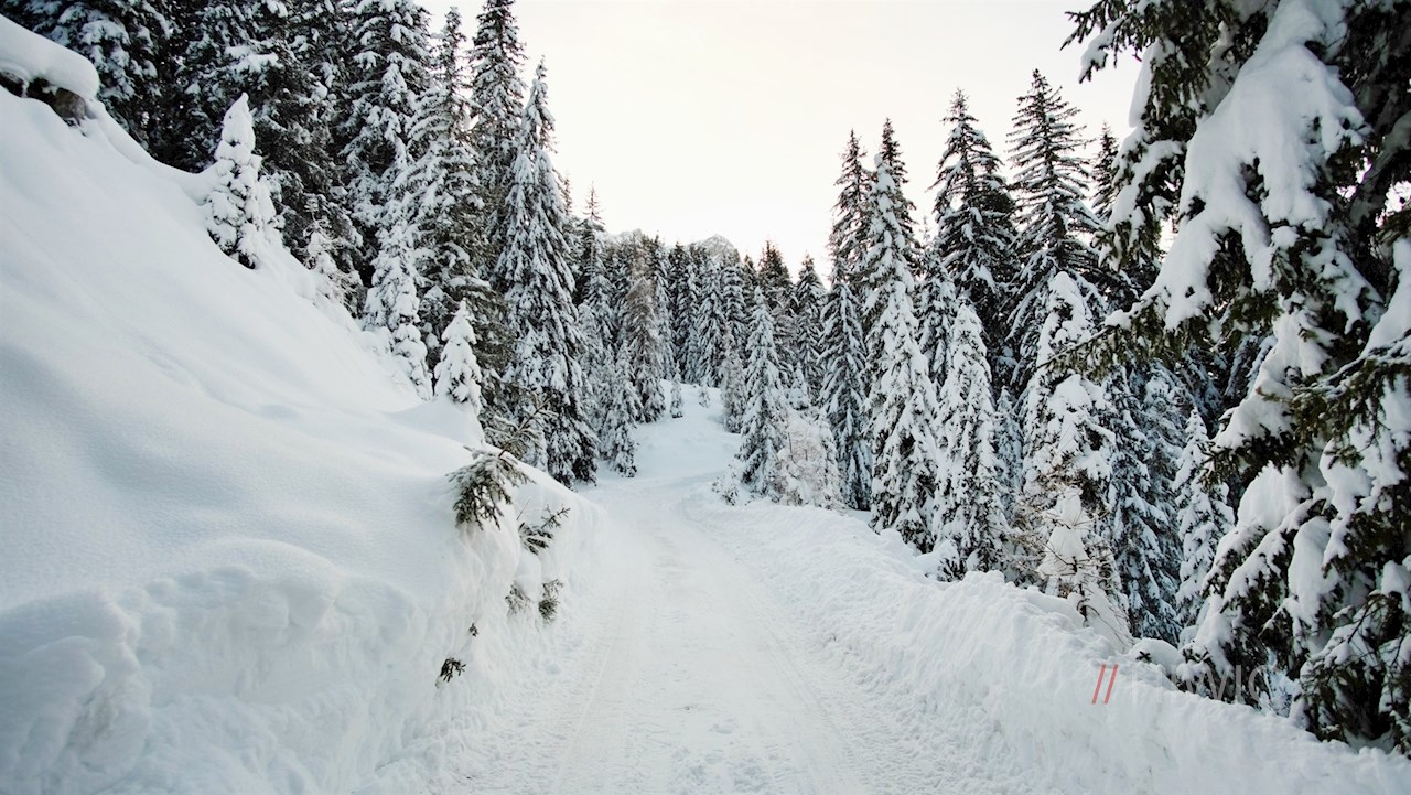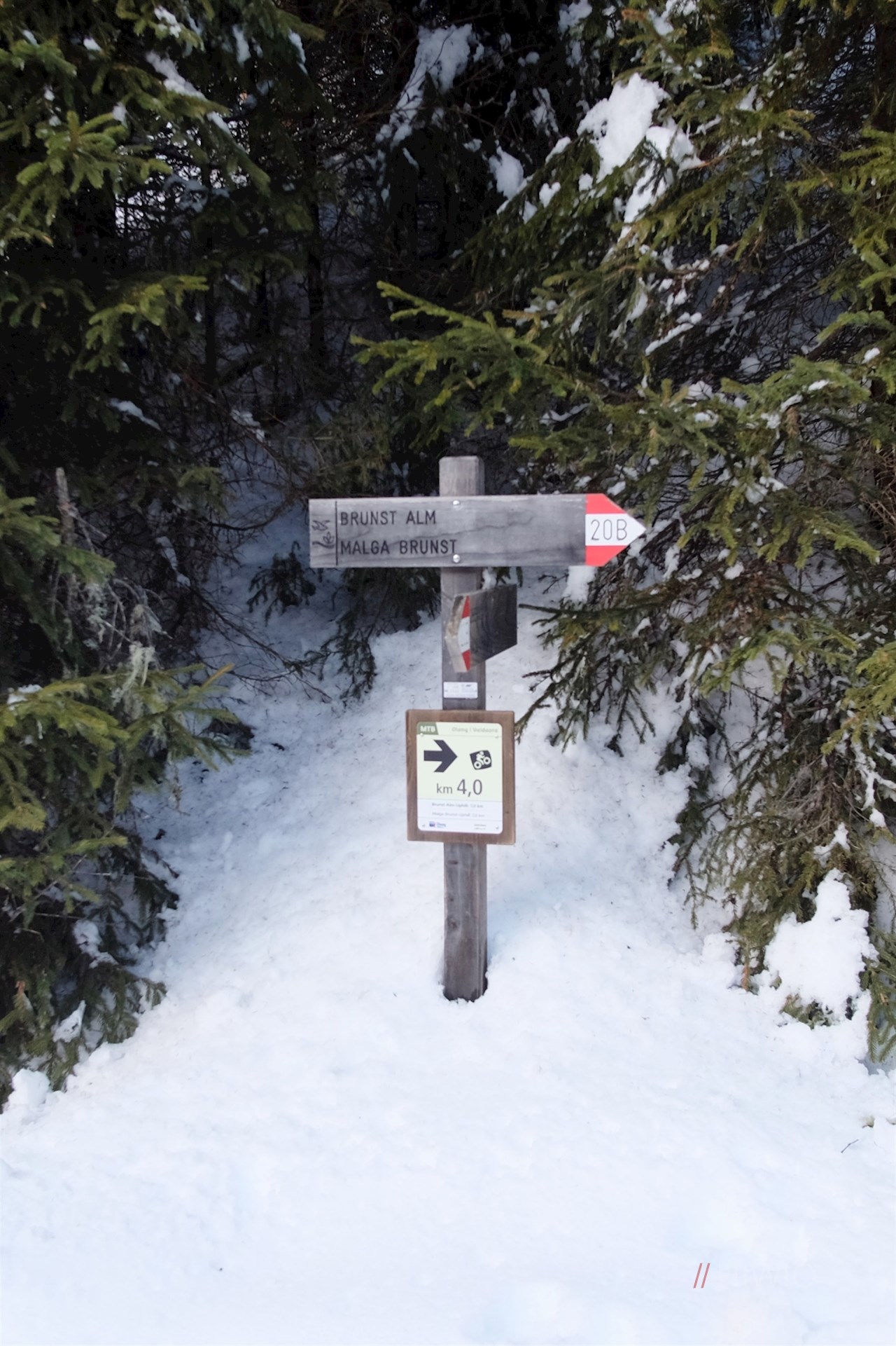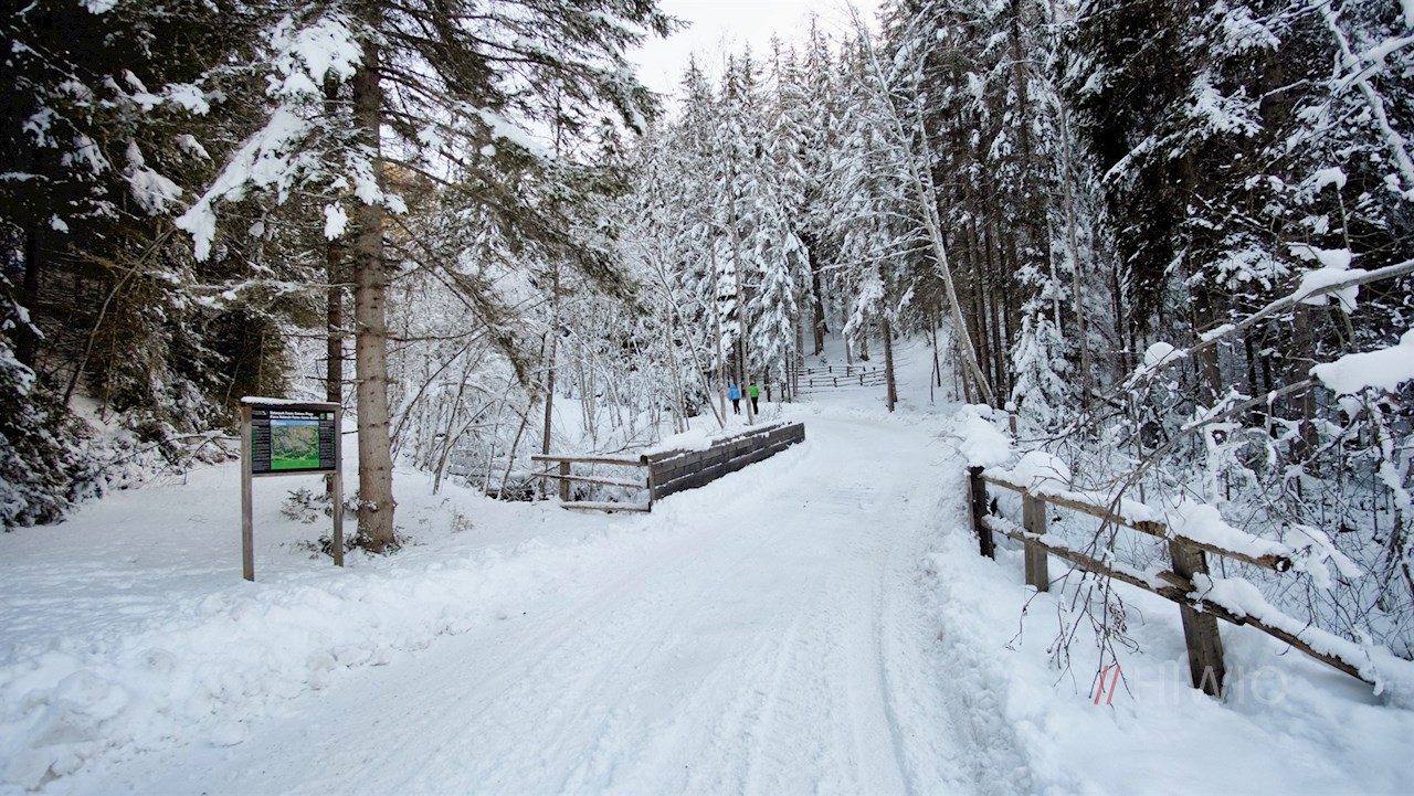 Stets der Beschilderung in Richtung Brunstalm folgend, wandert man im steten Anstieg durch den dichten, schneeverhangenen Nadelwald. Unterwegs erschließen sich immer wieder schöne Ausblicke auf den Pragser Hochalpenkopf, die Dreifingerspitze, den Piz da Peres und den Kronplatz.