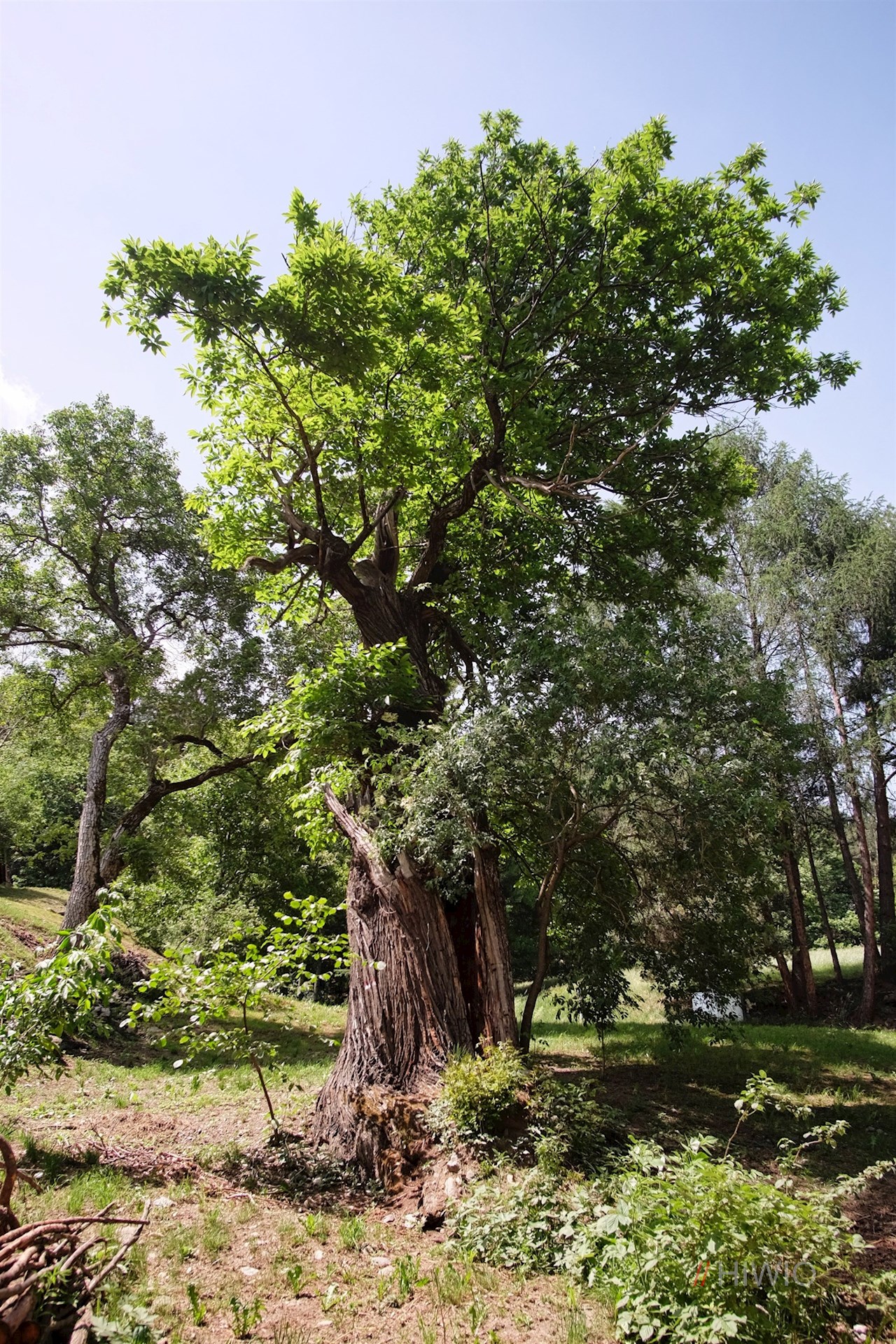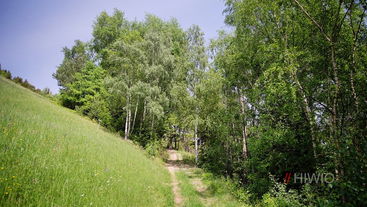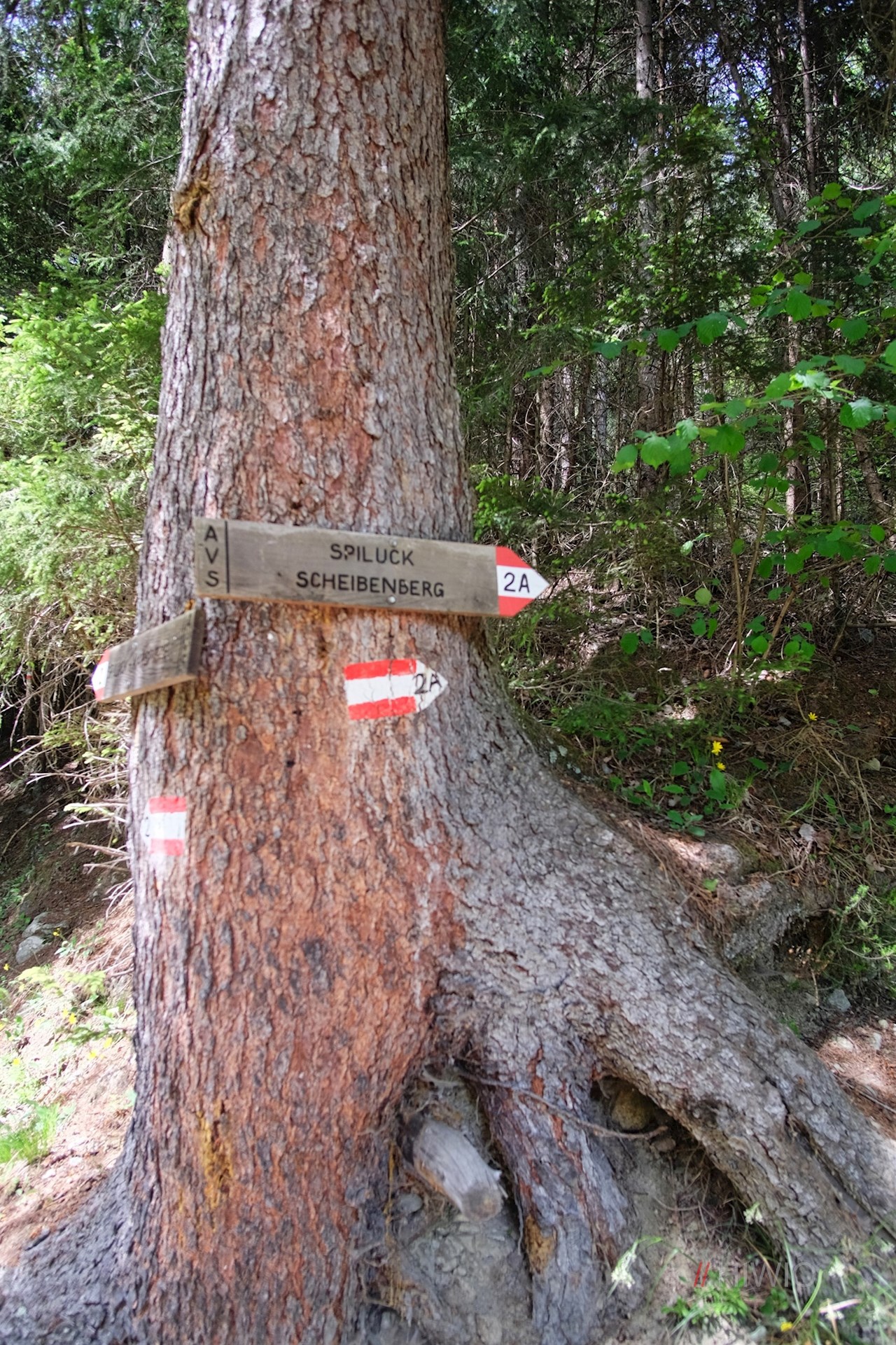 Nach wenigen Metern zweigt rechts der von Sträuchern und Bäumen umsäumte Weg Nr. 2 ab, der ziemlich steil durch den schattenverheißenden Wald ansteigt.