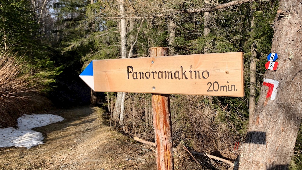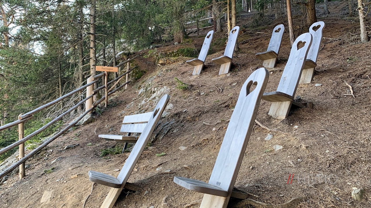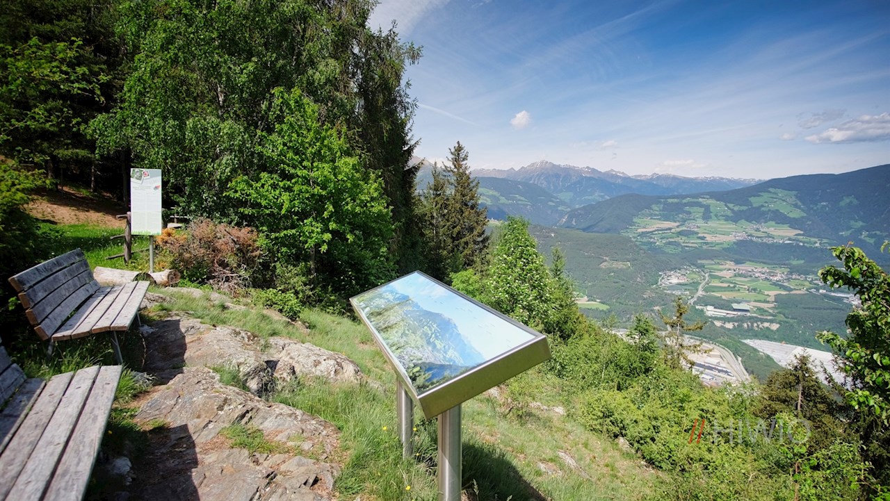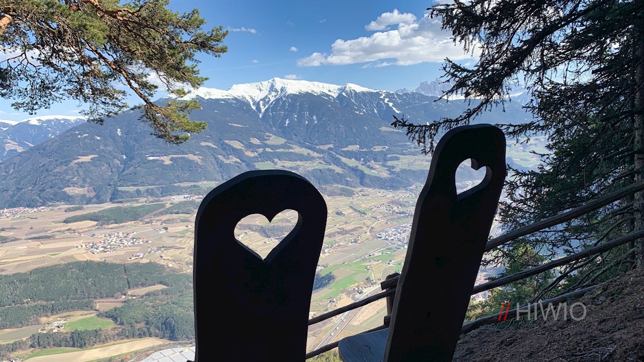 Weiterhin der Wegnummer 2A in Richtung Scheibenberg folgend, steigt der gut markierte Weg weiter durch den Wald zum Panoramakino an. In dieser idyllischen kleinen Lichtung mit den liebevoll gezimmerten Holzstühlen entfaltet sich wenig später ein verträumter Ausblick auf Vahrn, Brixen und die dahinter aufstrebende Bergwelt. Namentlich die Plose, die Villnösser Geisler, das Langkofelmassiv und die Raschötz stechen ins Auge.