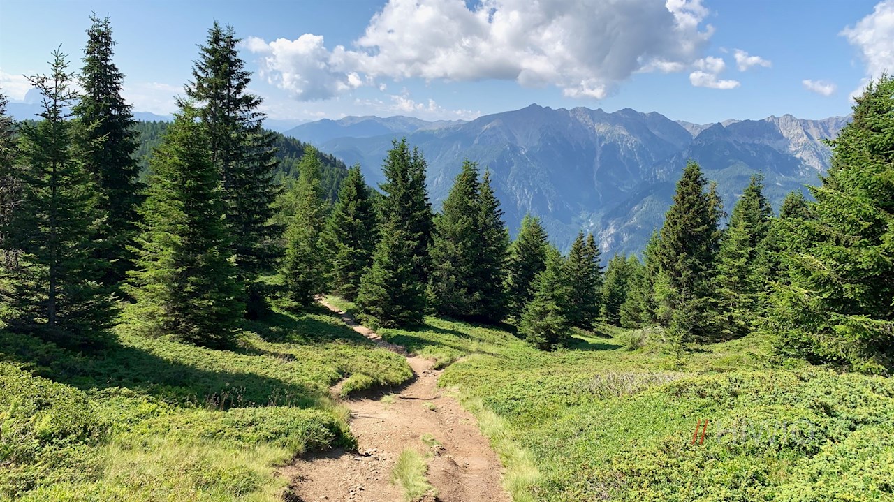 Bei der Bergstation ist der Panoramarundweg bereits ausgeschildert. Er schlängelt sich auf anfangs breitem, sanft ansteigendem Wege durch den Erlebnispark Jochtal und öffnet dabei schöne Ausblicke auf die umliegende Bergwelt.