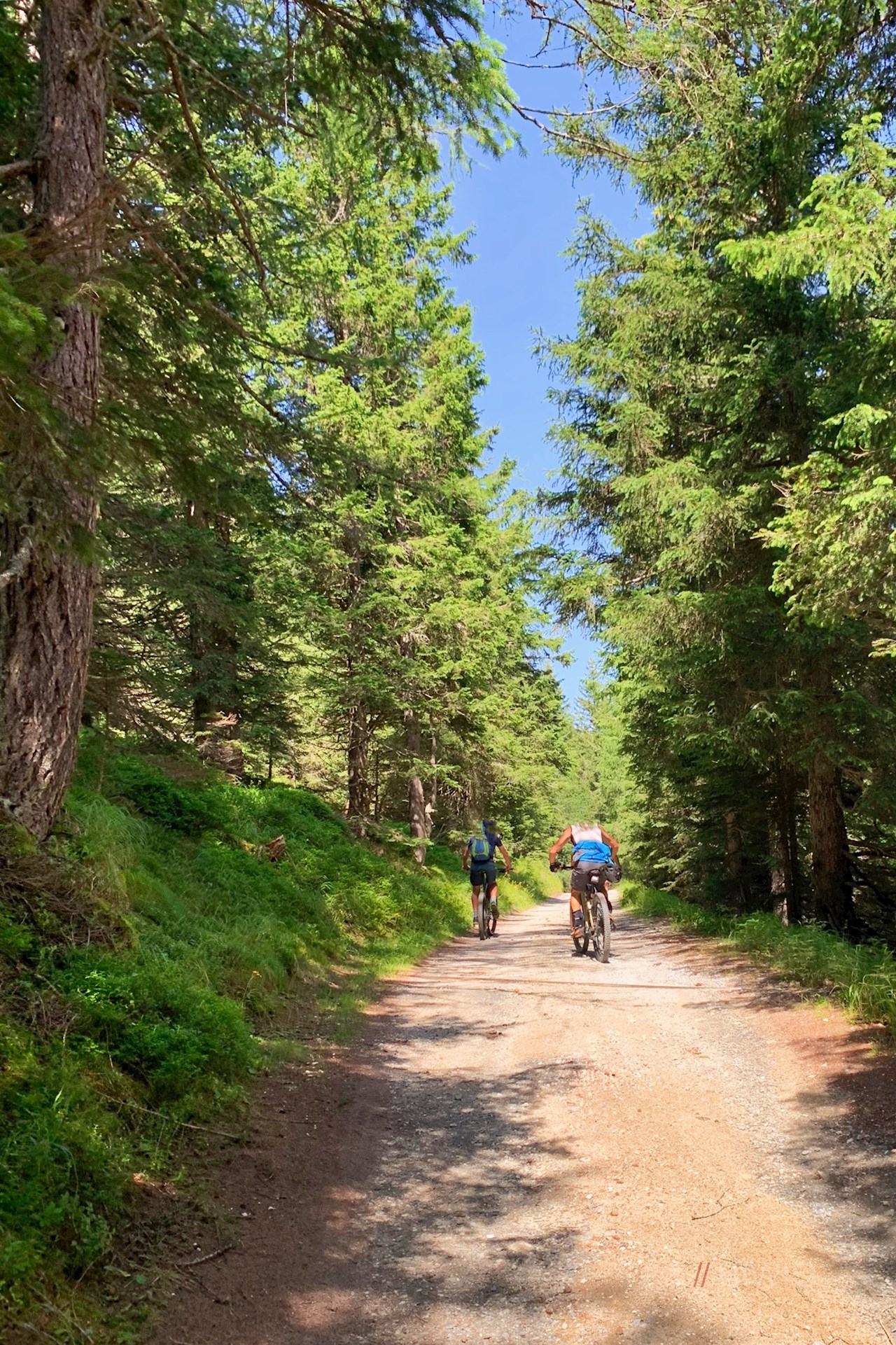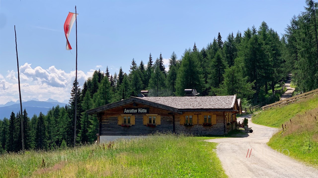 Schließlich weist ein Wanderschild den links abzweigenden Weg in Richtung Anratterhütte. Er führt durch Weidewiesen, Wald und lichte Lärchenhaine auf den tiefer liegenden Waldweg Nr. 9, der sich teils eben, teils im sanften Anstieg zur nunmehr recht nahen Anratterhütte zieht.