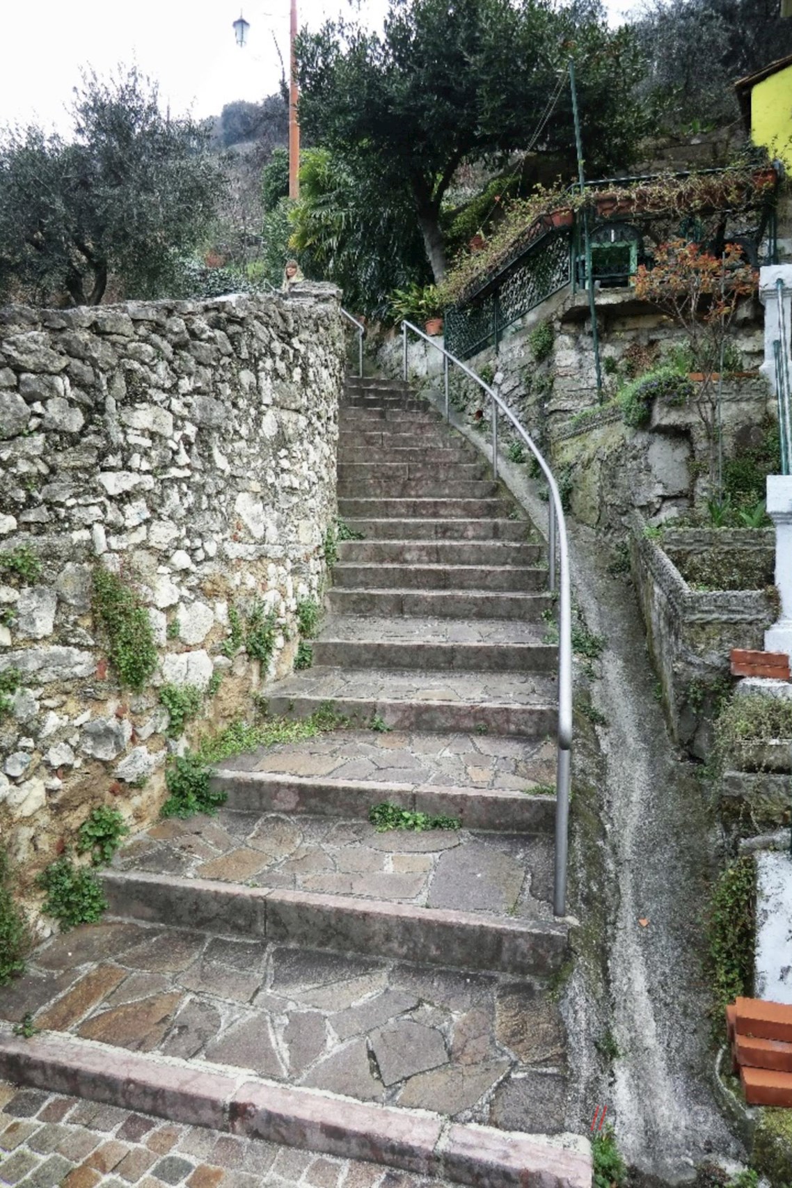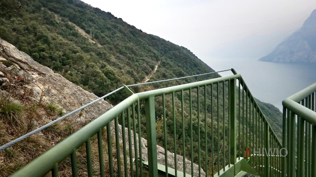 Sodann folgt das eigentliche Highlight der Wanderung: Auf drei aufwändig in die nahezu senkrecht abfallenden Felswände gehauenen Metalltreppen steigt man bequem und sicheren Fußes über die ansonsten kaum zu überwindenden Berghänge ab. Auf ihnen genießt man nicht nur einen malerischen Ausblick auf den Gardasee – die Gitter der insgesamt 387 Stufen geben auch schwindelerregende Blick nach unten frei...