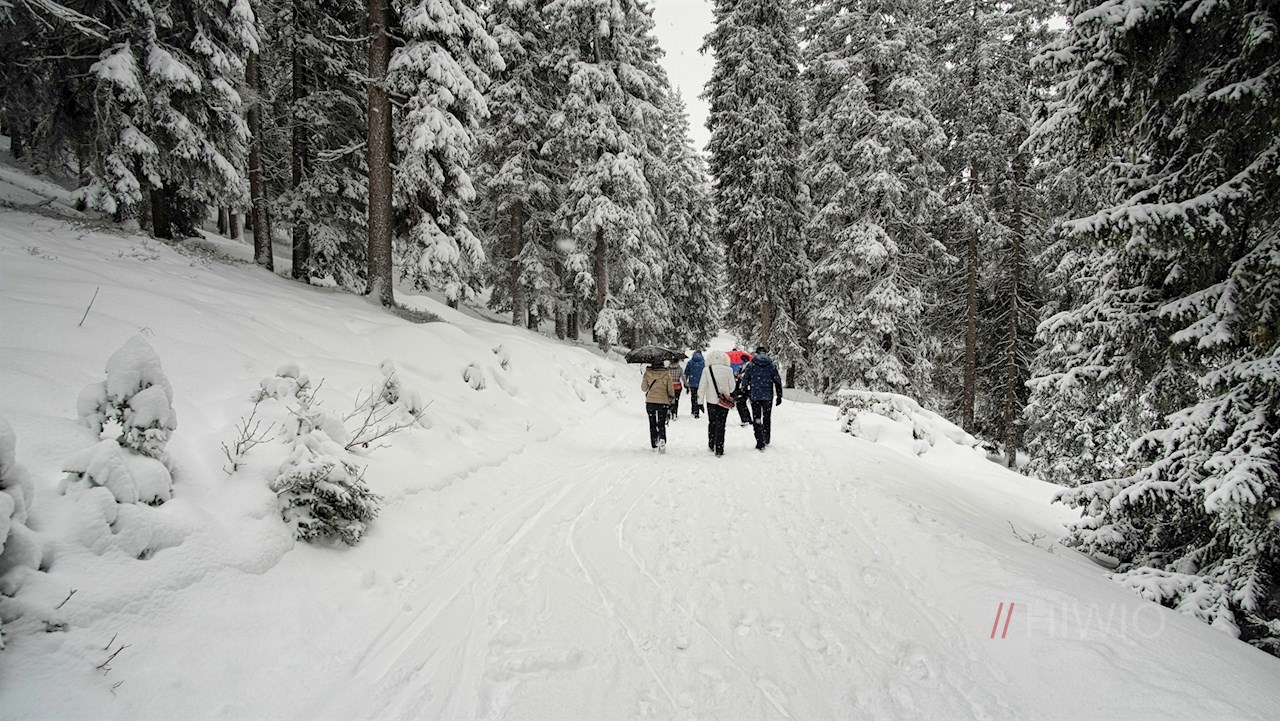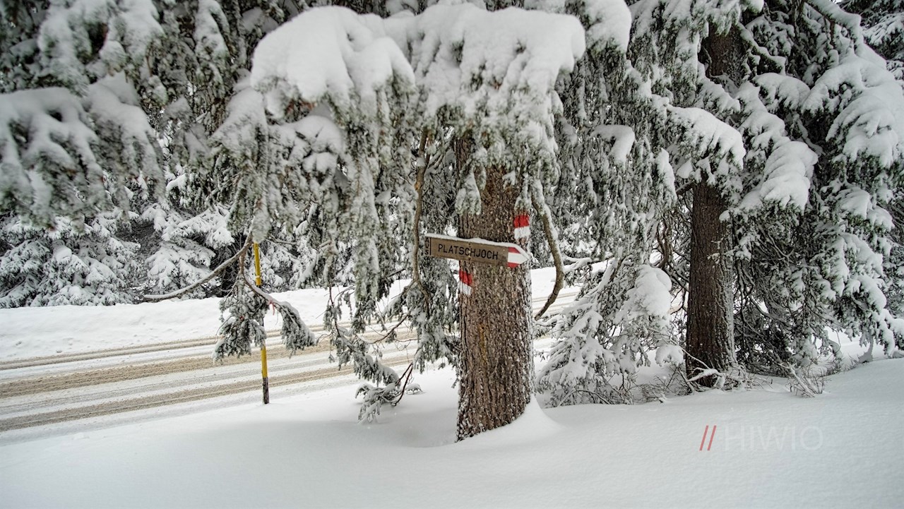 Weiterhin dem von Nadelbäumen umsäumten Wanderweg folgend, setzt sich die Wanderung zu den verschneiten Almmatten auf dem Platschjoch fort. Dabei überquert der Weg einmal die Jaufenpassstraße.