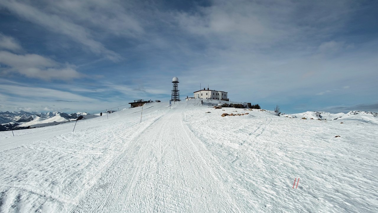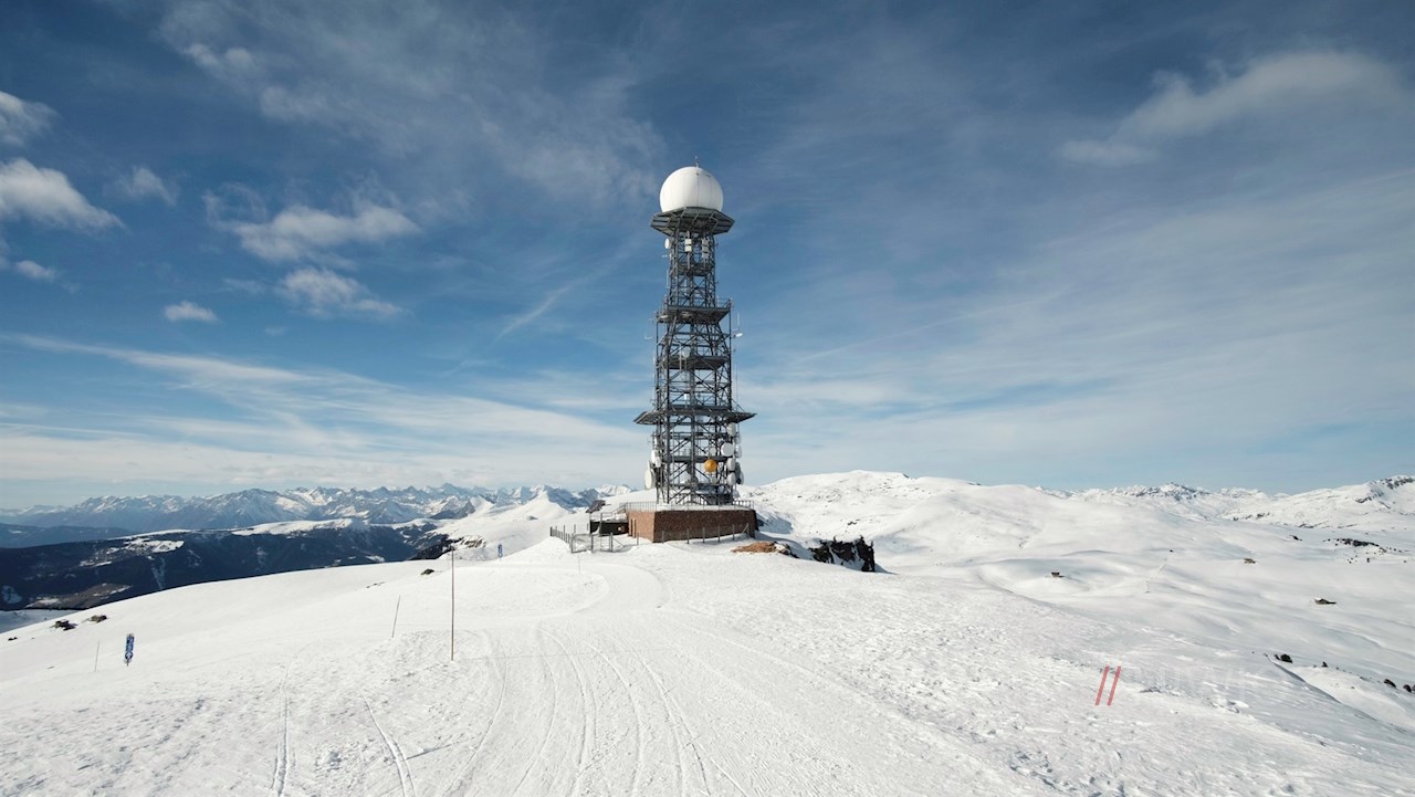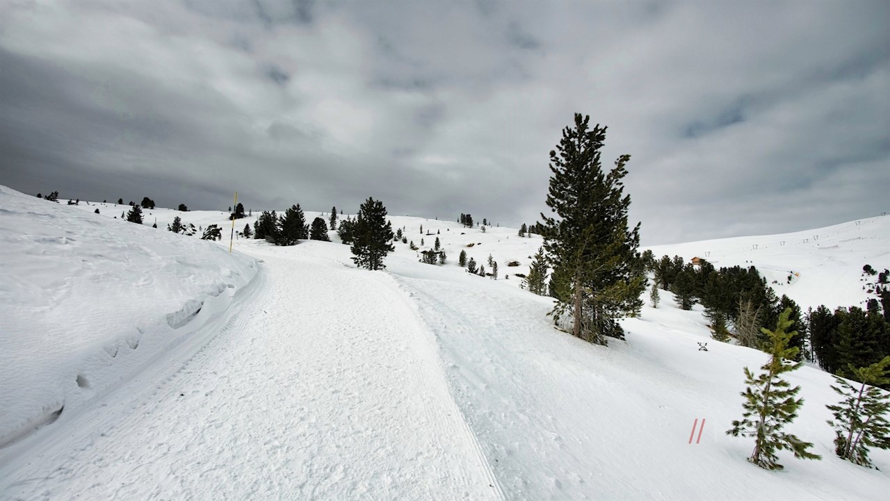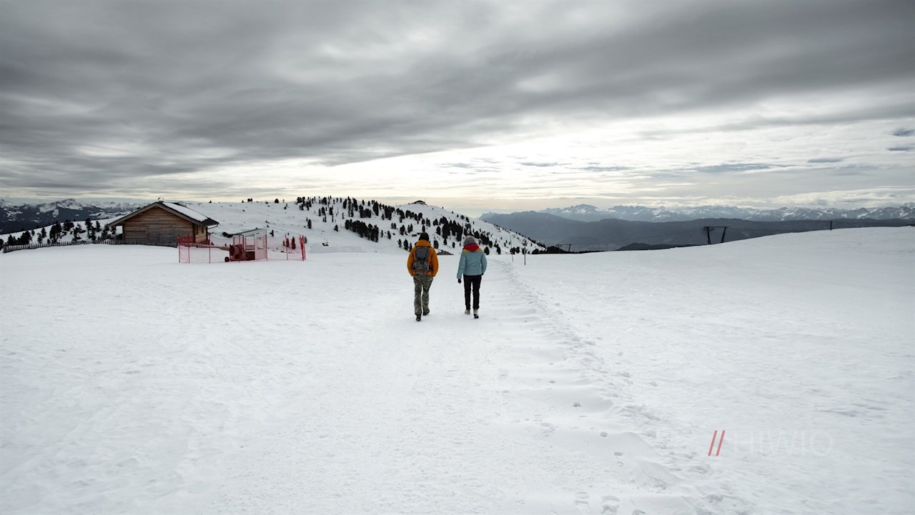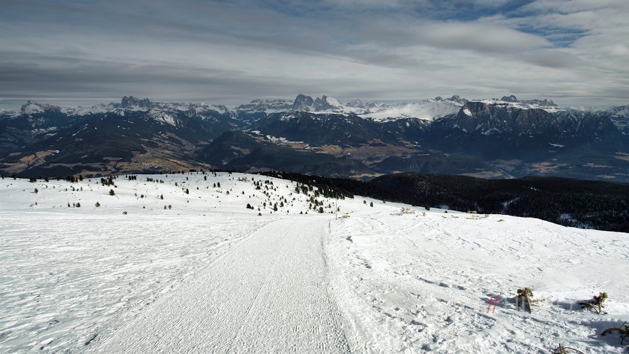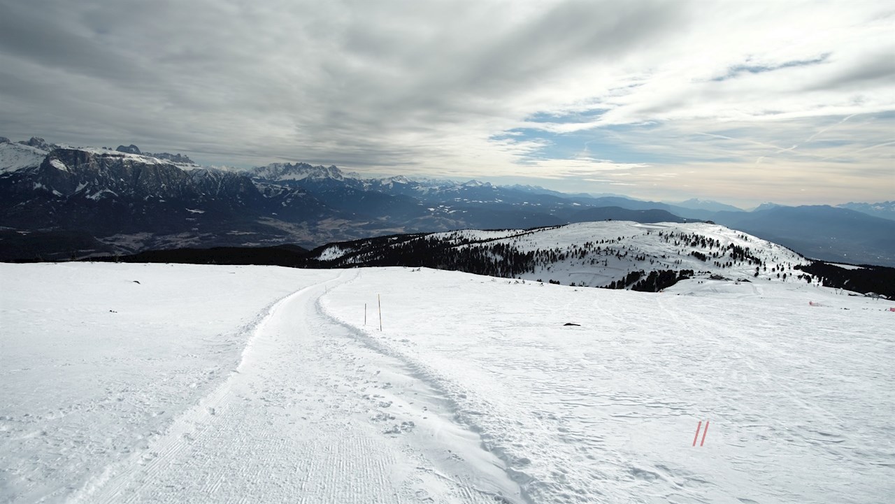 Links des Unterhornhauses steigt der Winter-Premium-Weg im nunmehr etwas steileren Anstieg auf das Rittner Horn an. Dieser Hausberg der Landeshauptstadt Bozen dient den Meteorologen nicht nur als Messstation, sondern eröffnet auch ein weitreichendes Panorama: Der Blick schweift vom Alpenhauptkamm über die Dolomiten, die Ortler-, Brenta- und Adamellogruppe.