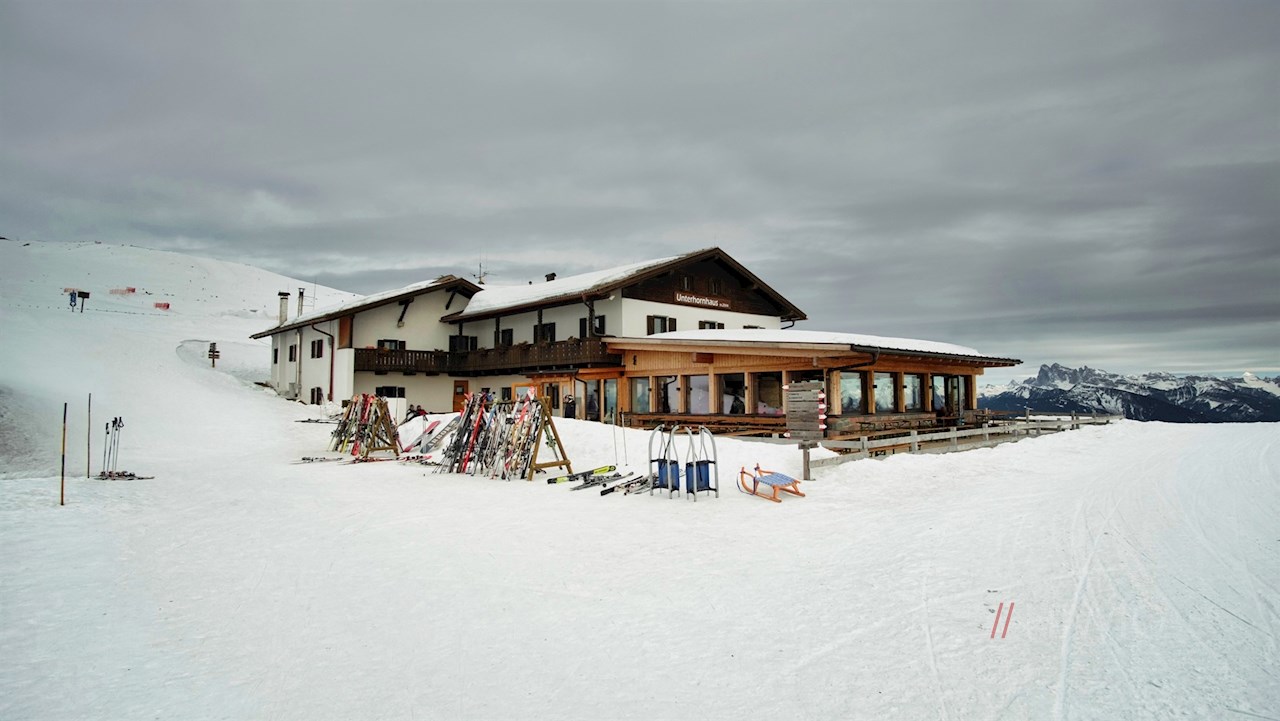 Vor dieser traumverlorenen Kulisse steigt der Weg sanft zum Unterhornhaus an. Am Fuße des Rittner Horns verlockt es zu einer kleinen Zwischenrast auf 2.042 m Höhe.