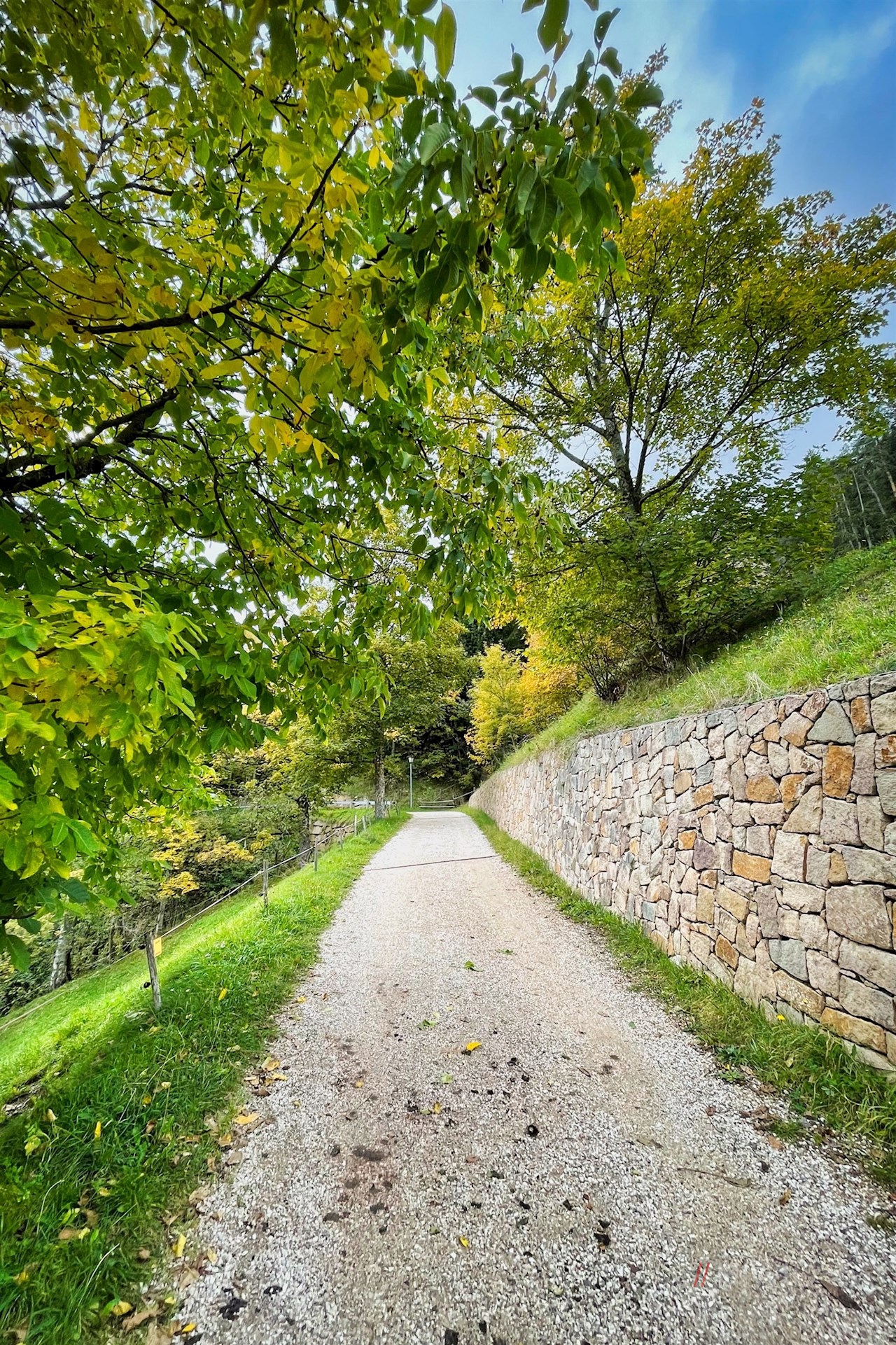 Er zweigt nach wenigen Schritten rechts ab und steigt entlang eines glucksenden Bächleins zum oberen Dorfrand an.