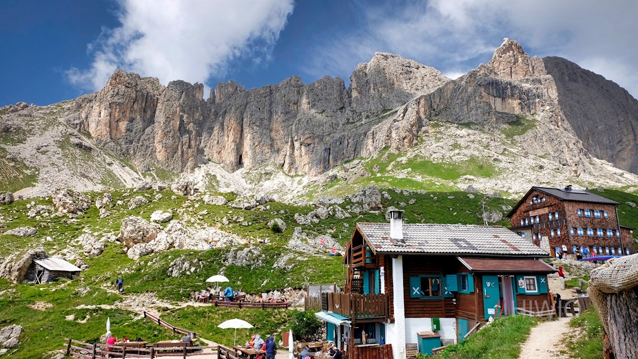 Am Christomannos Denkmal zweigt der nahezu ebene Steig Nr. 549 zur nunmehr nahen Rotwandhütte ab. Nach insgesamt 50 Minuten sanften Wanderns laden die schindelgedeckte Hütte und die etwas kleinere Pederiva Hütte am Fuße der Rotwand zur genussreichen Einkehr.