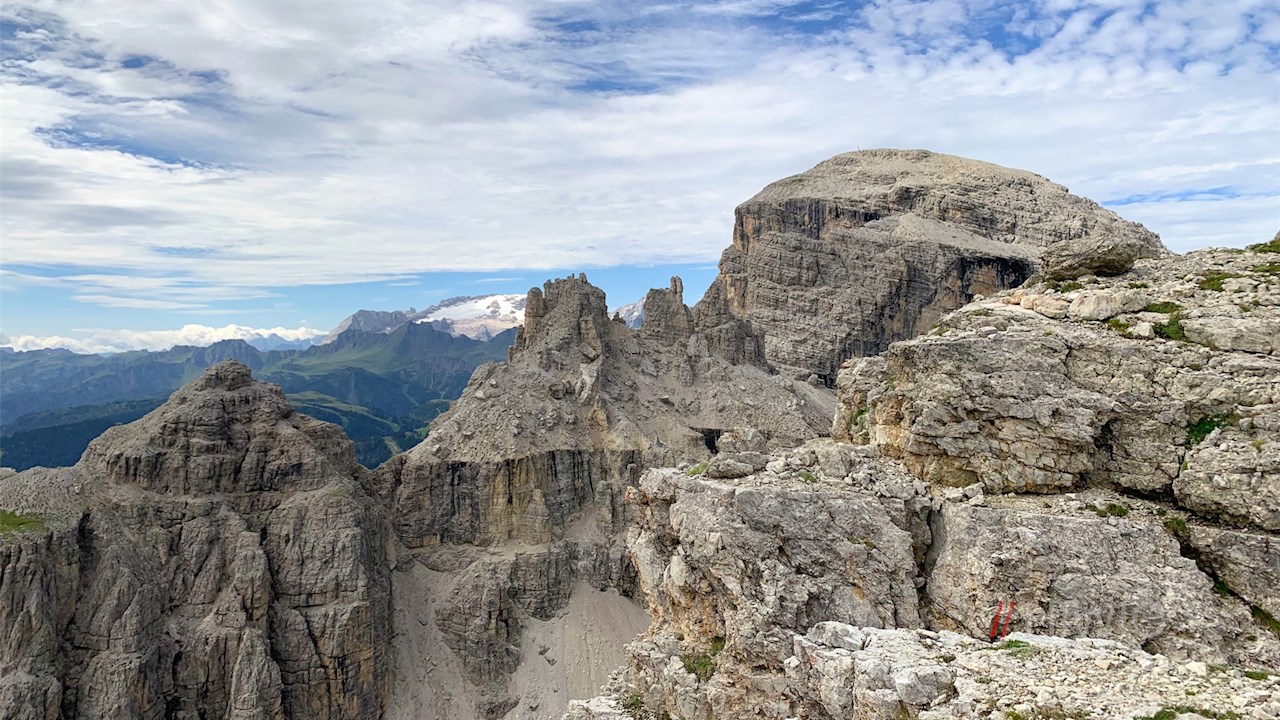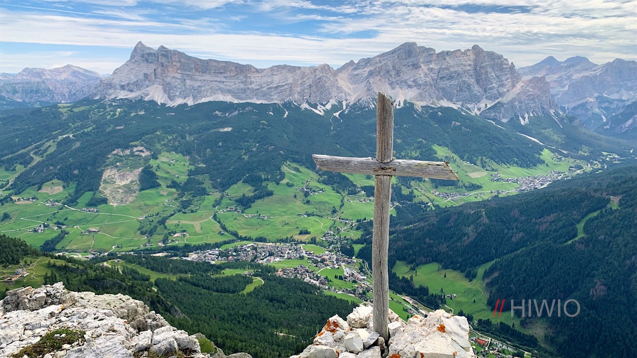 Schließlich weist am linken Wegesrand ein Schild den nunmehr kurzen Weg auf den Para dai Giai. Er führt durch Karstwiesen, über ein kleines Felsband und eine seilgesicherte Felsstufe zum Gipfelkreuz des Para dai Giai, neben dem sich ein atemberaubender Ausblick entfaltet: Der Blick wandert von den in der Ferne aufragenden Ahrntaler Berggipfeln zu nahen Dolomitgipfeln, von denen der Heiligkreuzkofel, die Lavarella, der Conturines, der Lagazuoi, der Settsass, die schneebedeckte Marmolata und der Sassongher wohl am meisten ins Auge stechen. Uns zu Füßen liegen indes Stern (La Ila) und St. Kassian.