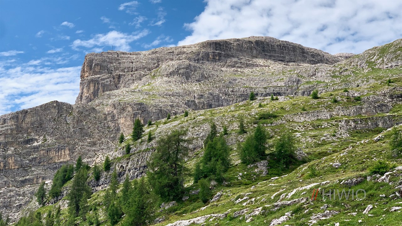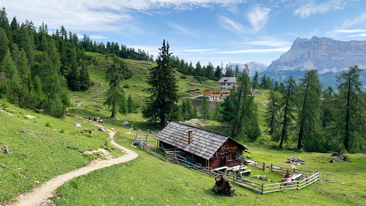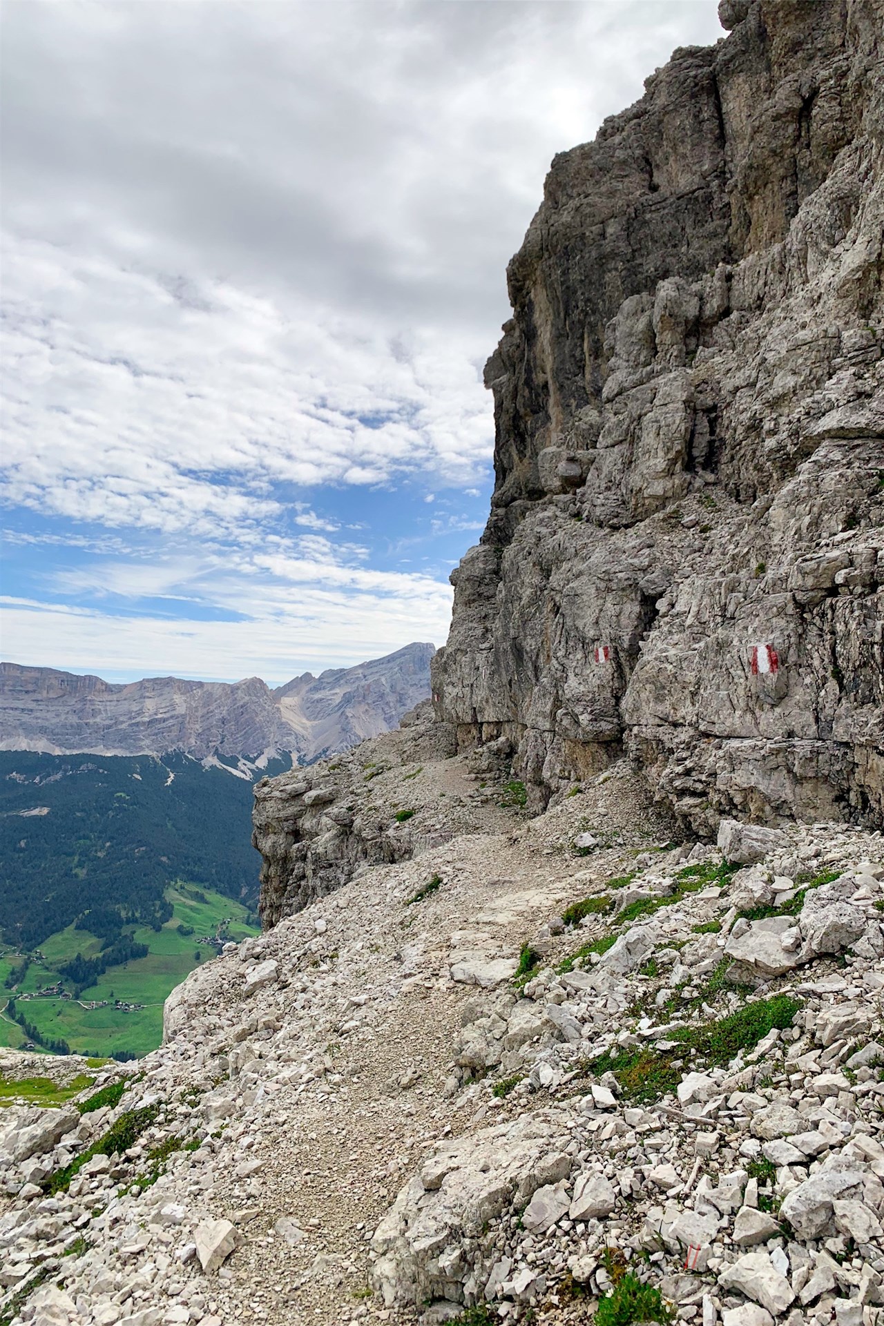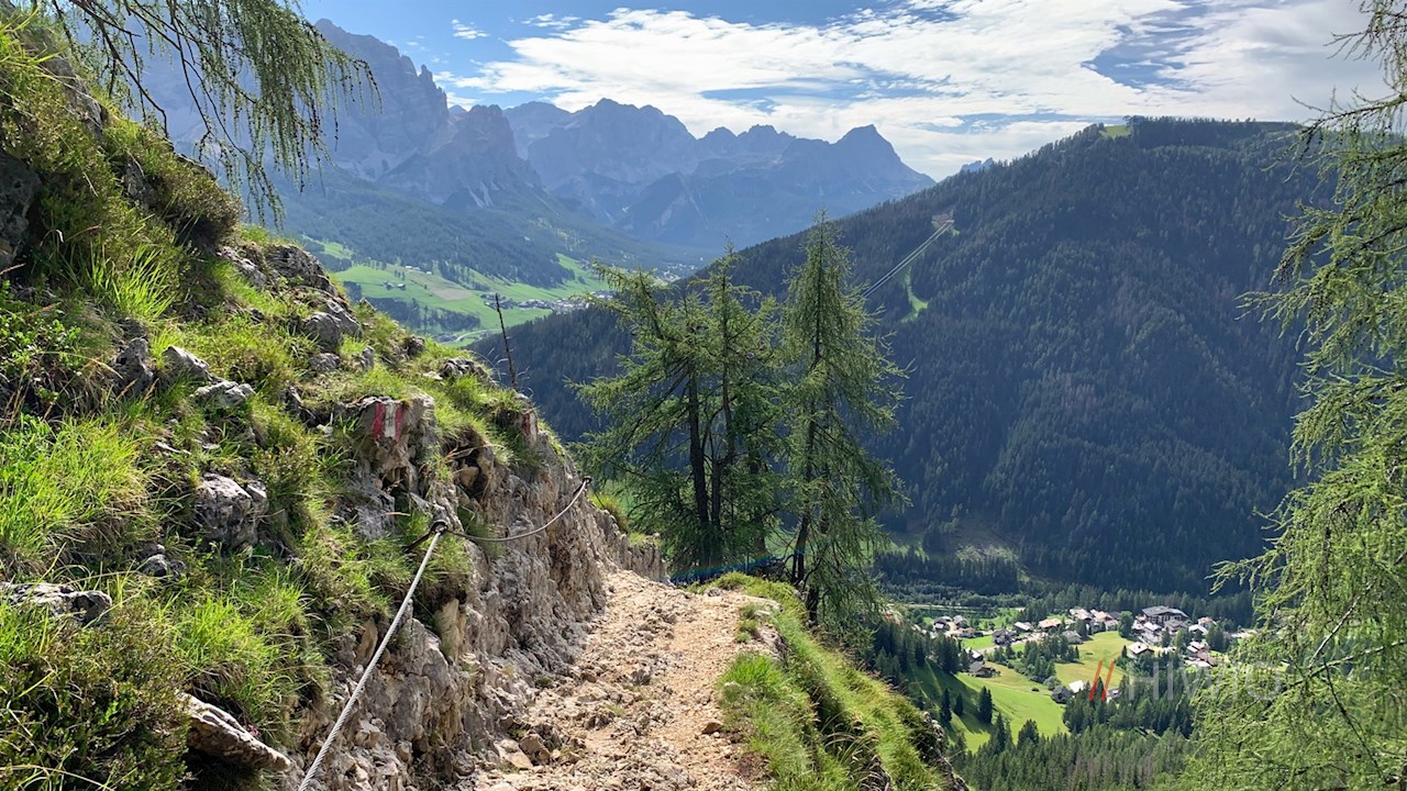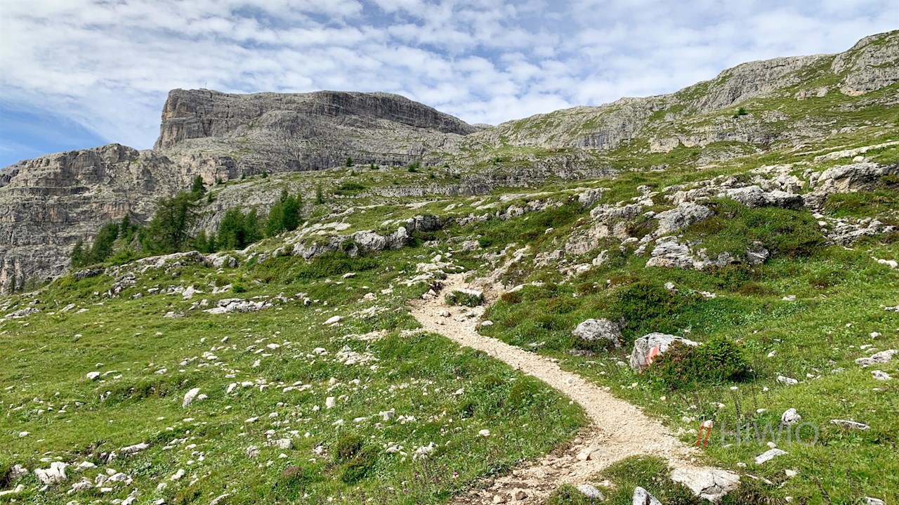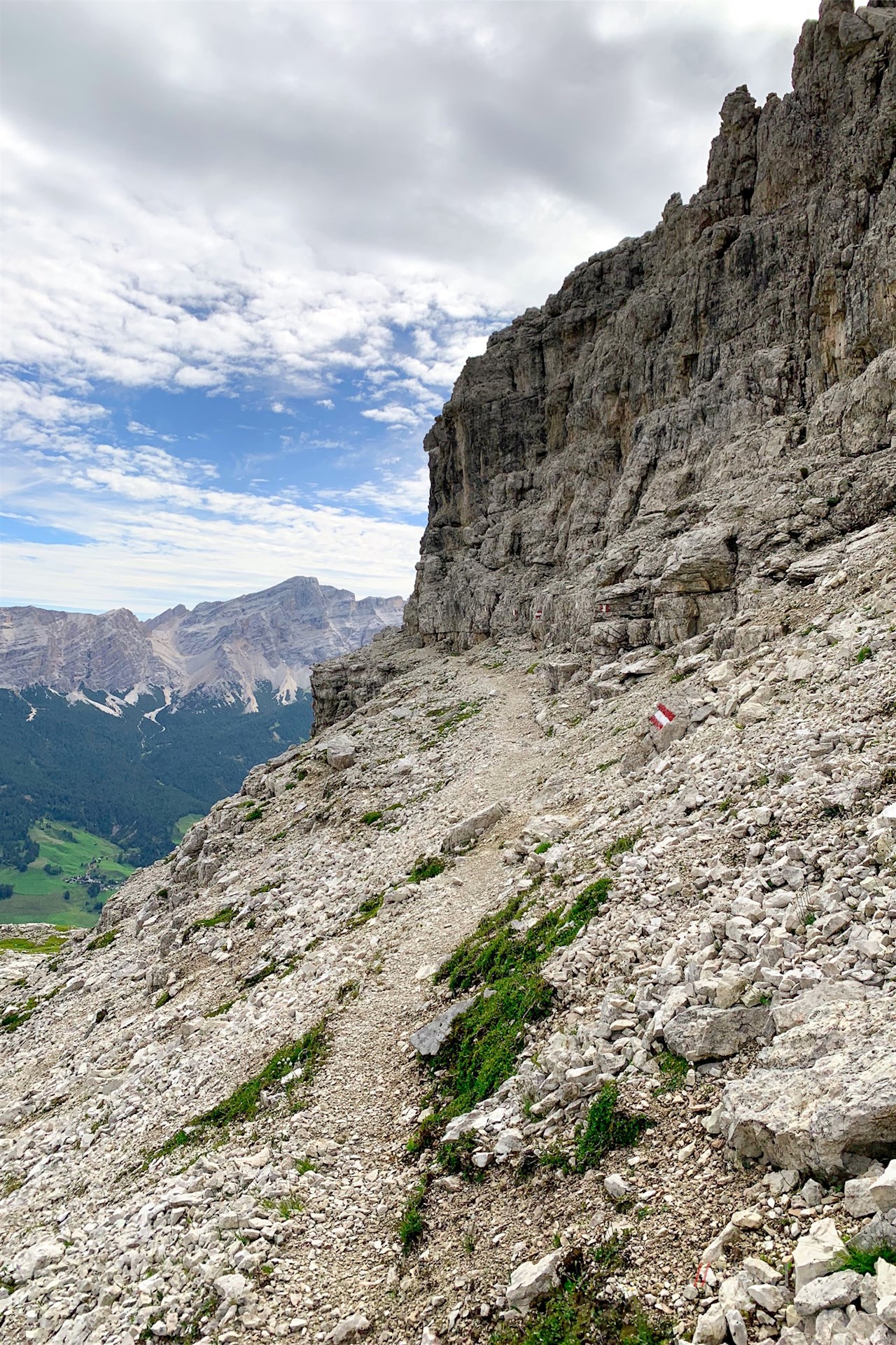 Mit Blick auf die senkrechten Felsabstürze des Para dai Giai und den dahinter aufragenden Sassongher bahnt sie sich ihren Weg durch weite, teils felsdurchsetzte Bergwiesen, in denen sich bereits schöne Ausblicke auf die umliegenden Dolomiten öffnen.