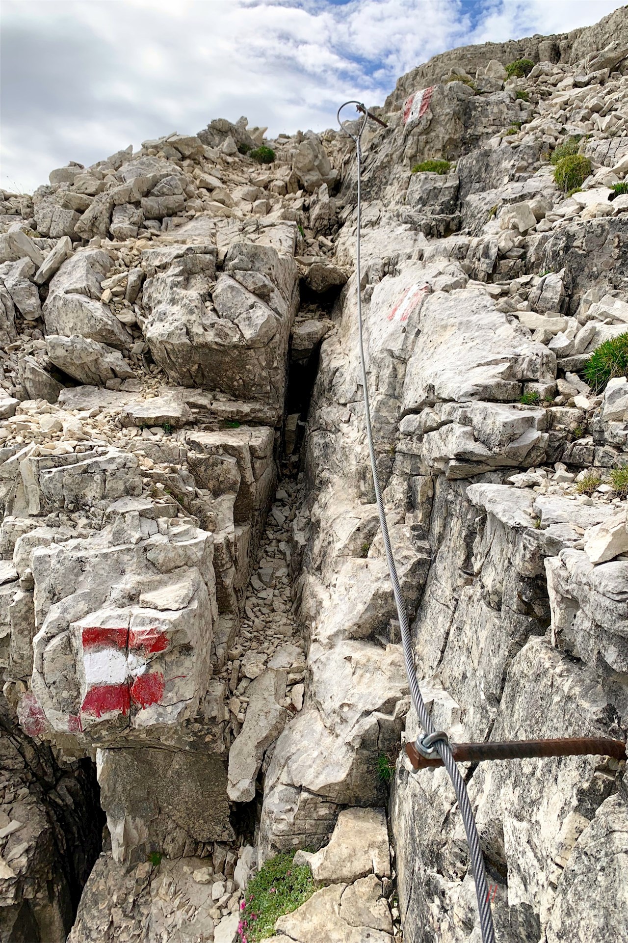Zunehmend steiler und karger werdend, überwindet der Steig schließlich eine leicht zu meisternde seilgesicherte Passage und steigt zuletzt serpentinenförmig durch eine kleine Scharte zur Gardenacia Hütte an.