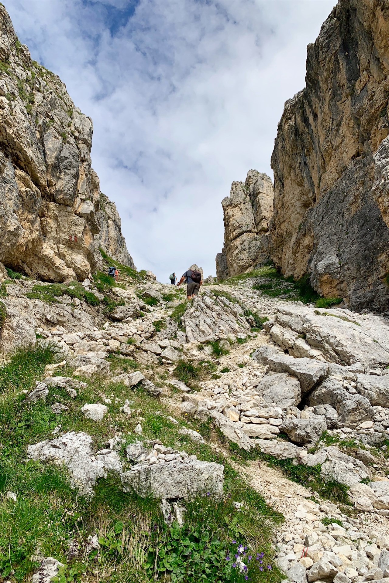 Der Abstieg vom Para dai Giai erfolgt zunächst auf dem bereits vertrauten Hinweg. Bei der Gardenacia Hütte schlagen wir diesmal aber den Weg Nr. 5 ein, der in zahlreichen Serpentinen zur Sponata Hütte abfällt und dort in den Steig Nr. 5A übergeht.