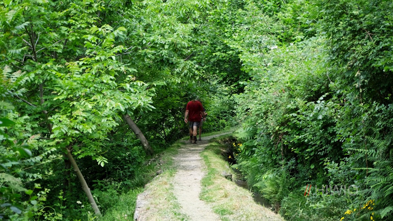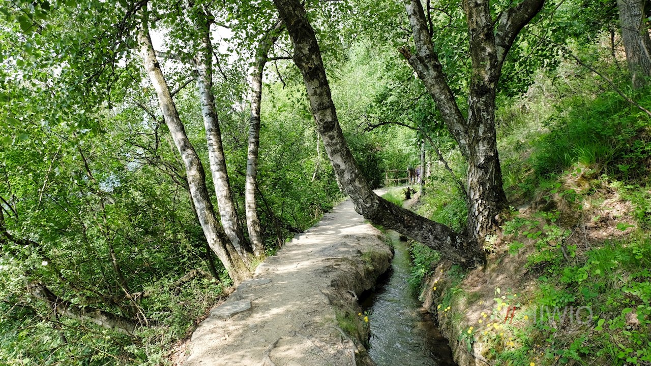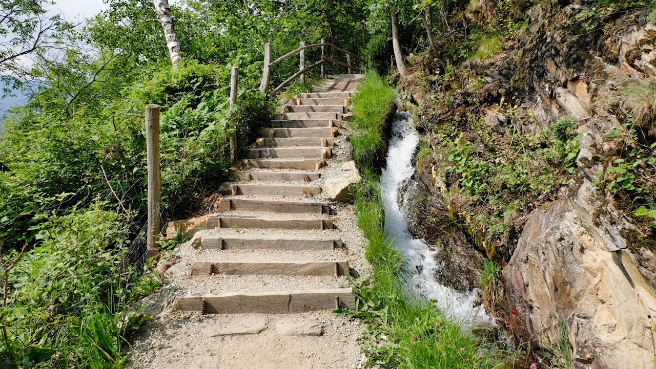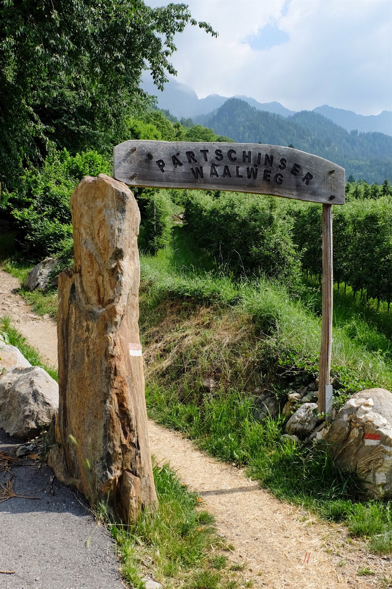 Nach einer guten Viertelstunde vernimmt man bereits das fröhliche Plätschern des Waals, der noch heute die umliegenden Obstwiesen mit Wasser versorgt. Für seine Instandhaltung wurde einst ein nahezu eben verlaufender Waalweg angelegt, der heute gerne erwandert wird.