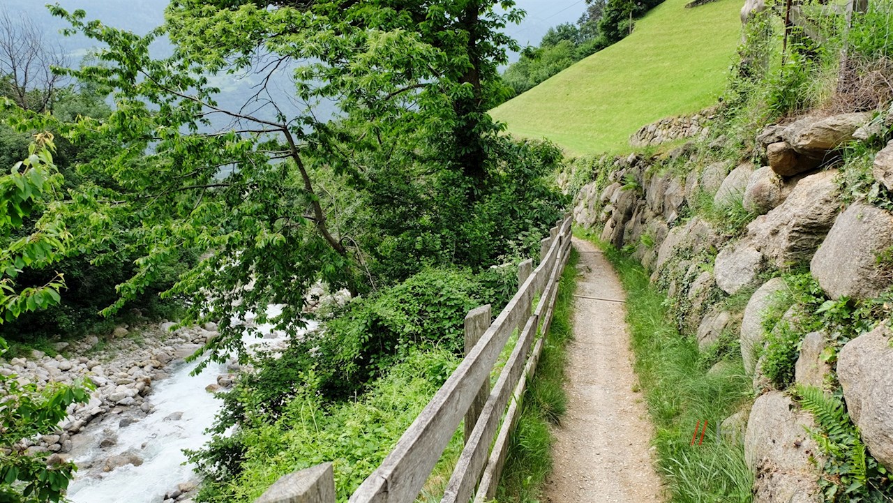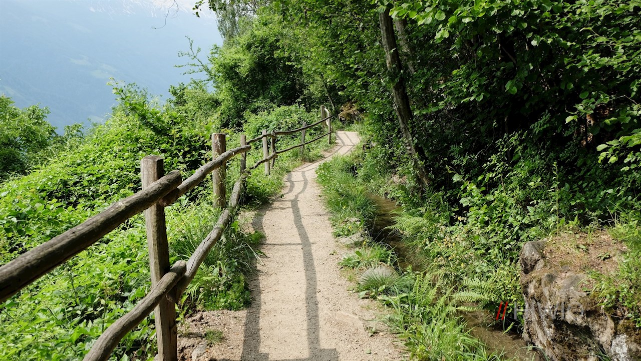 Über dem beschaulichen Dorf Partschins westlich von Meran quert der nahezu eben verlaufende Partschinser Waalweg die malerischen Hänge. Sein munter vor sich hin plätschernder Waal verheißt auch an heißen Tagen Abkühlung.