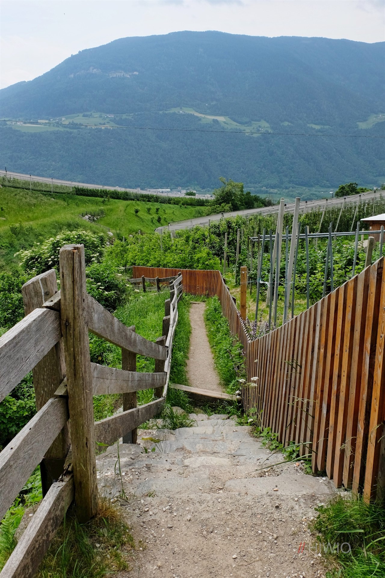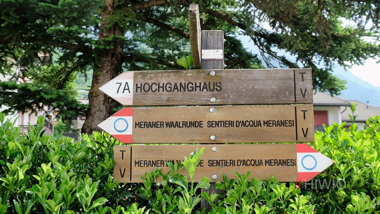 Der Beschilderung Meraner Waalrunde bzw. Partschinser Waalweg folgend, wandert man zunächst die recht steil ansteigende Asphaltstraße zum eigentlichen Beginn des Waalweges hoch.