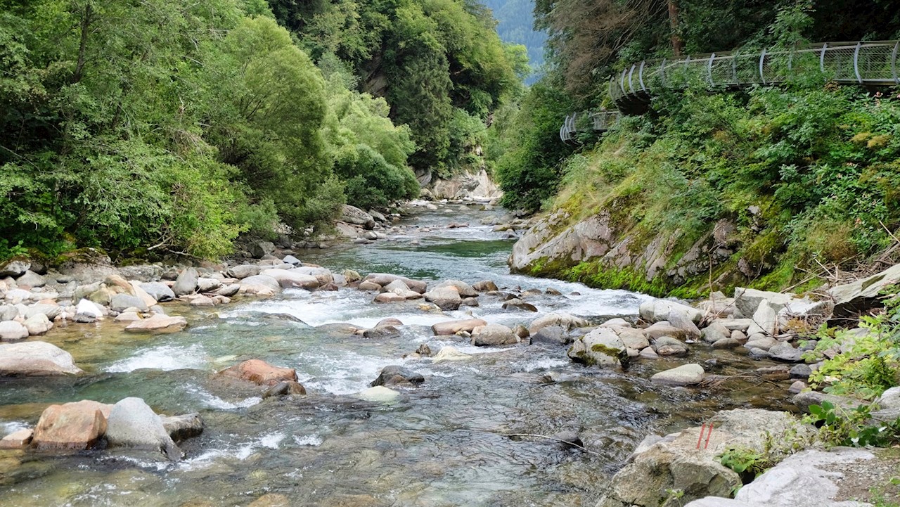 Von hier zieht sich der breite Wanderweg Nr. 1 nahezu eben die rauschende Passer entlang. Nach etwa einer halben Stunde sanften Spazierens überquert man unterhalb des Weilers Gomion eine Brücke und gelangt so zum eigentlichen Beginn der Passerschlucht auf der gegenüberliegenden Flussseite.