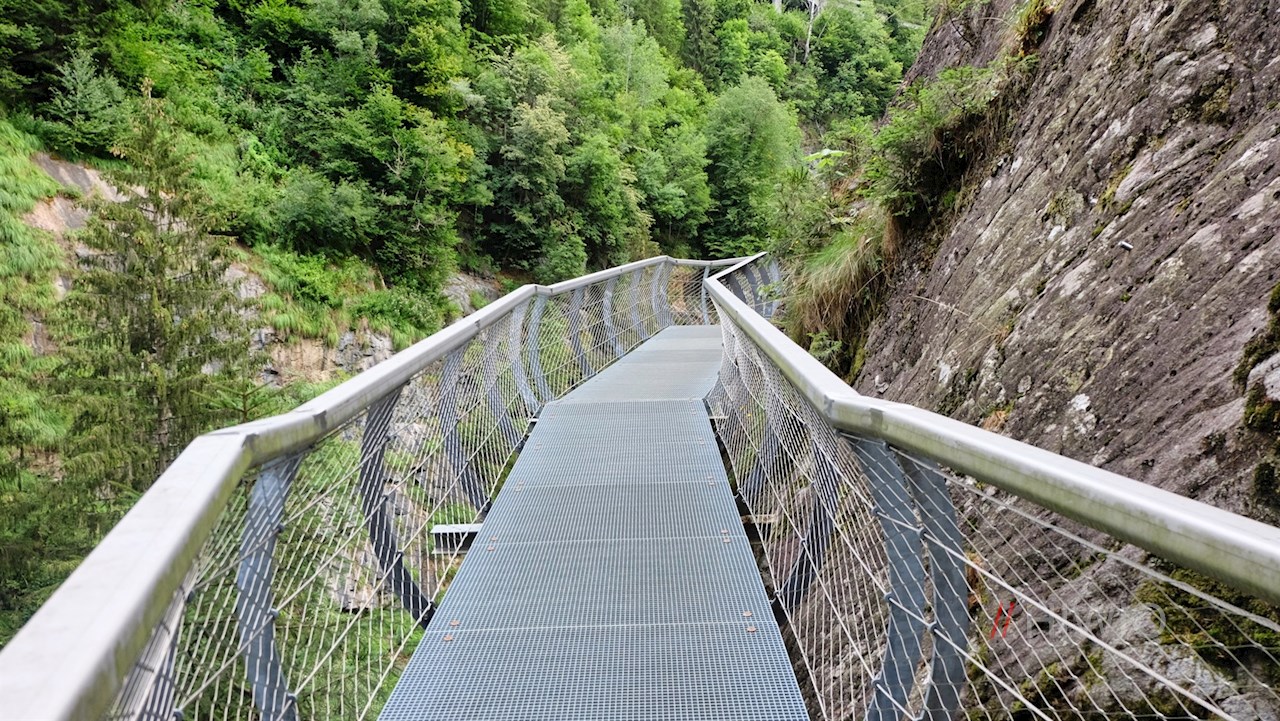 Er führt in unmittelbarer Nähe der Passer im sanften Auf und Ab durch wurzelbeschlagene Waldstücke und sanfte Wiesen. Einige Abschnitte sind bereits mit den markanten Gitterrosten aus Stahl gesichert, die den Passerschluchtenweg prägen.