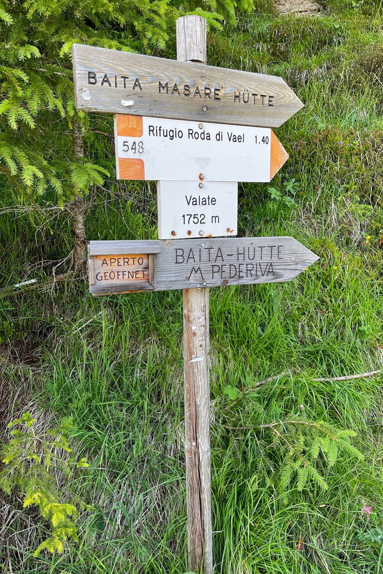 Hinter dem Hotel Savoy zweigt der anfangs asphaltierte Weg Nr. 548 in Richtung Rotwandhütte (Roda di Vael) ab. Wenig später geht er in einen breiten, stetig ansteigenden Wald- und Wiesenweg über, der in der warmen Jahreszeit von einer bunten Vielfalt leuchtender Blumen umrahmt wird. Zu ihnen zählen beispielsweise das zarte Knabenkraut, die elegante Türkenbuntlilie oder die markante, auch als Dolomit-Nelke bekannte Sternbergs Nelke.