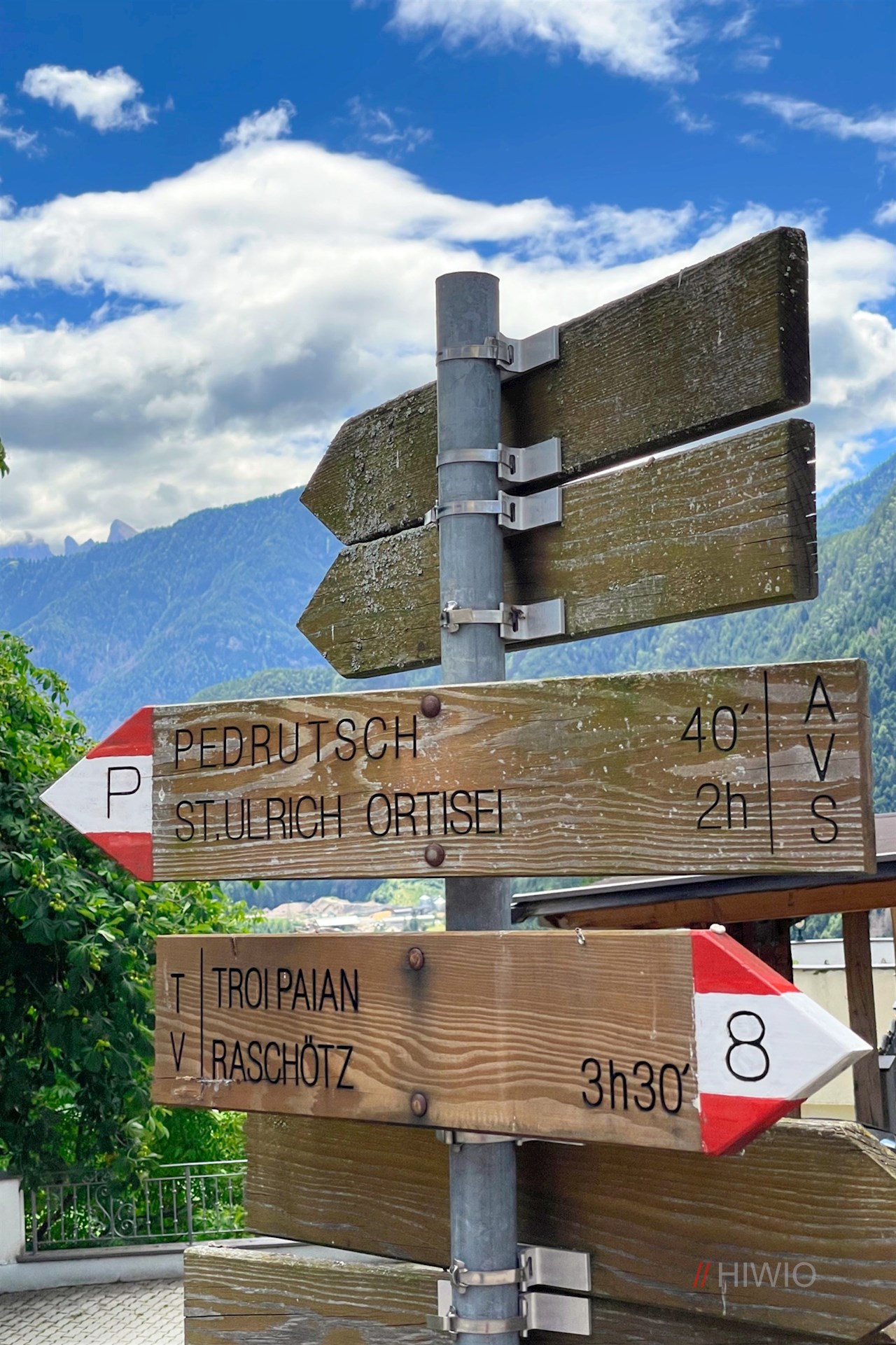 Er folgt dem beliebten, mit einem P markierten Poststeig, der sich im sanften Auf und Ab durch blumenfrohe Wiesen und lichte Waldstücke schlängelt und dabei schöne Ausblicke auf St. Peter, die nahe Raschötz, den Puflatsch und die dahinter aufragenden Felsen des Lang- und Plattkofel freigibt.