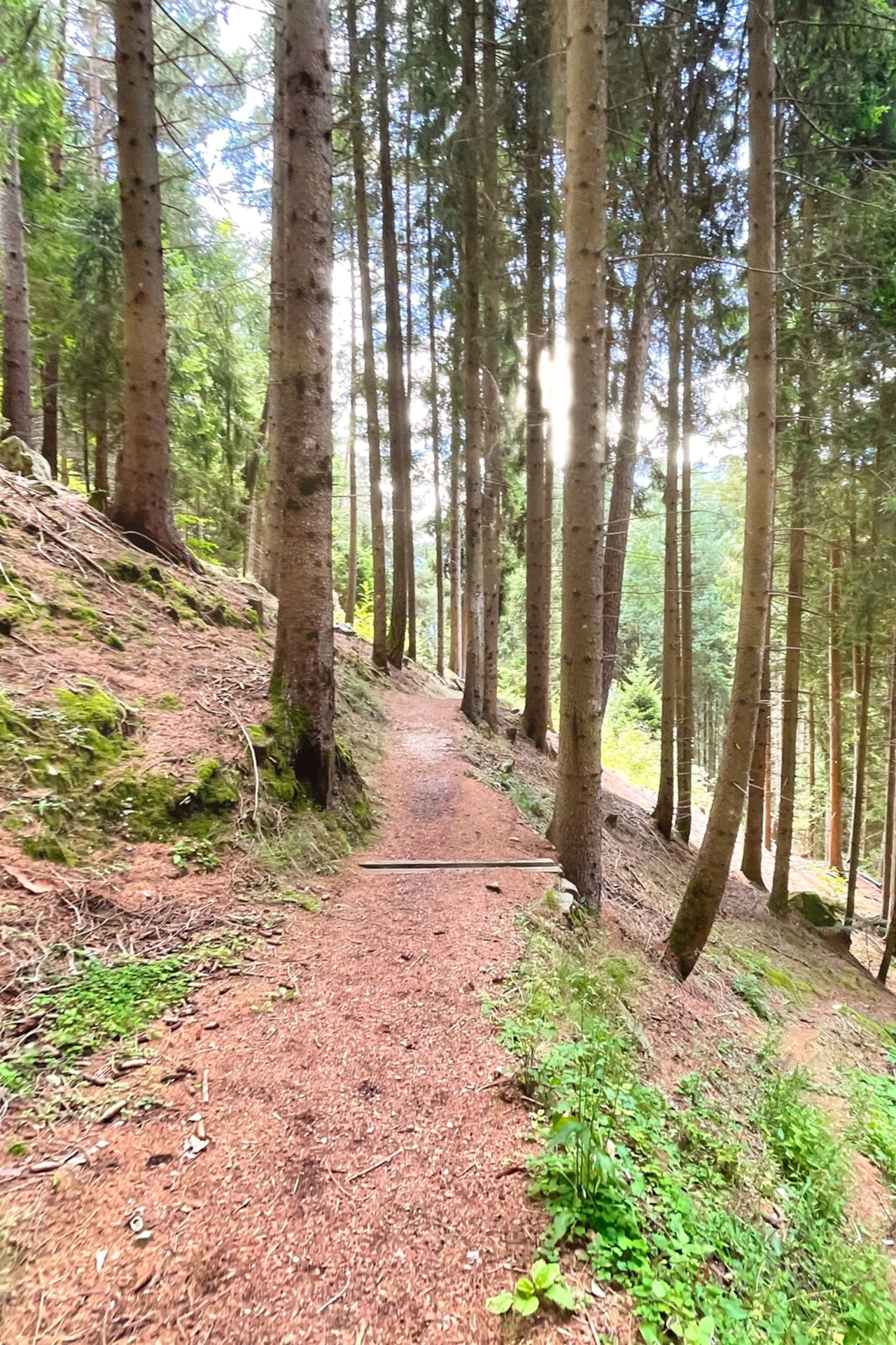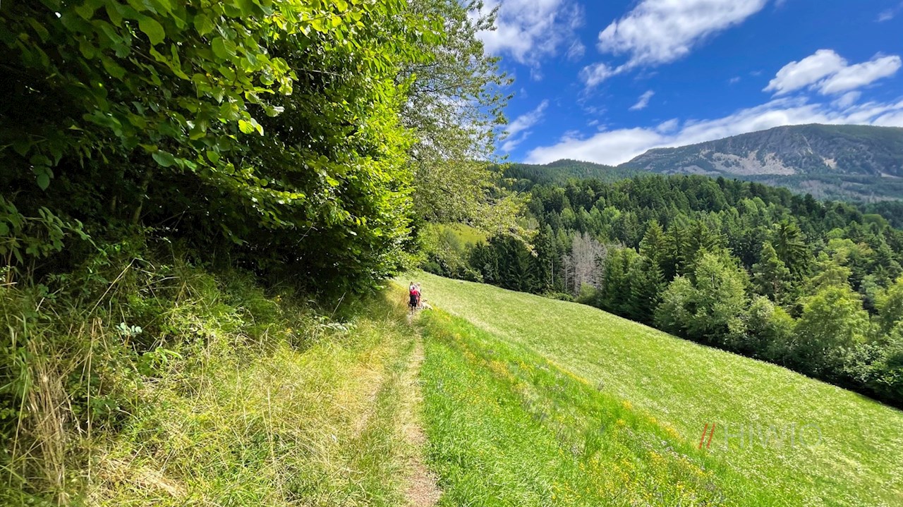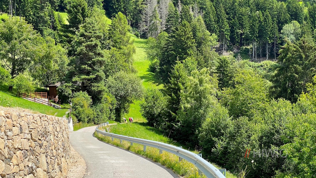 Schließlich mündet der Poststeig in eine kleine, wenig befahrene Straße, von der er nach wenigen Minuten rechts abzweigt. Nun ist der idyllische, inmitten einer aussichtsreichen Wiese gelegene Pedrutscherhof nicht mehr fern.