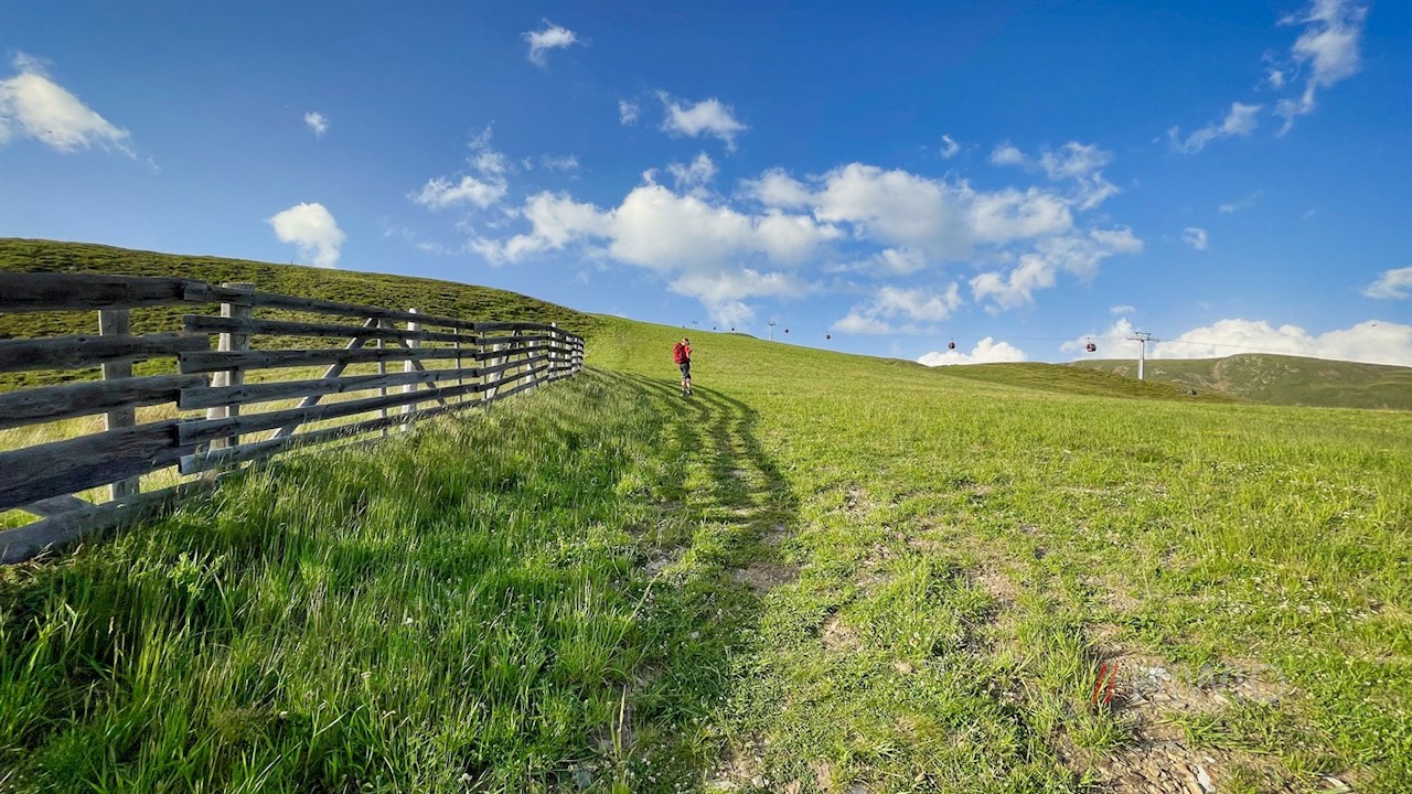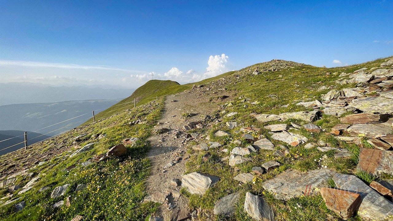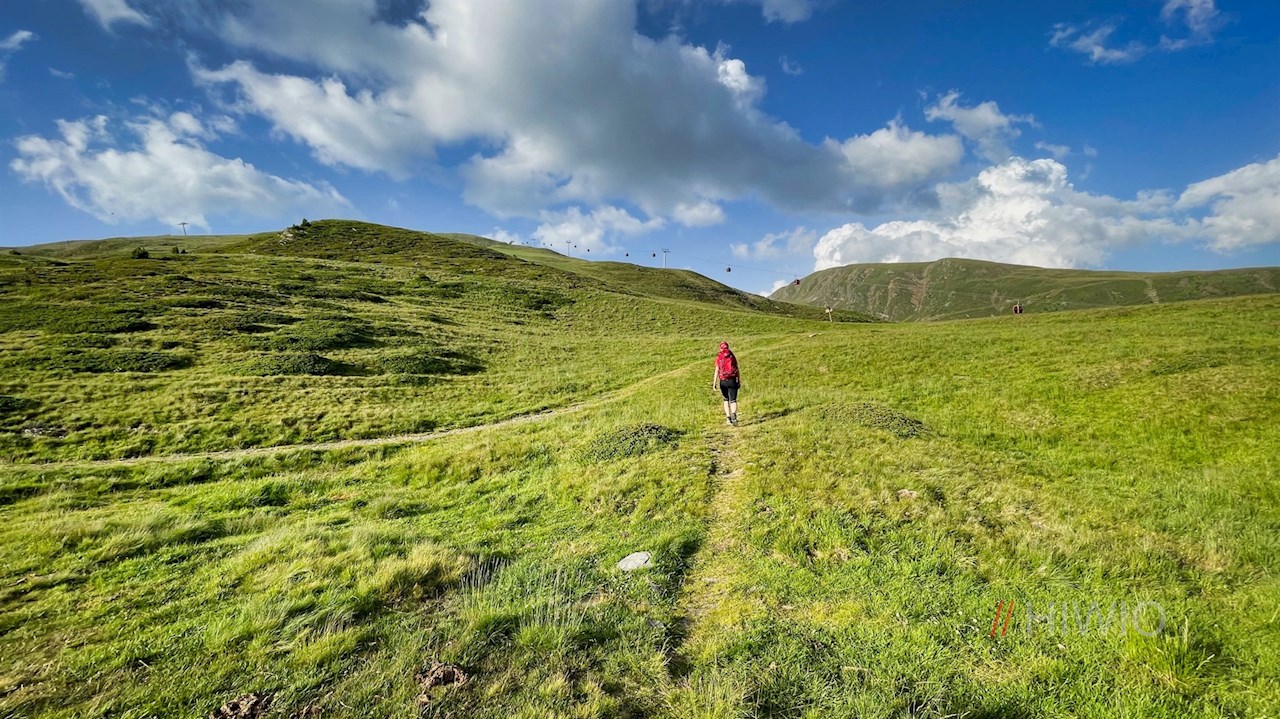 Rechts der Rossalm setzt sich der nicht ausgeschilderte, aber gut ausgetretene Wiesensteig Nr. 6 in Richtung Pfannspitz fort. Parallel zur Pfannspitz Kabinenbahn steigt er vor verträumter Bergkulisse zur Lüsner Scharte neben der Plosehütte an.