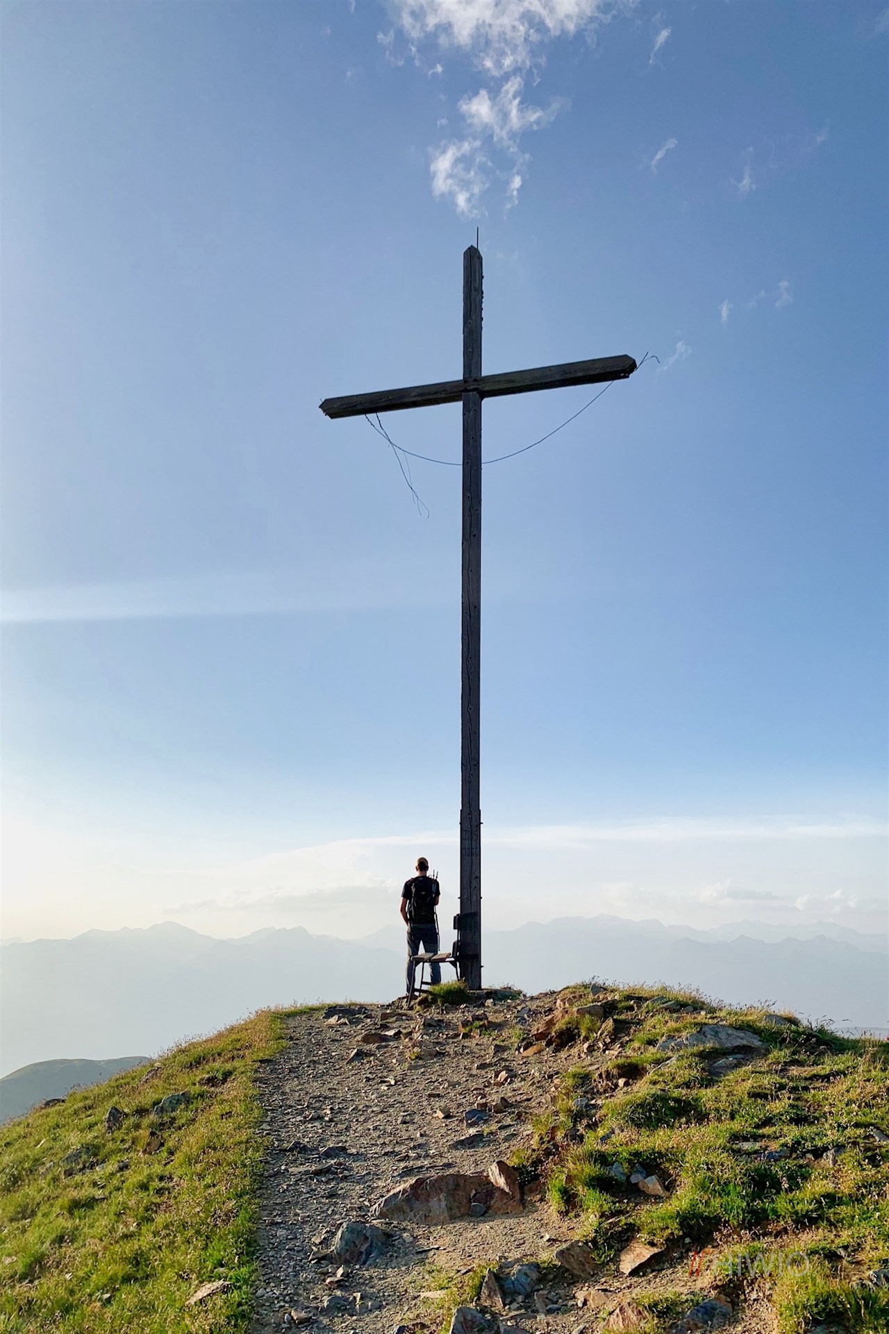 Auf der 2.375 m hohen Scharte geht er in den Weg Nr. 7 über. Er führt im teils steilen Anstieg zum bereits sichtbaren Gipfelkreuz des Pfannspitz, neben dem sich ein atemberaubendes Panorama entfaltet. Namentlich das nahe Leonharder Kreuz, die Rodenecker Alm, der Gabler, der Peitlerkofel und die Geisler, unsere ständigen Wegbegleiter, stechen ins Auge. Eine Aussichtsbank lädt zum Genießen dieser verträumten Idylle ein.