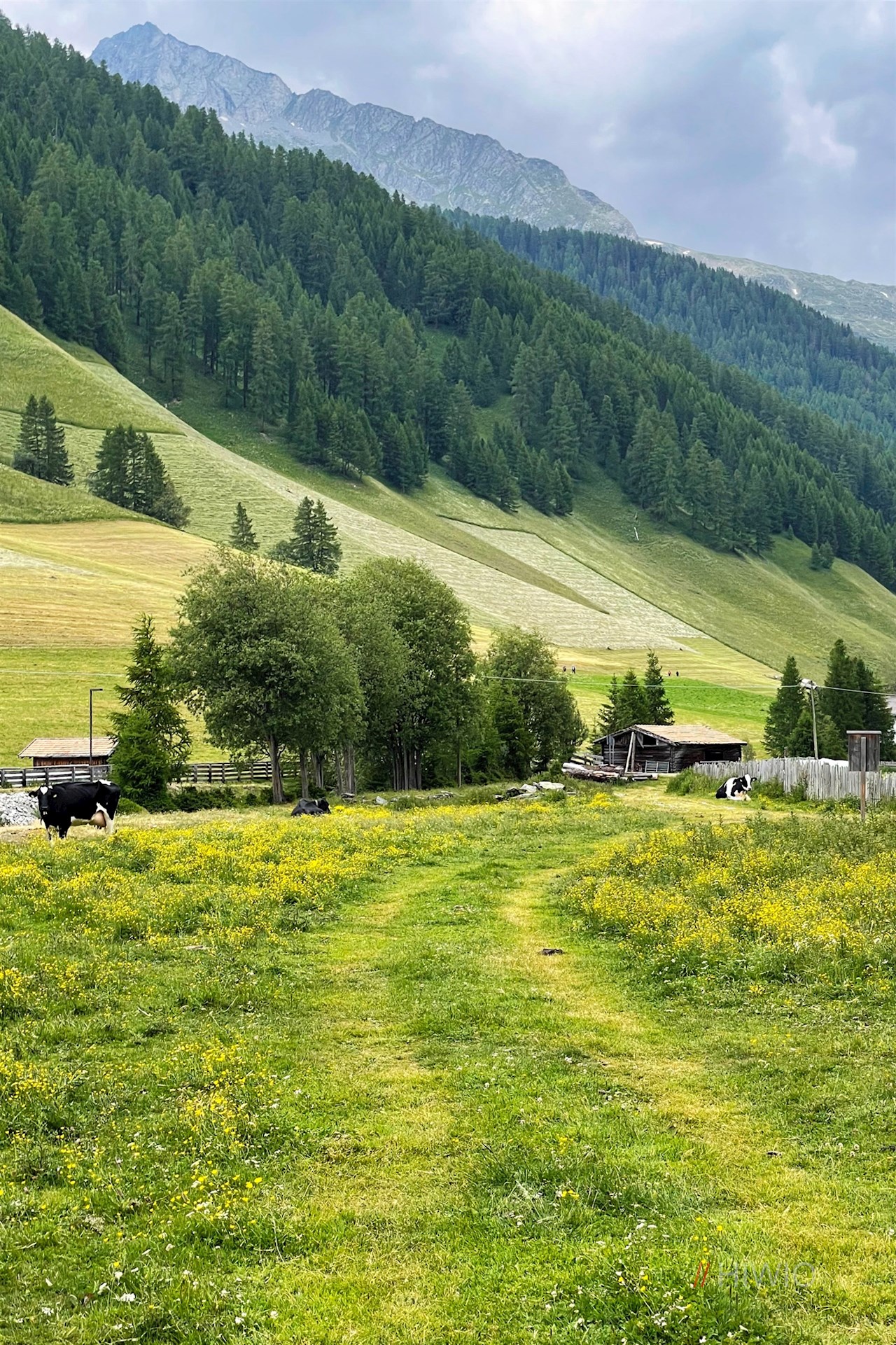 Hinter dem lauschigen Biotop folgt der Hintertalweg kurz der Straße, von der er kurz darauf wieder rechts abzweigt und sich durch Wald und Weidewiesen dem Wasserfall nähert.