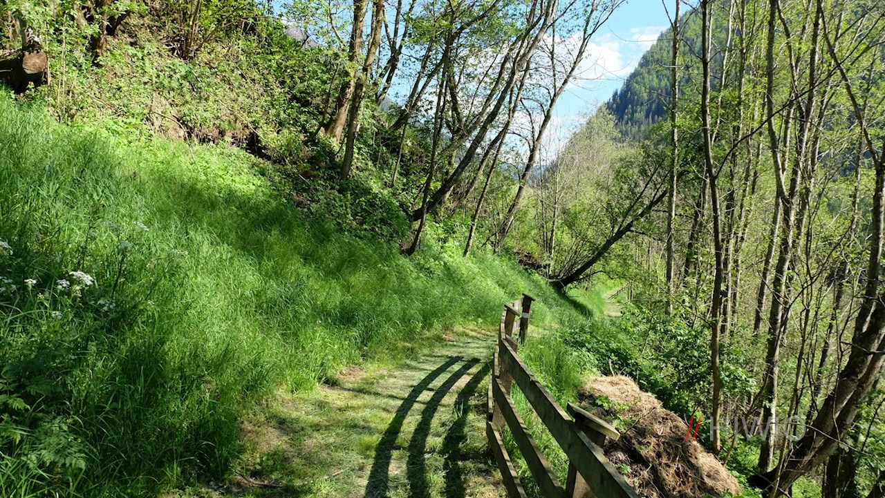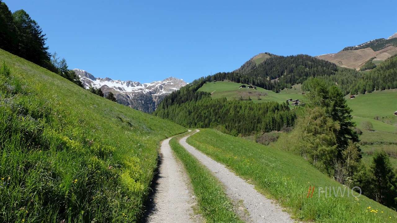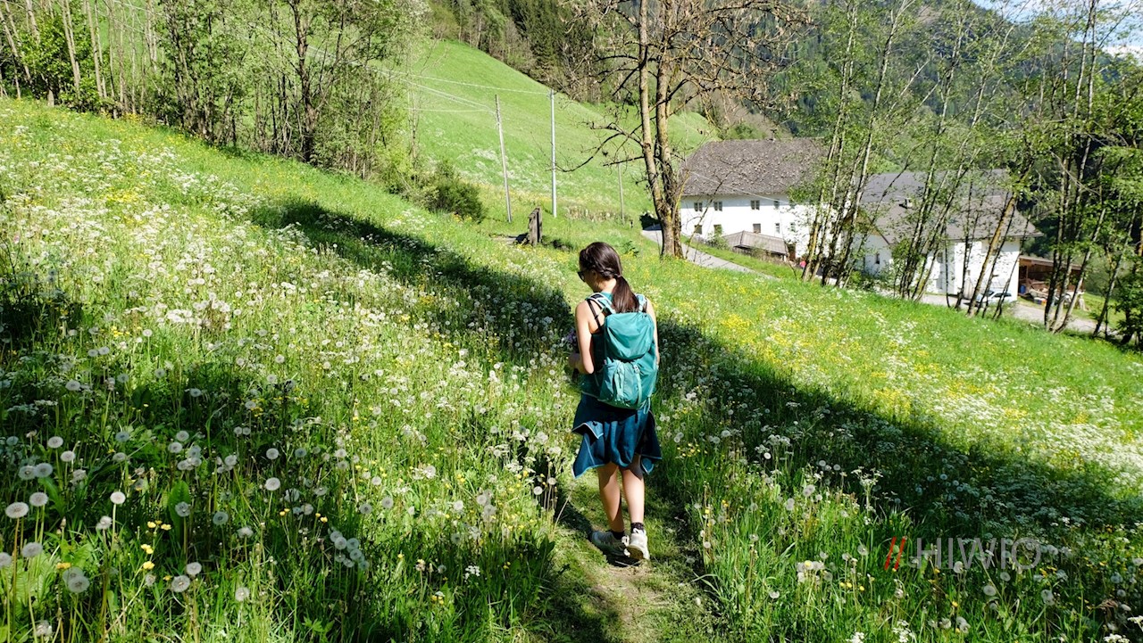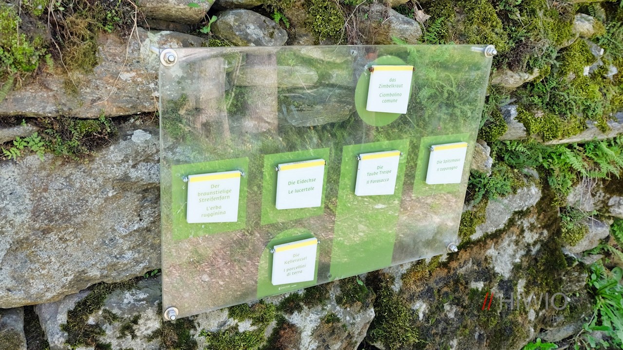 Nach der Überquerung der Brücke wandert man zunächst im Schatten der Bäume und später durch blühende Wiesen von Hof zu Hof. Dabei kommt man unter anderem an einem Wasserspiel am Pfunderer Bach und an einem „Mauerhotel“ vorbei, das zahlreichen Kleintieren und Pflanzen Unterschlupf gewährt.