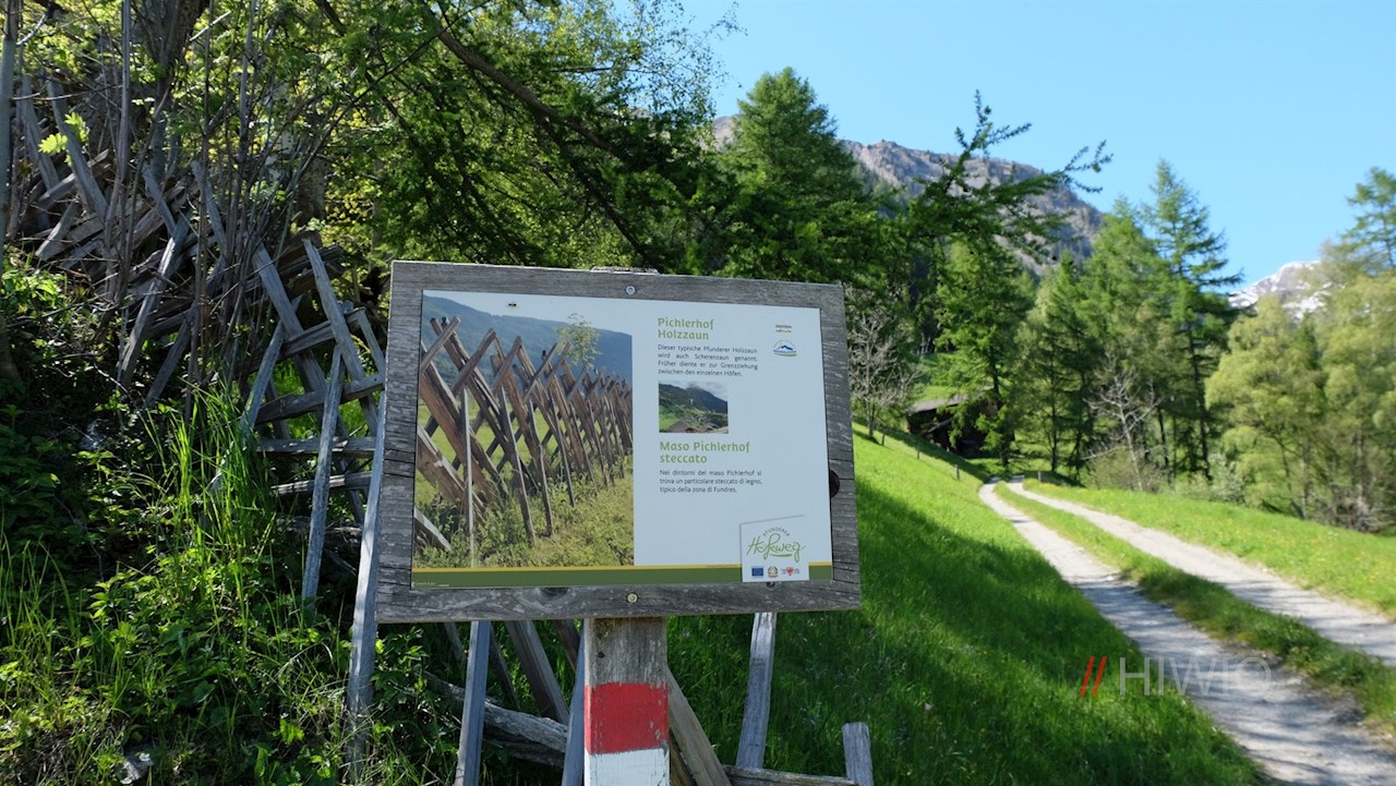 Hinter dem Pichlerhof stößt man später auf einen jener charakteristischen Pfunderer Zäune, die einst die Grenze zwischen den Höfen markierten: einen sog. „Scherenzaun“. Außerdem erschließt sich auf der nahen Aussichtplattform ein malerischer Ausblick auf das abgeschiedene Pfunderer Tal und die umliegende Bergwelt mit der markanten Eidechsspitze.
