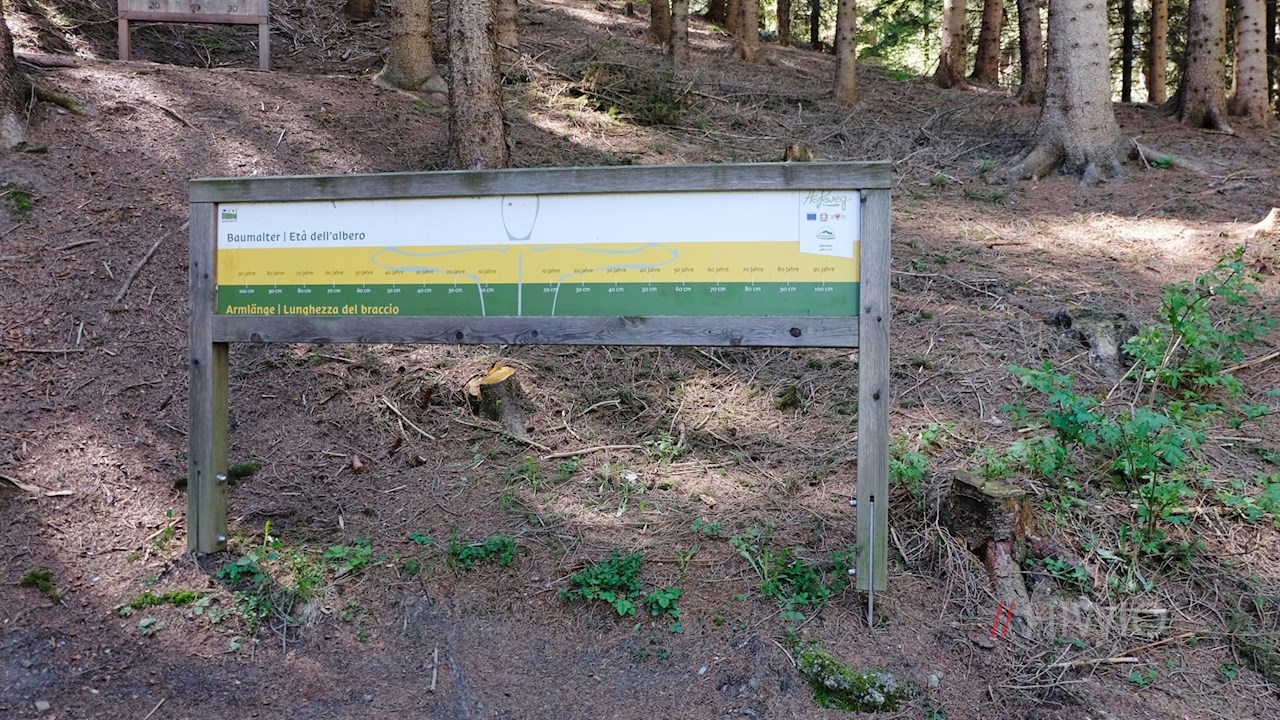 Hinter der Aussichtsplattform taucht der Pfunderer Höfeweg alsbald wieder in einen schattenverheißenden Nadelwald ein, in dem diverse Stationen zum Spielen und interaktiven Lernen anregen.