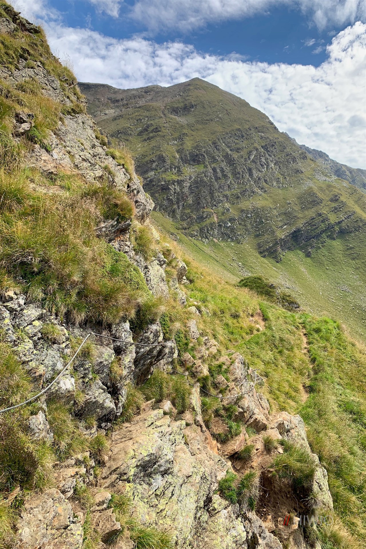 Nach knapp zwei Stunden steten Wanderns verlockt die urige Aglsalm zur ersten Zwischenrast, bevor sich der Anstieg über die teils steil abfallenden Bergwiesenhänge fortsetzt. Ein Halteseil hilft über eine ausgesetzte Felspassage, die für berggewohnte Wanderer kein Problem darstellen dürfte.