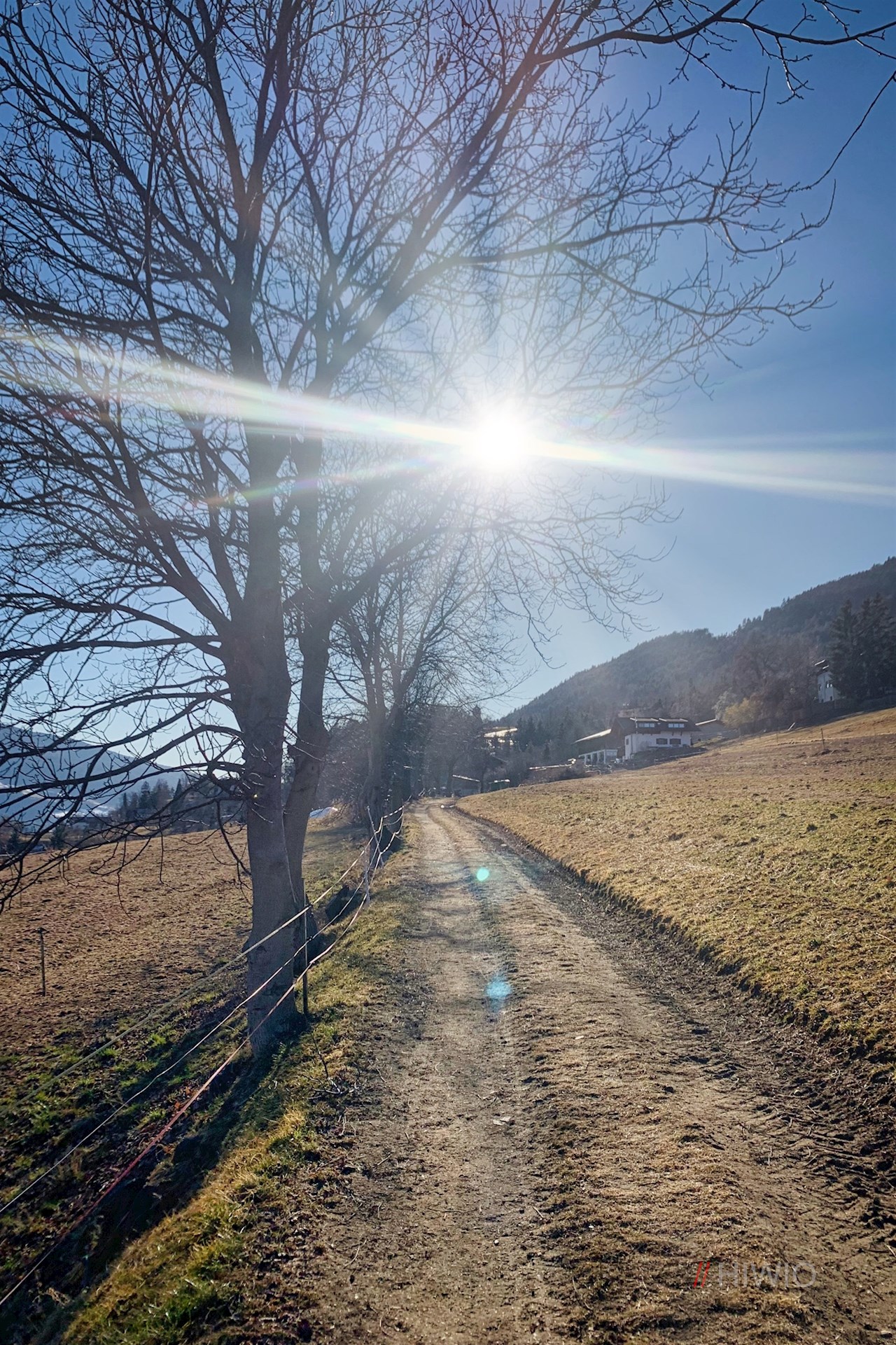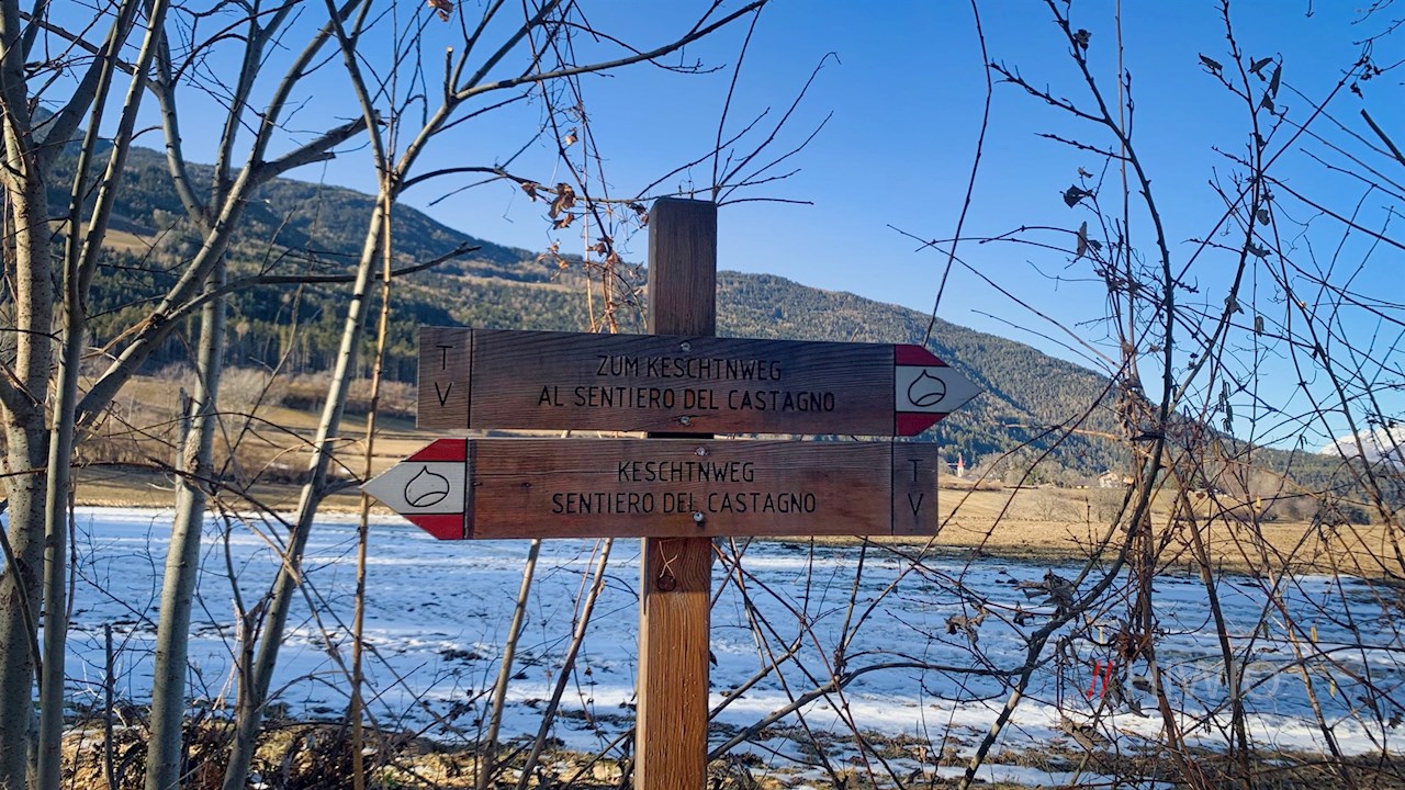 Vor der Kulisse der gegenüberliegenden Bergwelt führt die Wanderung auf dem südlich führenden Keschtnweg zunächst durch baumbestandene Wiesen und Felder.